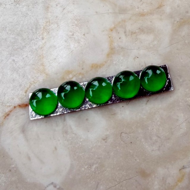 太陽の下で見ると、まるで発光しているかの様な美しさに輝く翡翠です。 山椒は小粒でもピリリと辛い。 この0.754ctの美しい緑の石を食べ物にして表現したかの様な言葉です。出張先で刺すような濃い緑の翡翠を使った指輪を見つけた時にはドキドキする様な感動がおきました。 先月仕事で香港を訪れる機会があり、信じられない量のジュエリーを浴びる様に見る機会がありました。そんな中で訪れたジュエリー会社で出会った小粒の翡翠を使ったリングに惹かれ、サンプルとして購入。ダメもとでルースの購入を打診したところ、すでにジュエリー制作用として検査済みのカボションの石を横取りする様に購入して来ました。 翡翠の中でも特に美しいとされる「琅玕(ろうかん)」は、しっとりとした透明感と、奥深い緑色が魅力の特別な翡翠です。その美しさは古来より「玉の中の玉」と称えられ、見る人の心をとらえて離しません。その中でも 0.754ctとセンターストーンにするのにも存在感のある綺麗な石です。 天然の美しさを、どうぞご堪能ください。ダイヤモンドと並べてリングにしたりジュエリーに使ったり真珠と使ったり組み合わせの妄想も無限に広がる美しく高級感のある瑞々しい高品質のルースです。 販売は 0.754ct 直径 約 5.90mm×5.80mm の天然翡翠 1ピースの販売です。 在庫番号 FC23714066