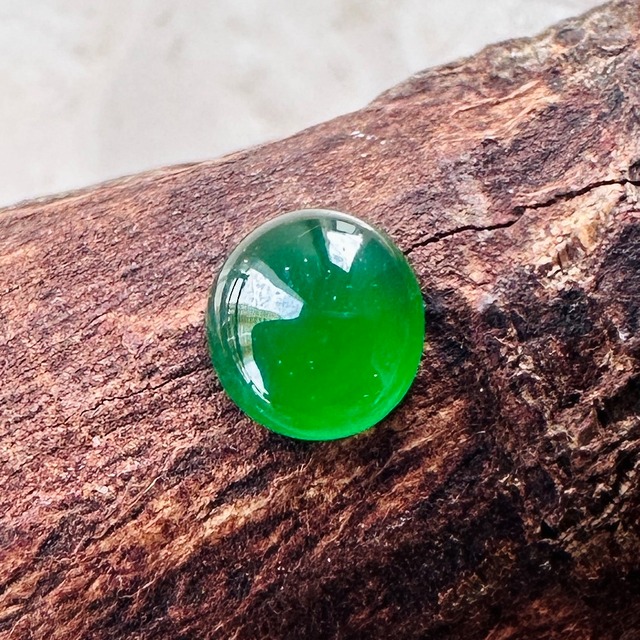 美しい琅玕翡翠でゼリー菓子の様な水分をたっぷりと含んだ様な瑞々しい輝きと艶のある石です。 山椒は小粒でもピリリと辛い。 この0.335ctの美しい緑の石を食べ物にして表現したかの様な言葉です。出張先で刺すような濃い緑の翡翠を使った指輪を見つけた時にはドキドキする様な感動がおきました。 先月仕事で香港を訪れる機会があり、信じられない量のジュエリーを浴びる様に見る機会がありました。そんな中で訪れたジュエリー会社で出会った小粒の翡翠を使ったリングに惹かれ、サンプルとして購入。ダメもとでルースの購入を打診したところ、すでにジュエリー制作用として検査済みのカボションの石を横取りする様に購入して来ました。 翡翠の中でも特に美しいとされる「琅玕(ろうかん)」は、しっとりとした透明感と、奥深い緑色が魅力の特別な翡翠です。その美しさは古来より「玉の中の玉」と称えられ、見る人の心をとらえて離しません。その中でも 0.335ctと決して大きくはない石ですが、瑞々しい美しさのある綺麗な石です。 天然の美しさを、どうぞご堪能ください。ダイヤモンドと並べてリングにしたりジュエリーに使ったり真珠と使ったり組み合わせの妄想も無限に広がる美しく高級感のある瑞々しい高品質のルースです。 販売は 0.335ct 直径 約 5.19mm×4.72mm の天然翡翠 1ピースの販売です。 在庫番号 FC230912085-1