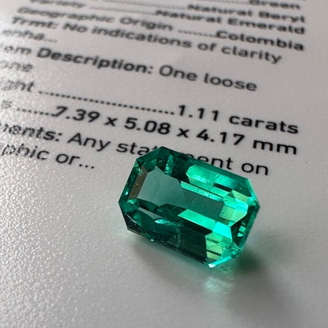 久しぶりにご紹介したいと思える1ctを超える大粒の美しいエメラルドに出会いました。 大好きなステップカットを施された本当に美しいコロンビア産のノンオイルエメラルドです。 ステップカットは四角い大きなファセットが石の魅力をさらに美しく見せてくれる様な気がします。 美しい宝石ばかりを扱う宝石商の方から、あまりにも美しいから。。。と送って来られたノンオイルのエメラルド3ピースの中の1番綺麗で正統派な美しさの際立つ一石です。 100年以上前のアンティークジュエリーを普段から扱い、ノンオイルの美しいトップコロンビアンと呼ばれる少し青みのかかった美しく鮮やかなエメラルドを所有し、刻み込む様に見ている私にとって、巷で騒がれるノンオイルのエメラルドを見ても心を動かされる事は殆どありませんが、このエメラルドはパッケージを開くとドキドキする様な美しい石でした。 センターストーンとしてダイヤモンドと組み合わせて華やかなリングにしたり、シンプルな地金と組み合わせて一粒でリングやピンにしたり、カラーダイヤモンドと組み合わせてプレシャス感をアップする組み合わせなどデザインの想像が広がります。 1.11ct GIA レポート付き コロンビア産 ノンオイルエメラルド