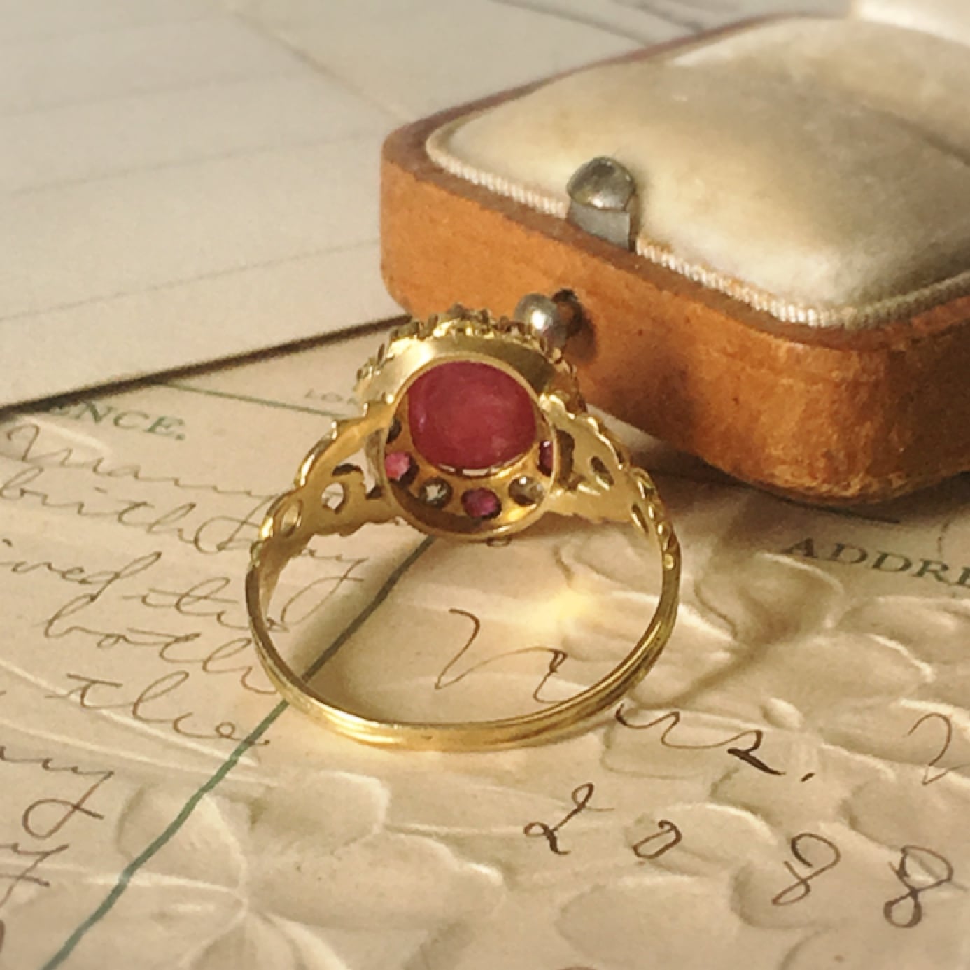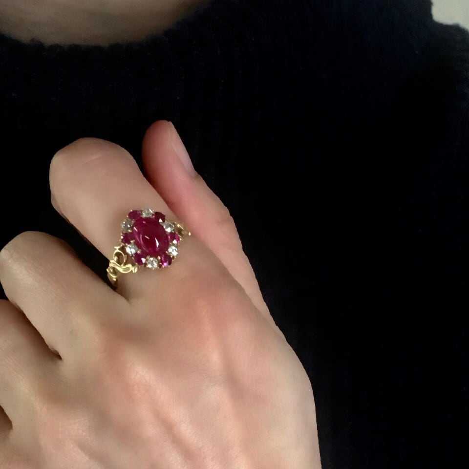 ぴっくりとした艶のあるカボションルビーの発色の美しさ、周りを囲むダイヤモンドやルビーにも上質な石が使われリングの横のしなやかなスクロールワークも美しく2種類の石が一つの色を作り上げ、その調和のとれた美しさは見事です。