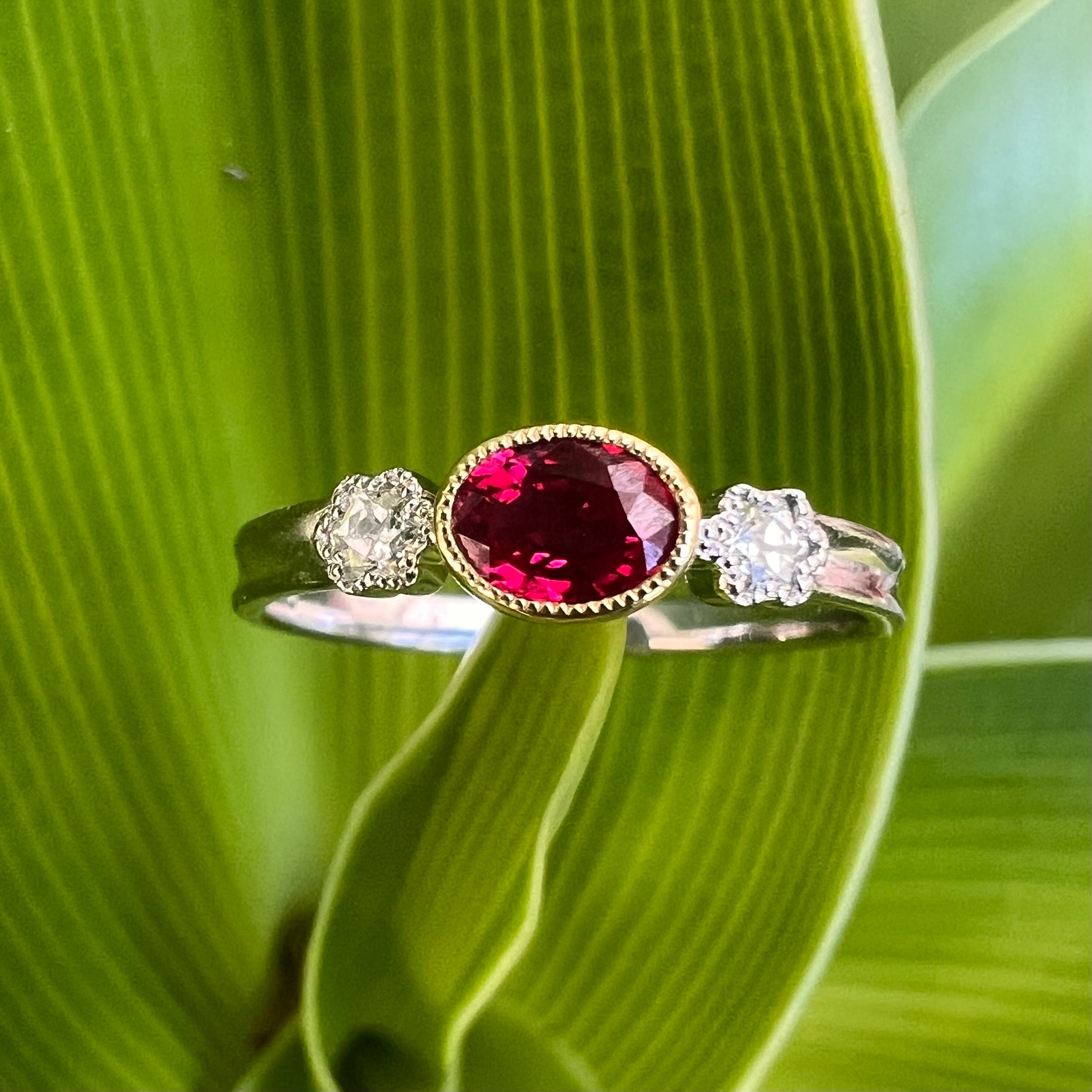 華やかな真っ赤なピジョンブラッドのルビーとスターダイヤモンドを組み合わせたリングです。30年以上このジュエリーの仕事をしていますが、仕事を始めた強い力と運を運んでくれそうなこの色に憧れて、少しづつ集めてきたのがこの真っ赤なピジョンブラッドの色のルビー。