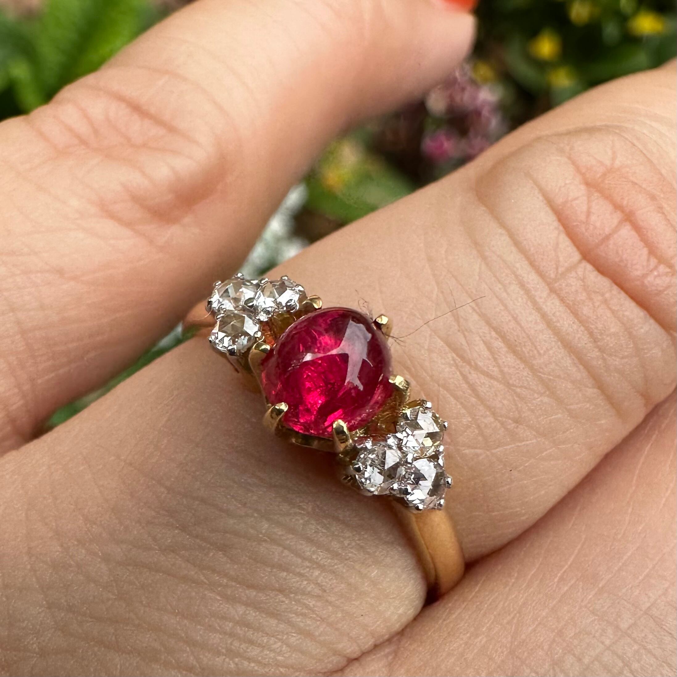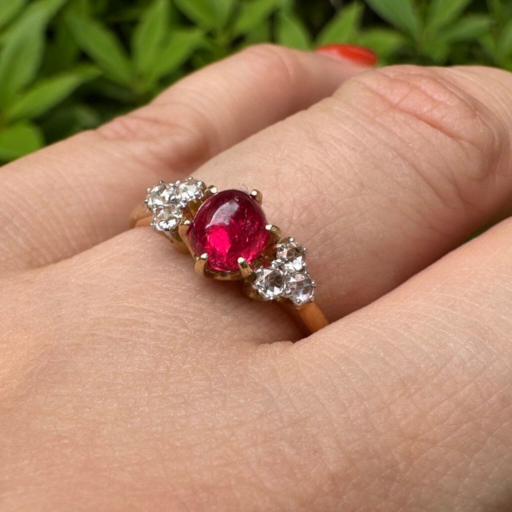 Red Spinel Cabochon & Rosecut Diamond Ring ①