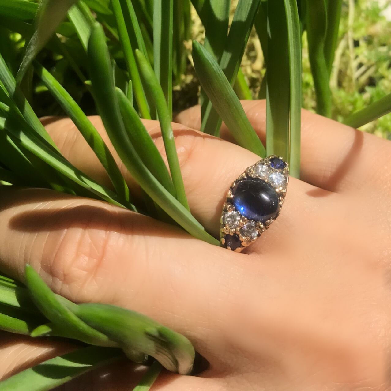 堂々とした良質の大粒のカボションサファイアとオールドカットダイヤモンドのコンビネーションが美しいヴィクトリアンリングです。