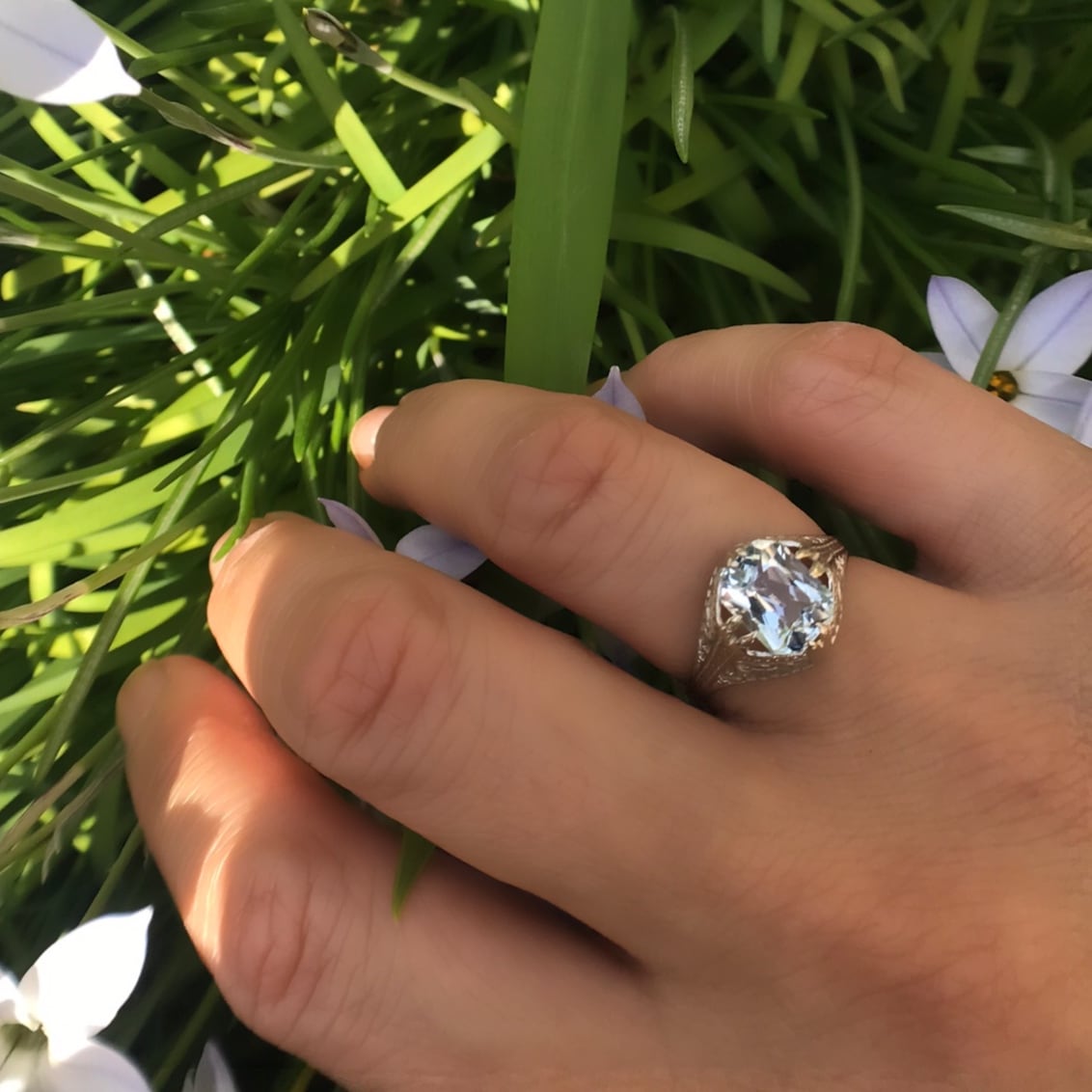 ホワイトゴールドのマウント部分はレースを思わせるアメリカンフィリグリーの繊細な透かし細工で作られています。美しいカットを施したアクアマリンを包み込むようにふっくらとデザインされ、石の透明感と透かしで涼しげな雰囲気を醸し出しています。