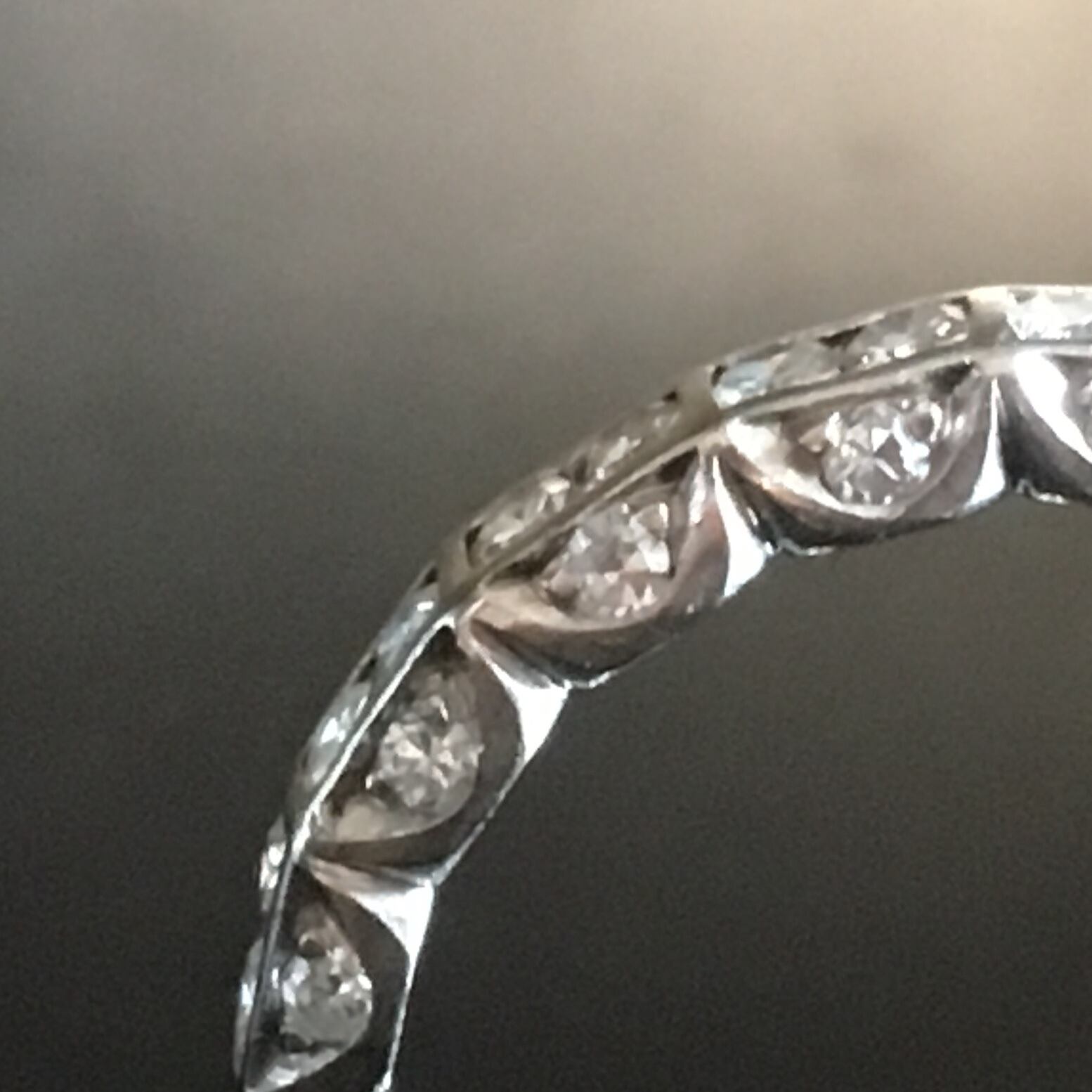 驚く様な複雑な作りのエタニティーダイヤモンドのバンドのリングです。オールドヨーロピアンカットダイヤモンドが2粒づつ長方形のプラチナ枠の台座にいくつも丁寧に深く埋め込むようにセットされたフルエタニティーバンドはアール・デコ期に製作されたと思われます。