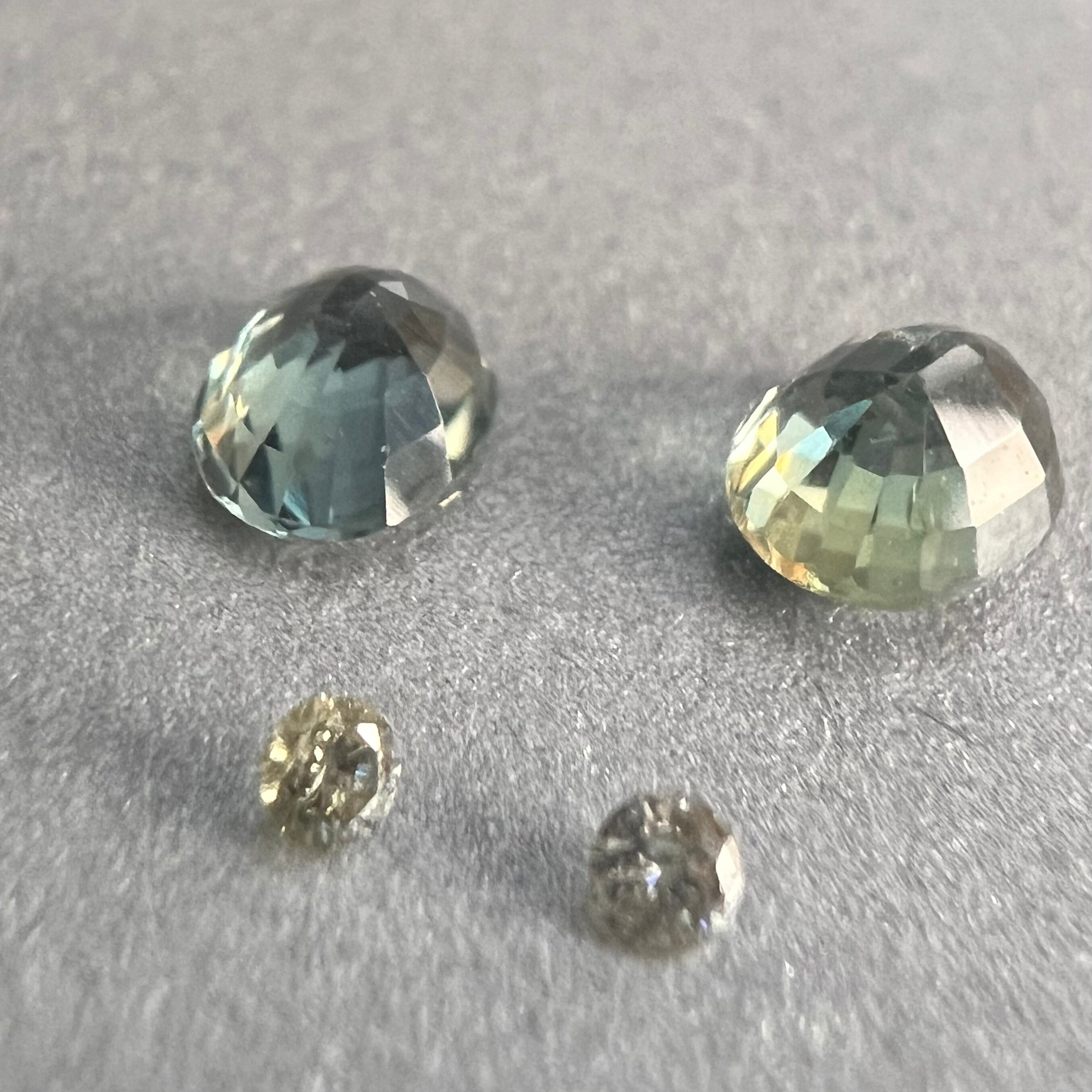 最近ピアス用にペアでルースをお探しのお客様が多く、私の好きな色のブルーグリーンのティールサファイアと貴重なナチュラルカラーの小粒のグリーンダイヤモンドをセットにしたピアス用のペアを組みました。