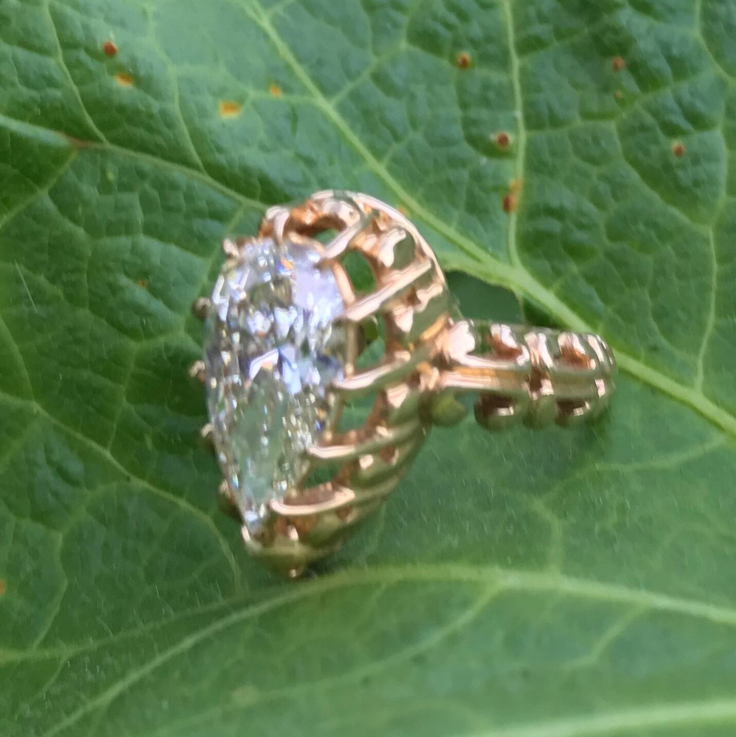 大きなティアドロップ型のダイヤモンドと手作りの凝ったゴールド枠が印象的なリングです。堂々とした大きさのダイヤモンド、そしてアンティークジュエリーのティアラの様な美しいセッティングとシャンク。少し黄色みのかかった照りの良い涙型のダイヤモンドが赤みのかかったゴールドの枠にセットされる事でアンティークジュエリーの様な雰囲気を醸し出しています。