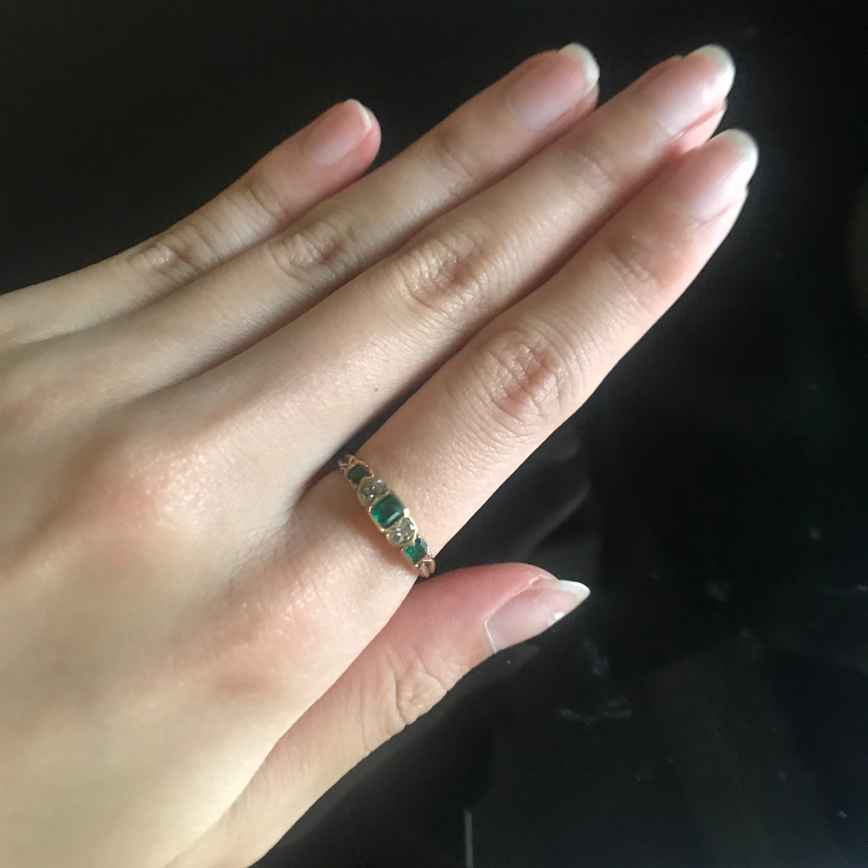 小さいながらもヴィクトリアンジュエリーの王道を行く、センチメンタルな思いを秘めたセッティングやクローズトセットされたた控えめな石の使い方。小粒ながら美しい色の宝石の輝きには本当にアンティークリングらしい魅力が溢れています。