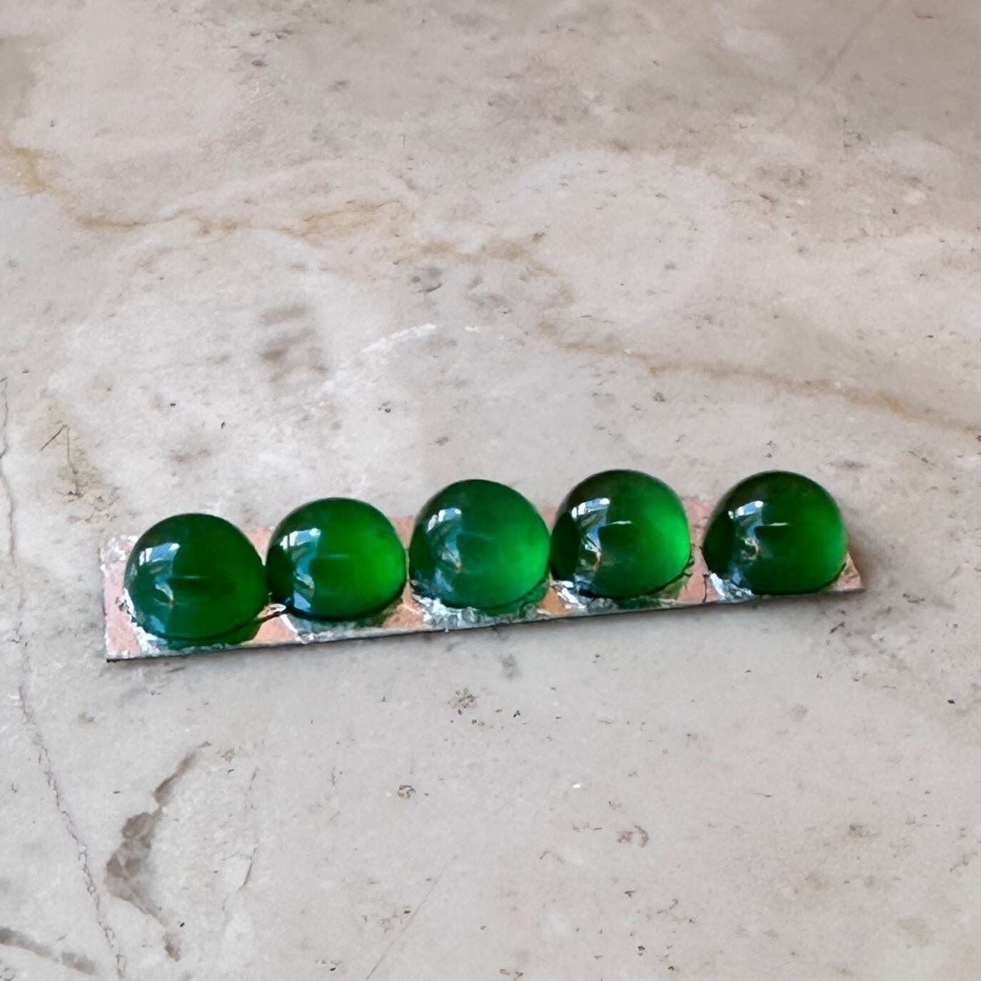 先月仕事で香港を訪れる機会があり、信じられない量のジュエリーを浴びる様に見る機会がありました。そんな中で訪れたジュエリー会社で出会った小粒の翡翠を使ったリングに惹かれ、サンプルとして購入。ダメもとでルースの購入を打診したところ、すでにジュエリー制作用としてアソート済みの石を譲って頂きました。カボションの小粒の石は通常形が不定形でジュエリー用にアソートして並べるだけでも信じられないくらいの時間がかかります。折角ジュエリーにする様に並べてあった石を横取りする様に購入して来ました。