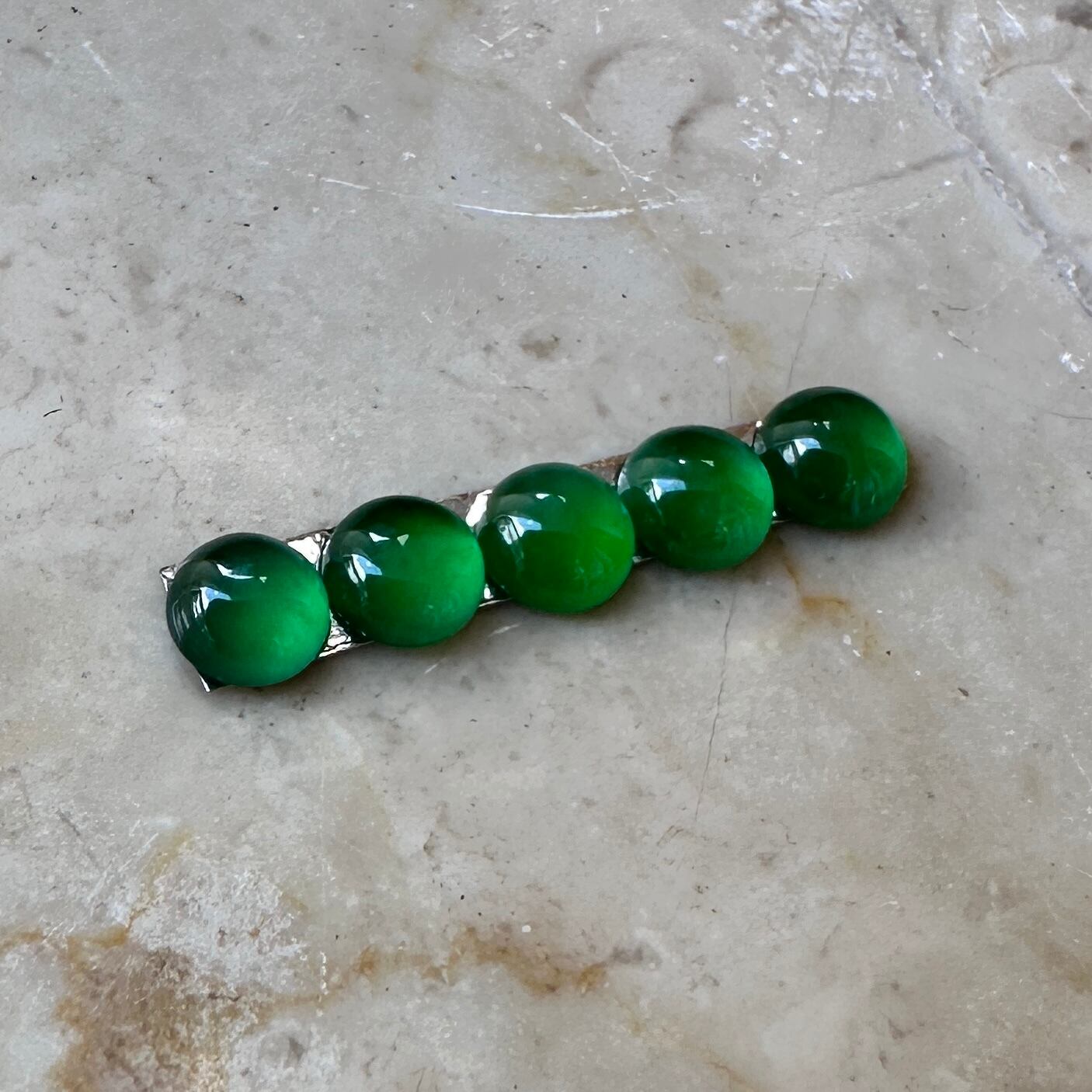 先月仕事で香港を訪れる機会があり、信じられない量のジュエリーを浴びる様に見る機会がありました。そんな中で訪れたジュエリー会社で出会った小粒の翡翠を使ったリングに惹かれ、サンプルとして購入。ダメもとでルースの購入を打診したところ、すでにジュエリー制作用としてアソート済みの石を譲って頂きました。カボションの小粒の石は通常形が不定形でジュエリー用にアソートして並べるだけでも信じられないくらいの時間がかかります。折角ジュエリーにする様に並べてあった石を横取りする様に購入して来ました。
