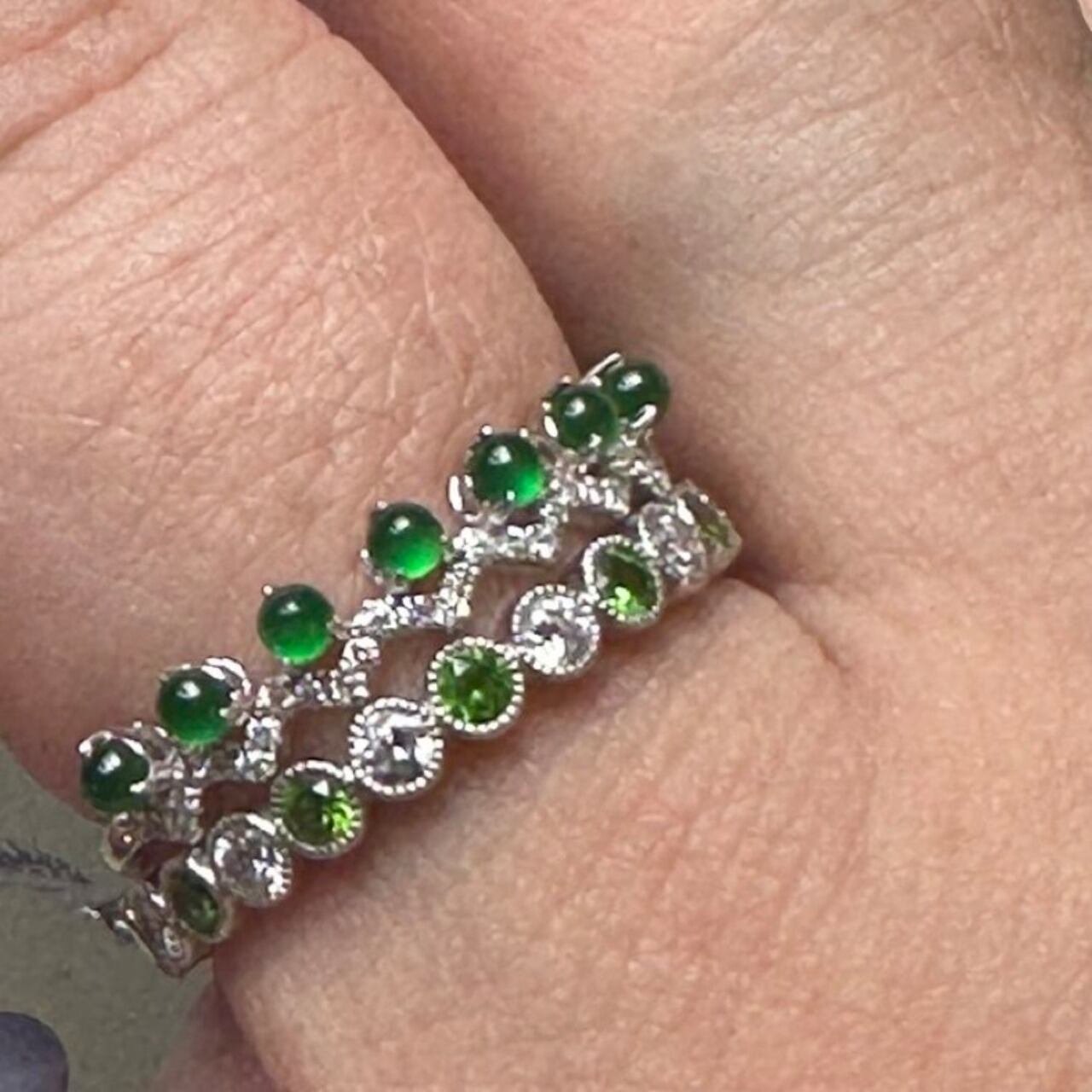 先月仕事で香港を訪れる機会があり、信じられない量のジュエリーを浴びる様に見る機会がありました。そんな中で訪れたジュエリー会社で出会った小粒の翡翠を使ったリングに惹かれ、サンプルとして購入。ダメもとでルースの購入を打診したところ、すでにジュエリー制作用としてアソート済みの石を譲って頂きました。カボションの小粒の石は通常形が不定形でジュエリー用にアソートして並べるだけでも信じられないくらいの時間がかかります。折角ジュエリーにする様に並べてあった石を横取りする様に購入して来ました。
