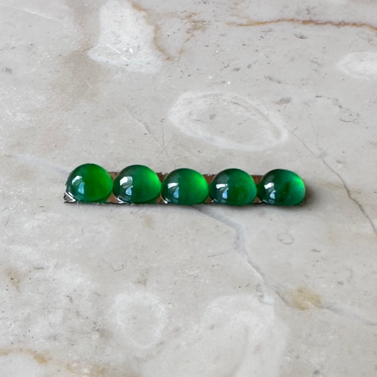 先月仕事で香港を訪れる機会があり、信じられない量のジュエリーを浴びる様に見る機会がありました。そんな中で訪れたジュエリー会社で出会った小粒の翡翠を使ったリングに惹かれ、サンプルとして購入。ダメもとでルースの購入を打診したところ、すでにジュエリー制作用としてアソート済みの石を譲って頂きました。カボションの小粒の石は通常形が不定形でジュエリー用にアソートして並べるだけでも信じられないくらいの時間がかかります。折角ジュエリーにする様に並べてあった石を横取りする様に購入して来ました。