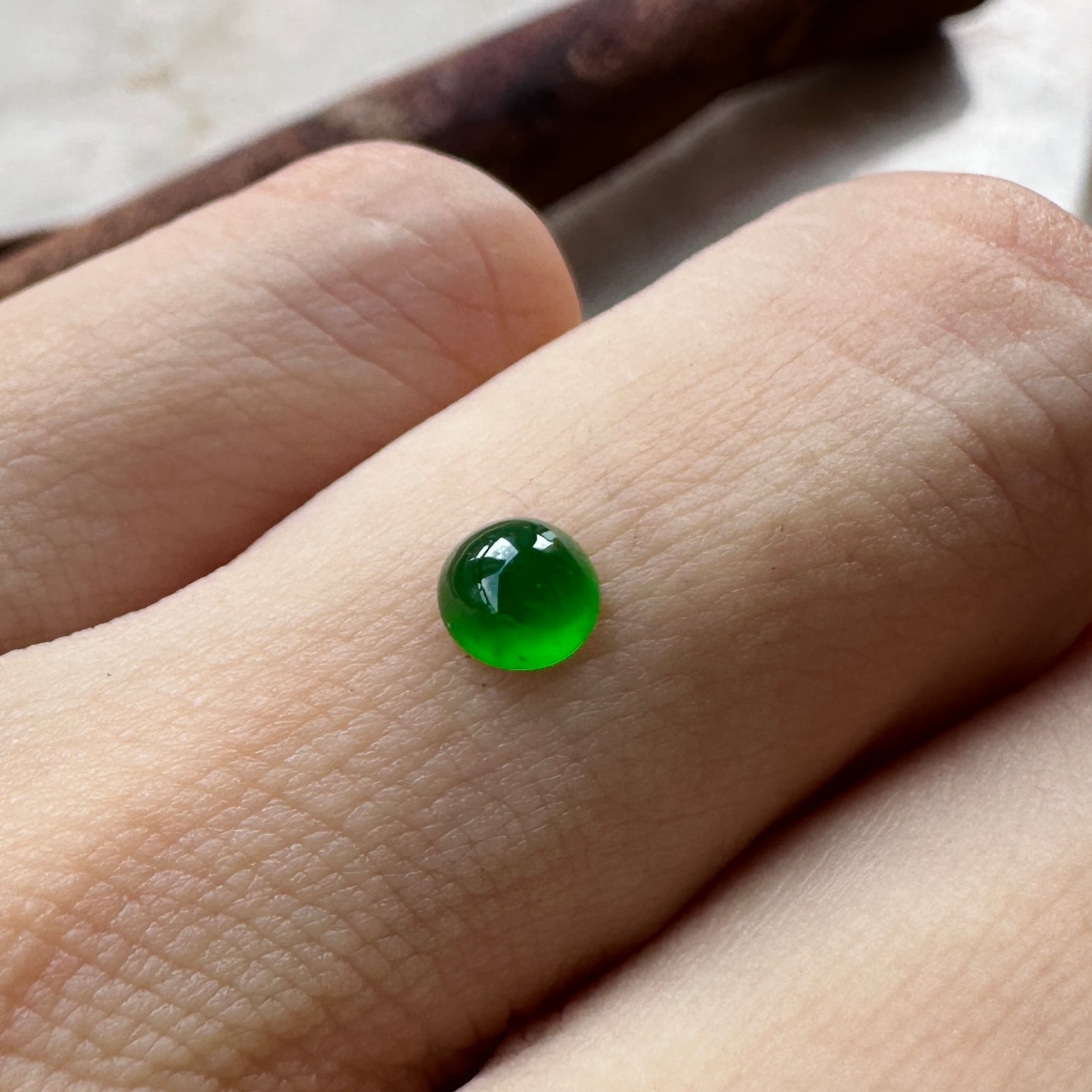 先月仕事で香港を訪れる機会があり、信じられない量のジュエリーを浴びる様に見る機会がありました。そんな中で訪れたジュエリー会社で出会った小粒の翡翠を使ったリングに惹かれ、サンプルとして購入。ダメもとでルースの購入を打診したところ、すでにジュエリー制作用として検査済みのカボションの石を横取りする様に購入して来ました。