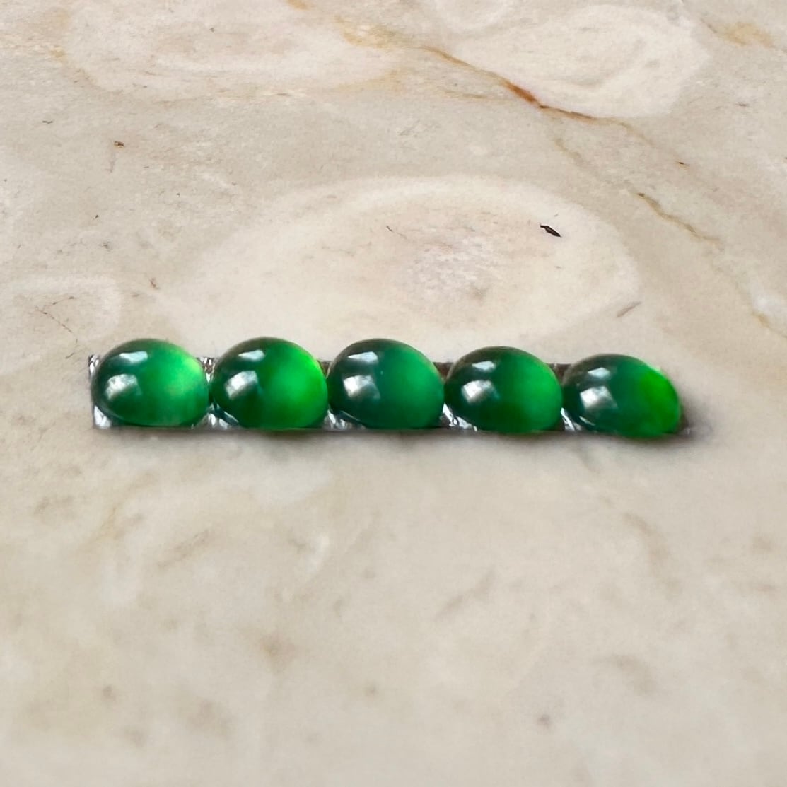 先月仕事で香港を訪れる機会があり、信じられない量のジュエリーを浴びる様に見る機会がありました。そんな中で訪れたジュエリー会社で出会った小粒の翡翠を使ったリングに惹かれ、サンプルとして購入。ダメもとでルースの購入を打診したところ、すでにジュエリー制作用としてアソート済みの石を譲って頂きました。カボションの小粒の石は通常形が不定形でジュエリー用にアソートして並べるだけでも信じられないくらいの時間がかかります。折角ジュエリーにする様に並べてあった石を横取りする様に購入して来ました。
