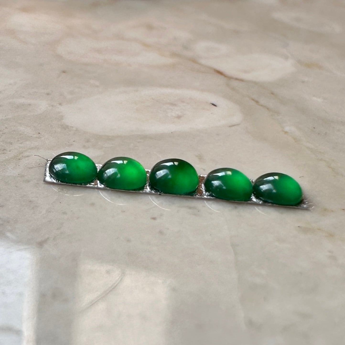 先月仕事で香港を訪れる機会があり、信じられない量のジュエリーを浴びる様に見る機会がありました。そんな中で訪れたジュエリー会社で出会った小粒の翡翠を使ったリングに惹かれ、サンプルとして購入。ダメもとでルースの購入を打診したところ、すでにジュエリー制作用としてアソート済みの石を譲って頂きました。カボションの小粒の石は通常形が不定形でジュエリー用にアソートして並べるだけでも信じられないくらいの時間がかかります。折角ジュエリーにする様に並べてあった石を横取りする様に購入して来ました。