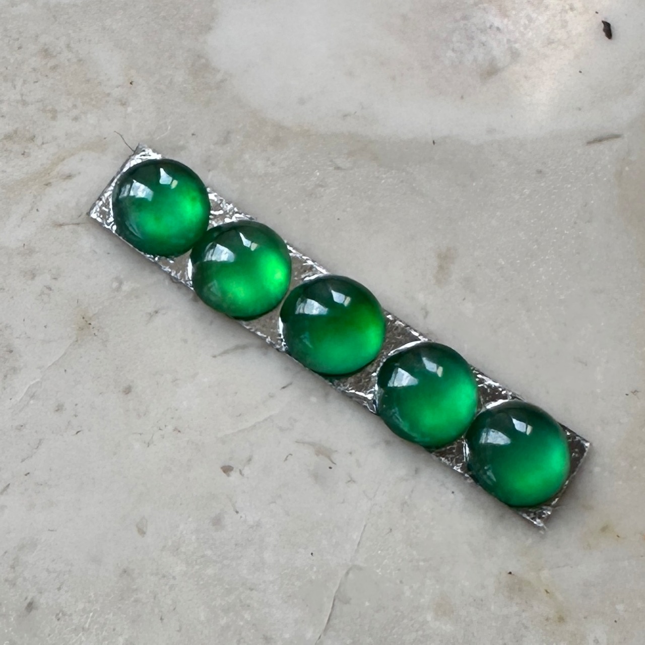 センターだけ少し大きさと高さのある粒よりの美しい色の翡翠でお仕立てに使われるのにぴったりの翡翠です。