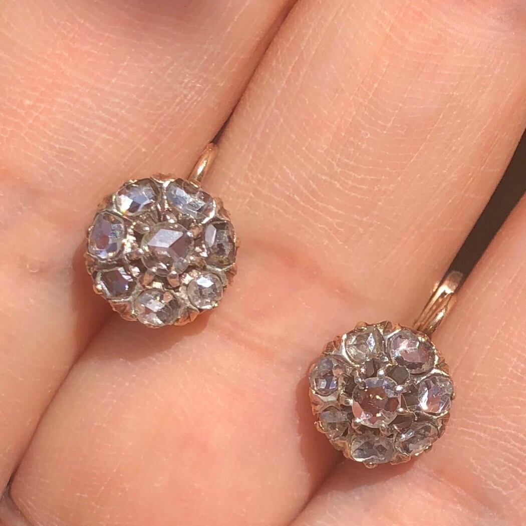 19世紀末に作られたローズカットダイヤモンドのピアスです。 程よい大きさとローズカットダイヤモンドの透明感と輝きがお出かけにも、少し贅沢な普段使いにぴったりです。一粒一粒丁寧にハンドカットされたローズカットダイヤモンドと爪どめ、またサイドからもダイヤモンドに光が入る様に大きくUの字にカーブして開けられたゴールドのセッティングが作りの丁寧さを物語っています。因みにうっかりとヨーロッパからお品が届いて直ぐに写真を撮ったのですが、撮影後に洗ってみると本当に綺麗な透明感のあるピアスで写真よりもずっと良いものです。