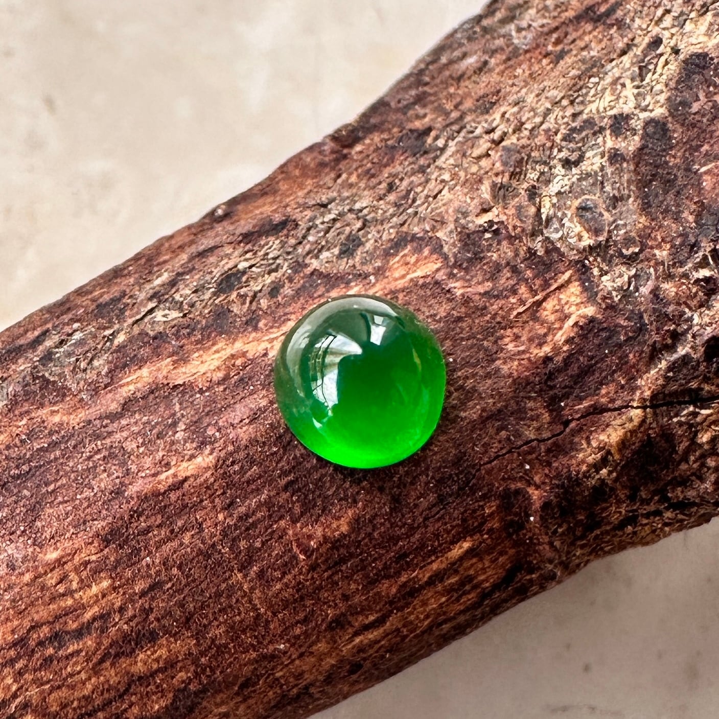典型的な美しい山高のカボションカットの琅玕翡翠です。