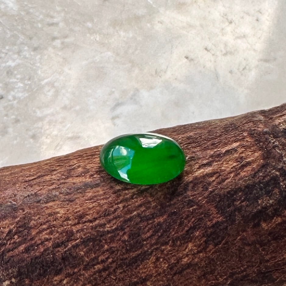 この0.950ctの美しい緑の石を食べ物にして表現したかの様な言葉です。出張先で刺すような濃い緑の翡翠を使った指輪を見つけた時にはドキドキする様な感動がおきました。