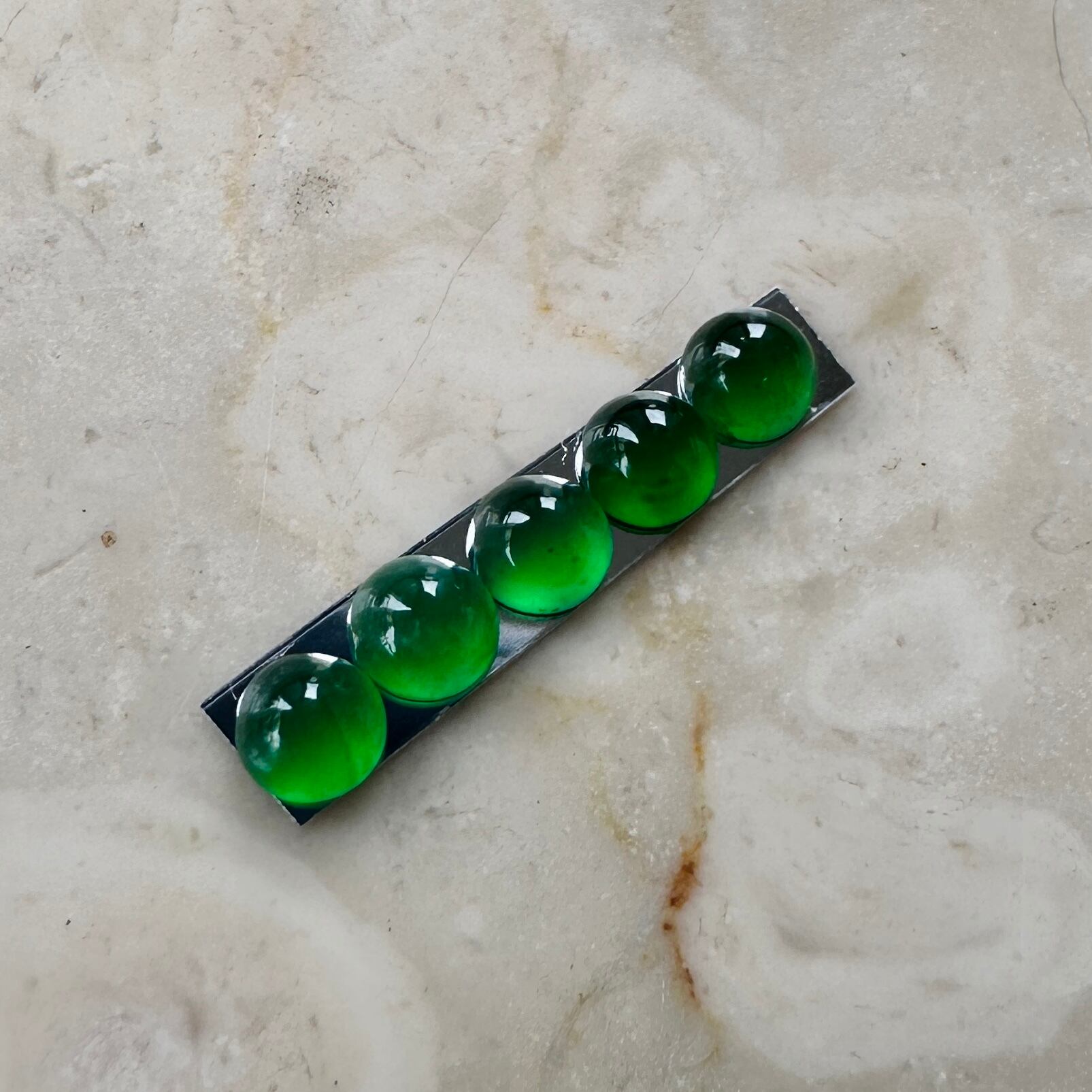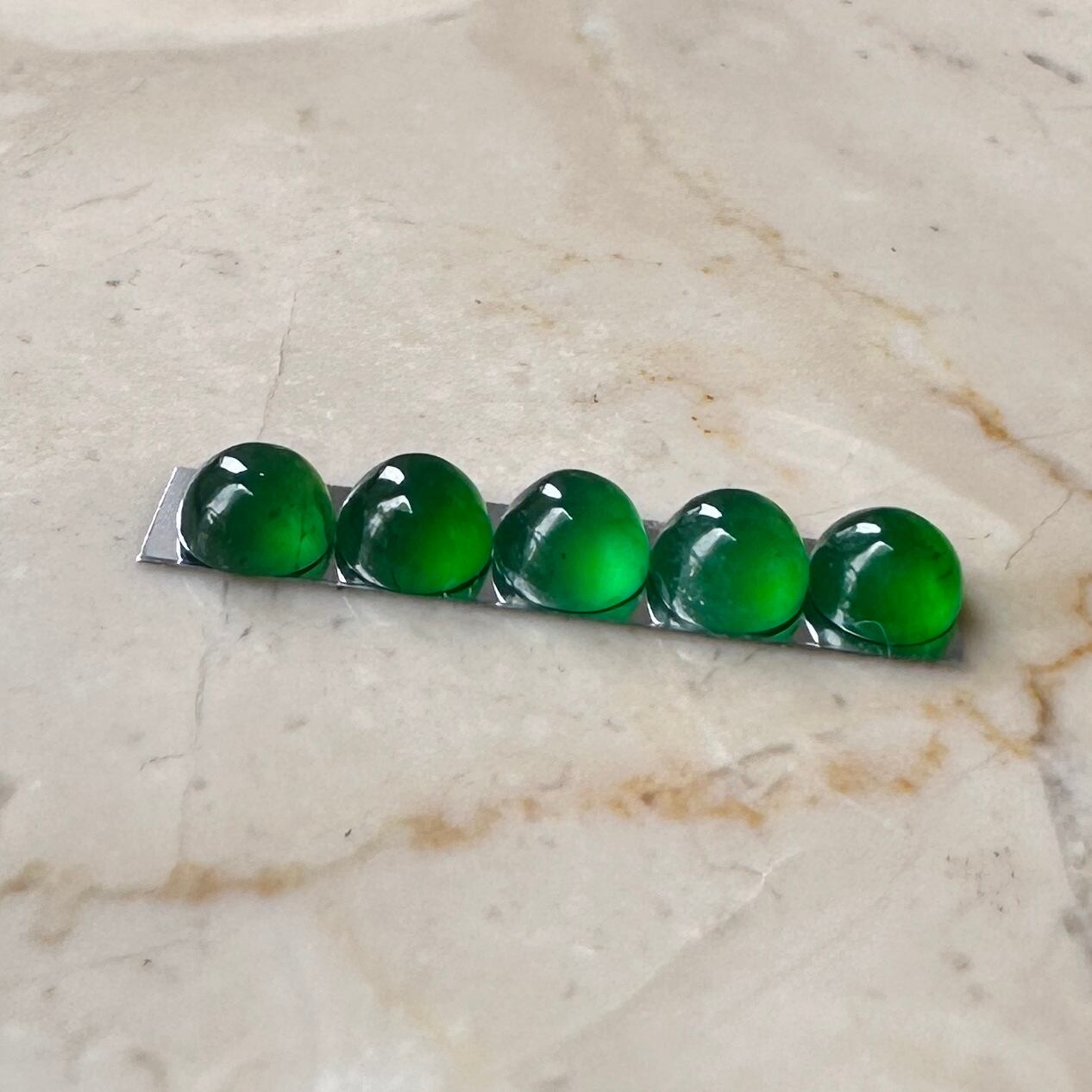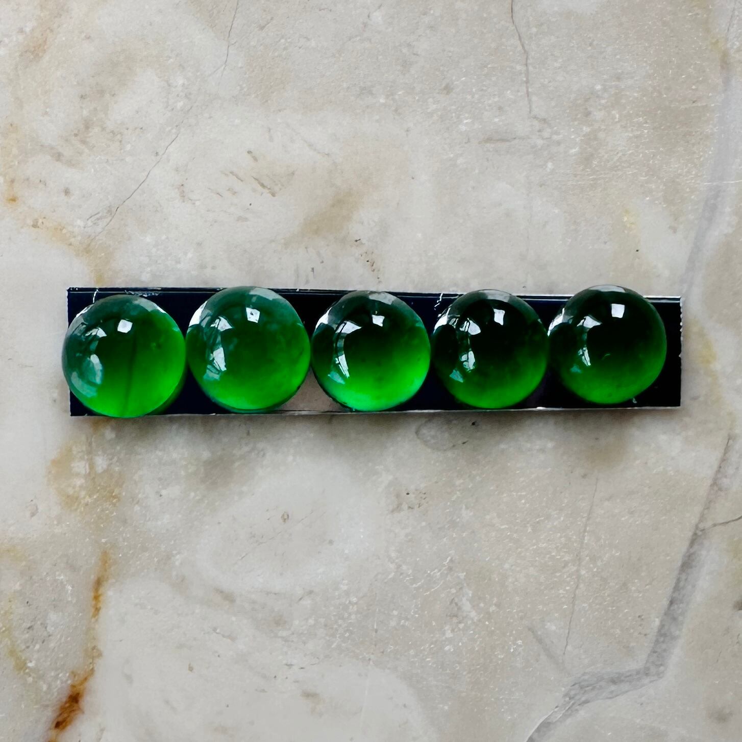 先月仕事で香港を訪れる機会があり、信じられない量のジュエリーを浴びる様に見る機会がありました。そんな中で訪れたジュエリー会社で出会った小粒の翡翠を使ったリングに惹かれ、サンプルとして購入。ダメもとでルースの購入を打診したところ、すでにジュエリー制作用としてアソート済みの石を譲って頂きました。カボションの小粒の石は通常形が不定形でジュエリー用にアソートして並べるだけでも信じられないくらいの時間がかかります。折角ジュエリーにする様に並べてあった石を横取りする様に購入して来ました。