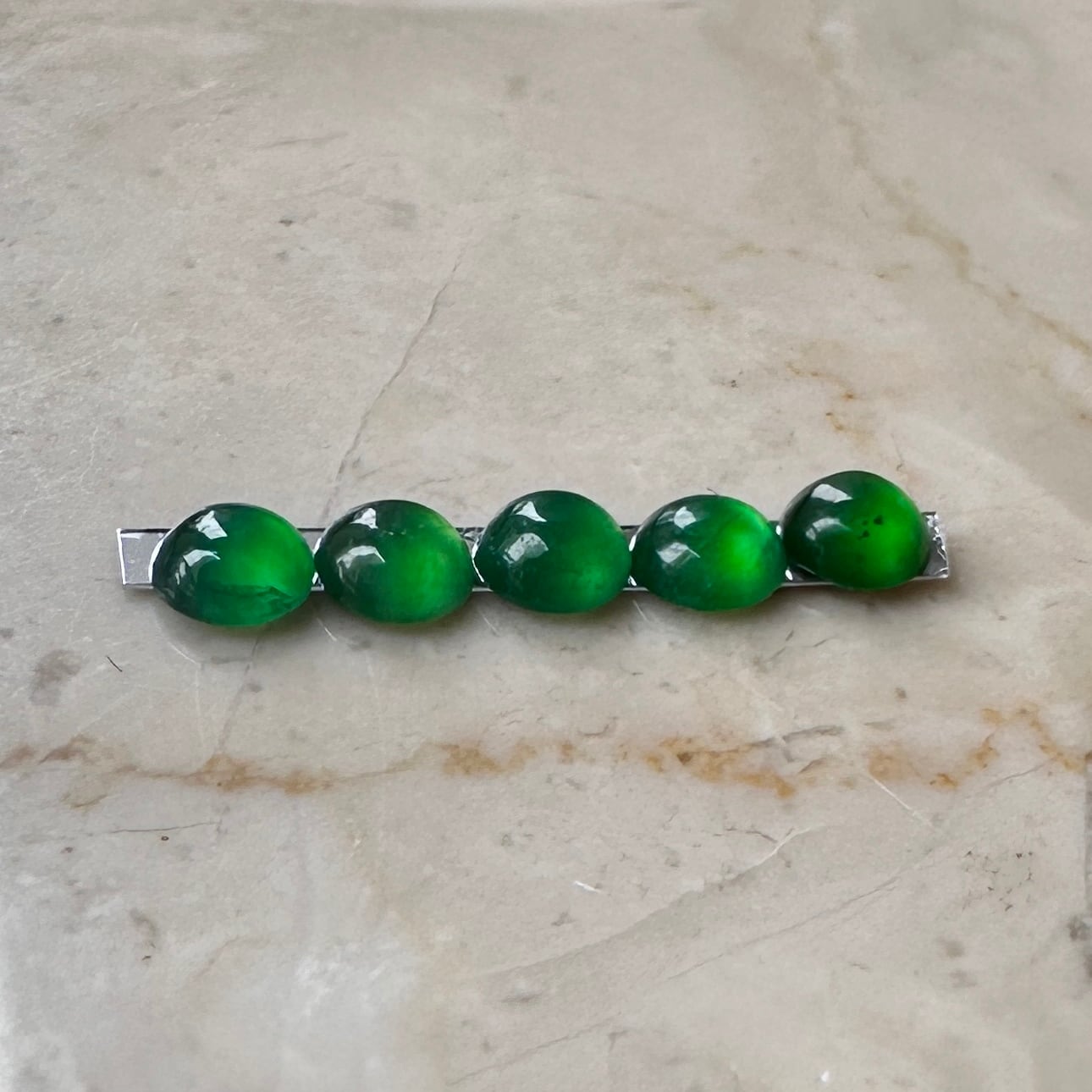先月仕事で香港を訪れる機会があり、信じられない量のジュエリーを浴びる様に見る機会がありました。そんな中で訪れたジュエリー会社で出会った小粒の翡翠を使ったリングに惹かれ、サンプルとして購入。ダメもとでルースの購入を打診したところ、すでにジュエリー制作用としてアソート済みの石を譲って頂きました。カボションの小粒の石は通常形が不定形でジュエリー用にアソートして並べるだけでも信じられないくらいの時間がかかります。折角ジュエリーにする様に並べてあった石を横取りする様に購入して来ました。
