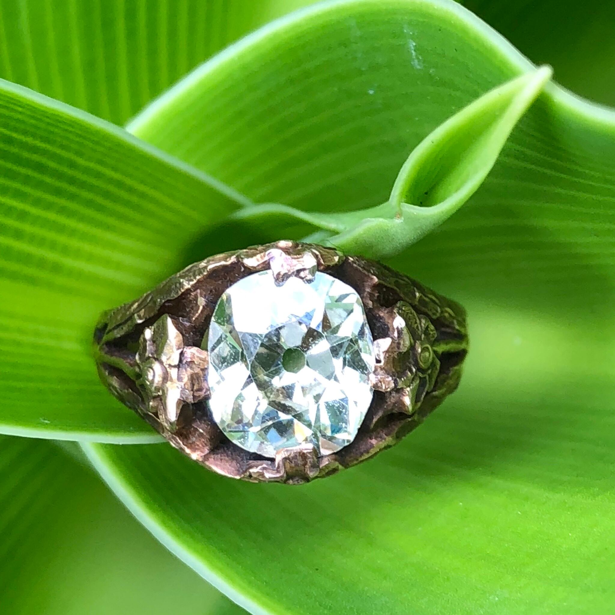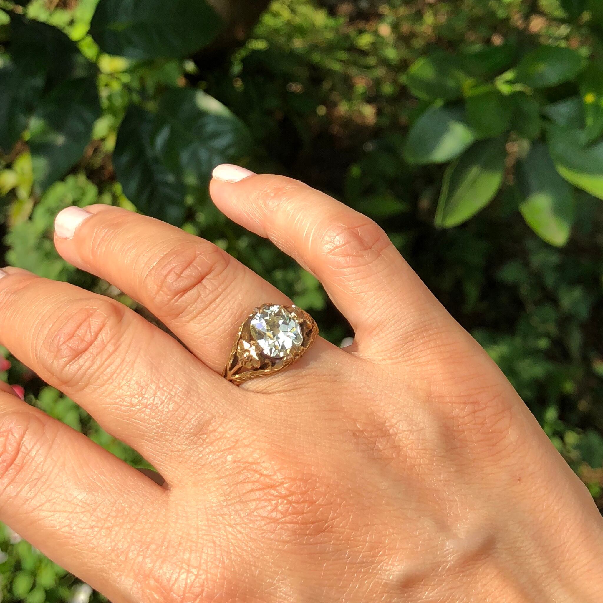 アンティークのダイヤモンドリングの特徴とも言える美しいデザインは野生のパンジーの花を象ったアンティークゴールドのセッティング。ため息の出るほど美しいリングです。