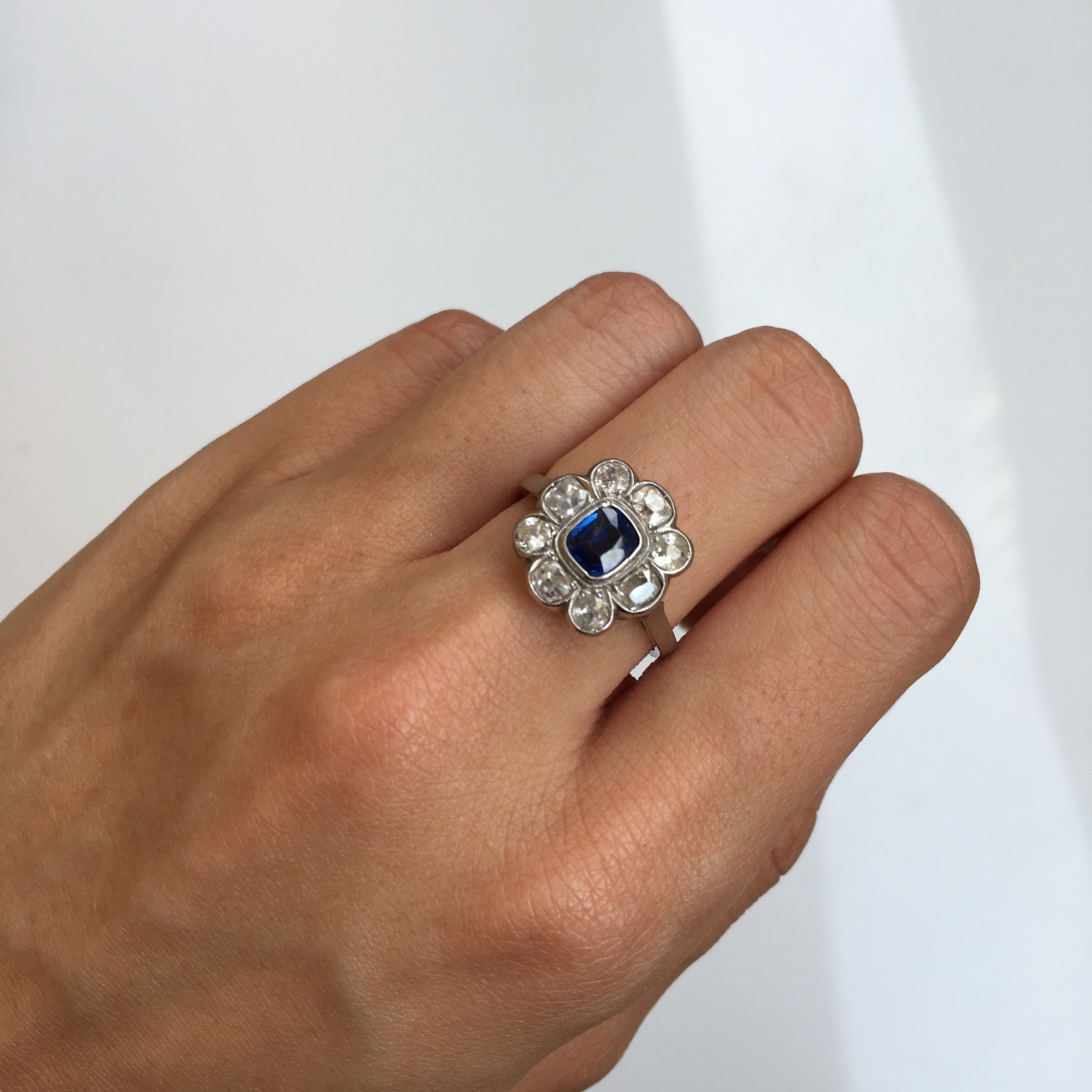 イギリスのエドワード王朝時代に制作されたと思われるサファイアとダイヤモンドのクラスターリングです。クラスターと呼べないほど、厚みのあるゴロゴロとしたオールドカットダイヤモンドが贅沢に約1.8ct程使われています。 エレガントなのにどこか少しかっちりとした印象のこのリングは同時期のフランスやその他のヨーロッパの国で作られた物とは違い、イギリスらしさが溢れている様な気がします。