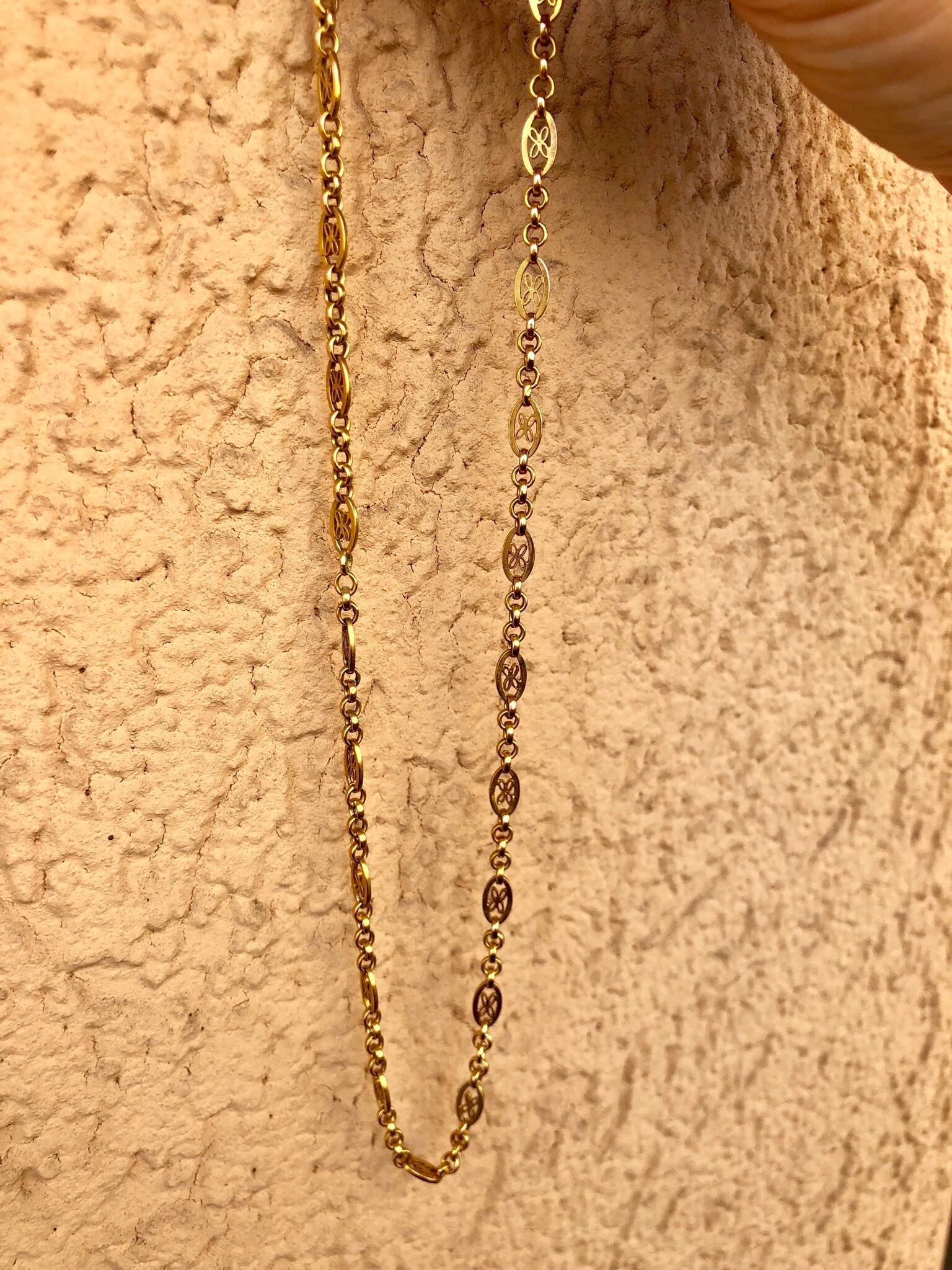 アンティークのゴールドチェーンです。ボート型の透かし金具をつなげた比較的軽めのチェーンはアンティークのゴールドチェーンが楽しみたいけれど、重さが気になる方にぴったり。ヨーロッパ中のアンティークストア、ゴールド商を一軒一軒周り、選りすぐりのチェーンを数年にわたり買い集めた中の一本です。夏はTシャツやワンピースにしても秋冬はタートルにしても素敵なコーディネートがお手軽に完成。たった一本のゴールドチェーンを身につけるだけでシンプルなTシャツもぐっとお洒落な装いにランクアップします。アンティークのゴールドの美しいチェーンはなかなか見つからないのですが、兎に角需要もコレクターも多く買い付けをしていてもなかなかリーズナブルなお品に出会える事は滅多にありません。