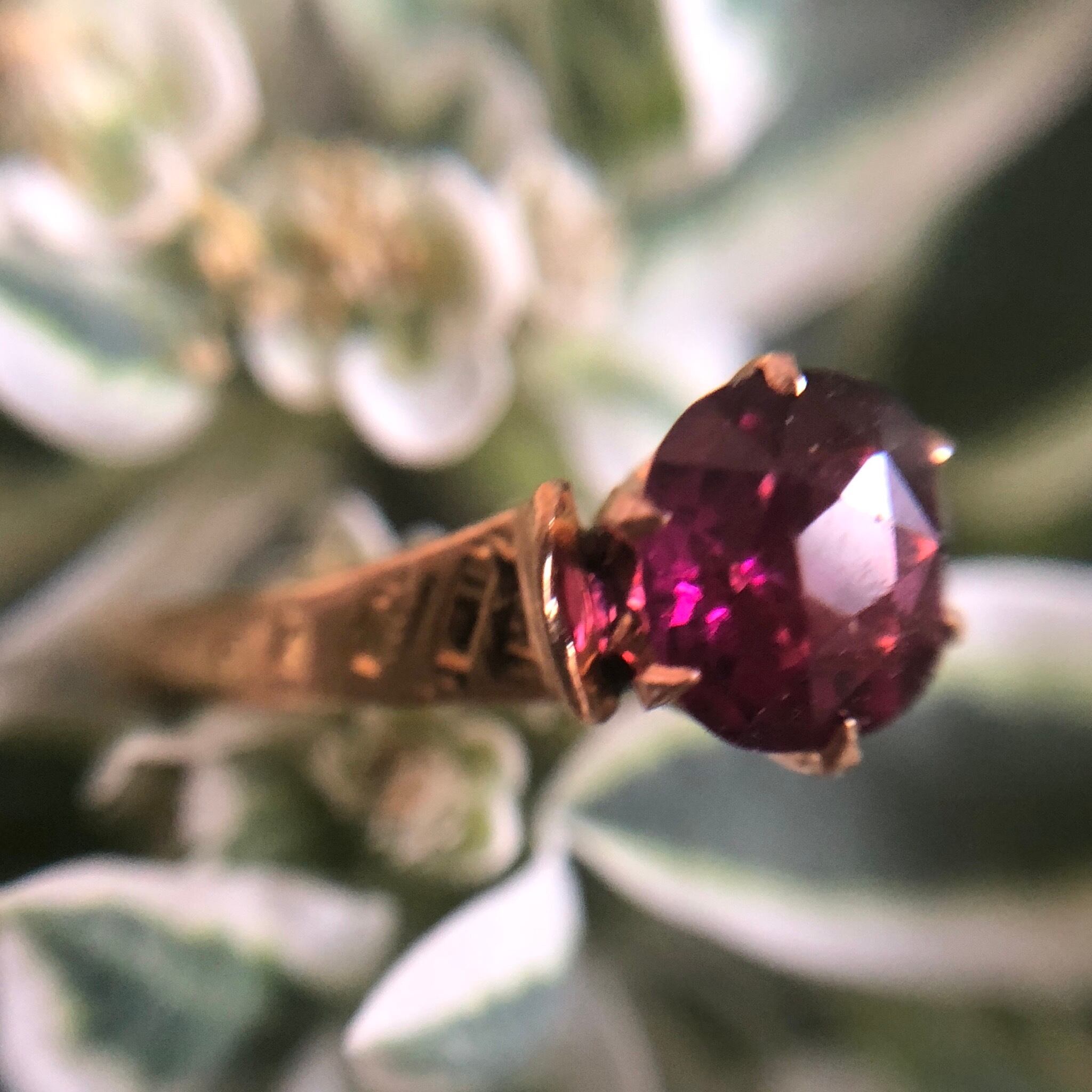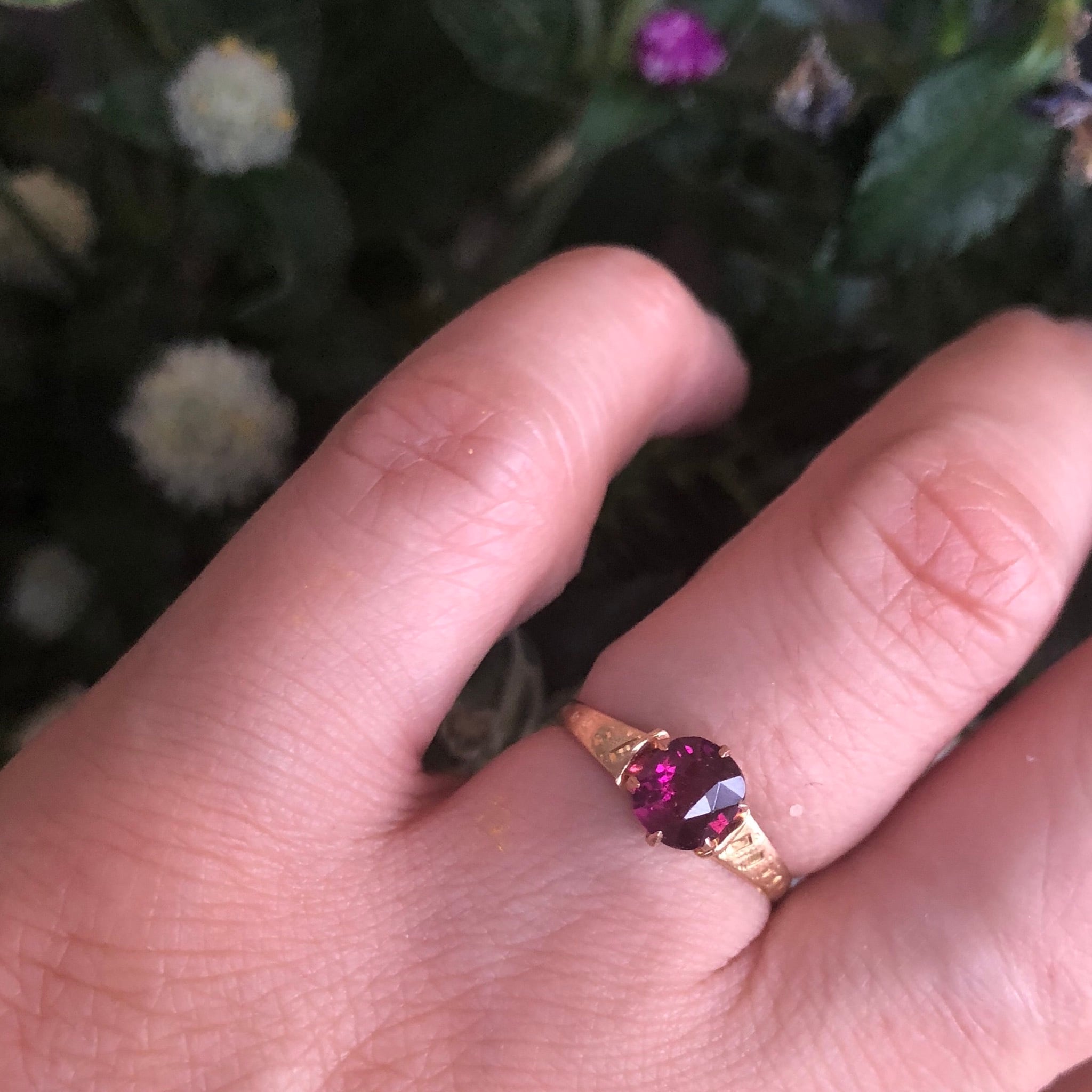 着用画像は私の太い指で申し訳無いのですが、兎に角凄く可愛くて上品なヴィクトリアンのガーネットリングです。ヴィクトリア女王のお気に入りの石と言う事で当時のジュエリーにはガーネットが多く使われていますが、こんなに深くてリッチ、そして華やかで気品のあるピンクと紫の中間の美しい石が使ってあるリングにはなかなか出会えません。