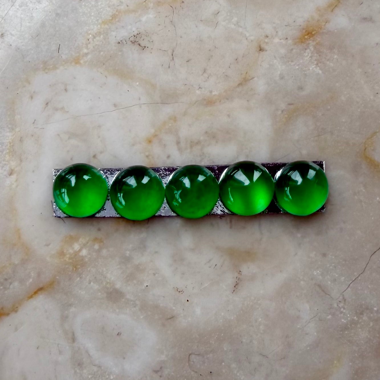 先月仕事で香港を訪れる機会があり、信じられない量のジュエリーを浴びる様に見る機会がありました。そんな中で訪れたジュエリー会社で出会った小粒の翡翠を使ったリングに惹かれ、サンプルとして購入。ダメもとでルースの購入を打診したところ、すでにジュエリー制作用としてアソート済みの石を譲って頂きました。カボションの小粒の石は通常形が不定形でジュエリー用にアソートして並べるだけでも信じられないくらいの時間がかかります。折角ジュエリーにする様に並べてあった石を横取りする様に購入して来ました。