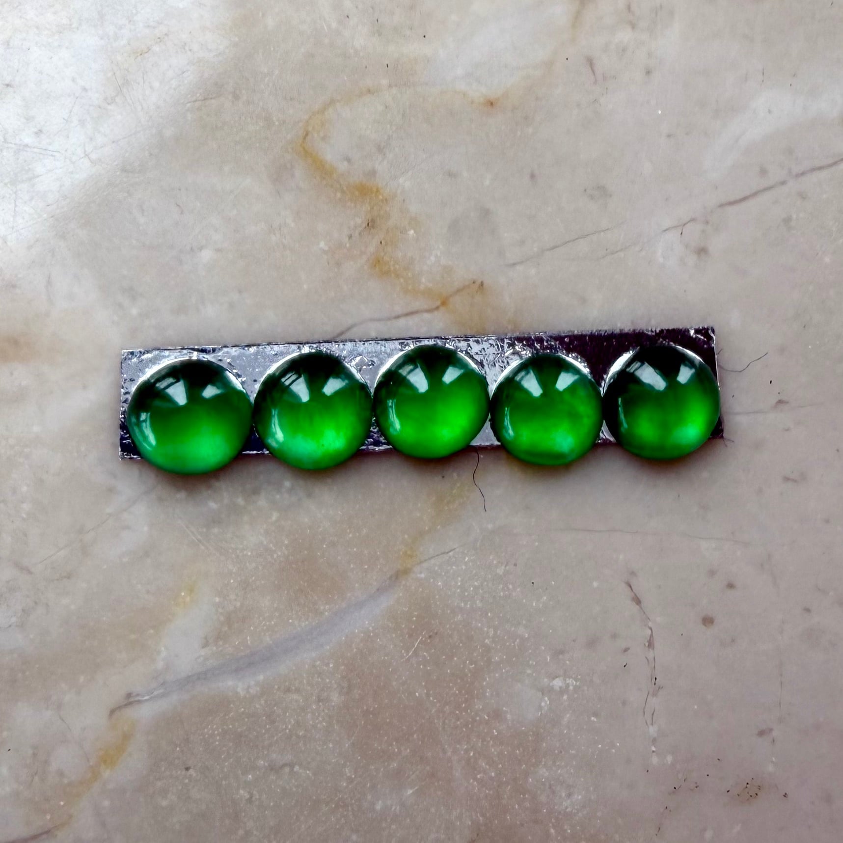 先月仕事で香港を訪れる機会があり、信じられない量のジュエリーを浴びる様に見る機会がありました。そんな中で訪れたジュエリー会社で出会った小粒の翡翠を使ったリングに惹かれ、サンプルとして購入。ダメもとでルースの購入を打診したところ、すでにジュエリー制作用としてアソート済みの石を譲って頂きました。カボションの小粒の石は通常形が不定形でジュエリー用にアソートして並べるだけでも信じられないくらいの時間がかかります。折角ジュエリーにする様に並べてあった石を横取りする様に購入して来ました。