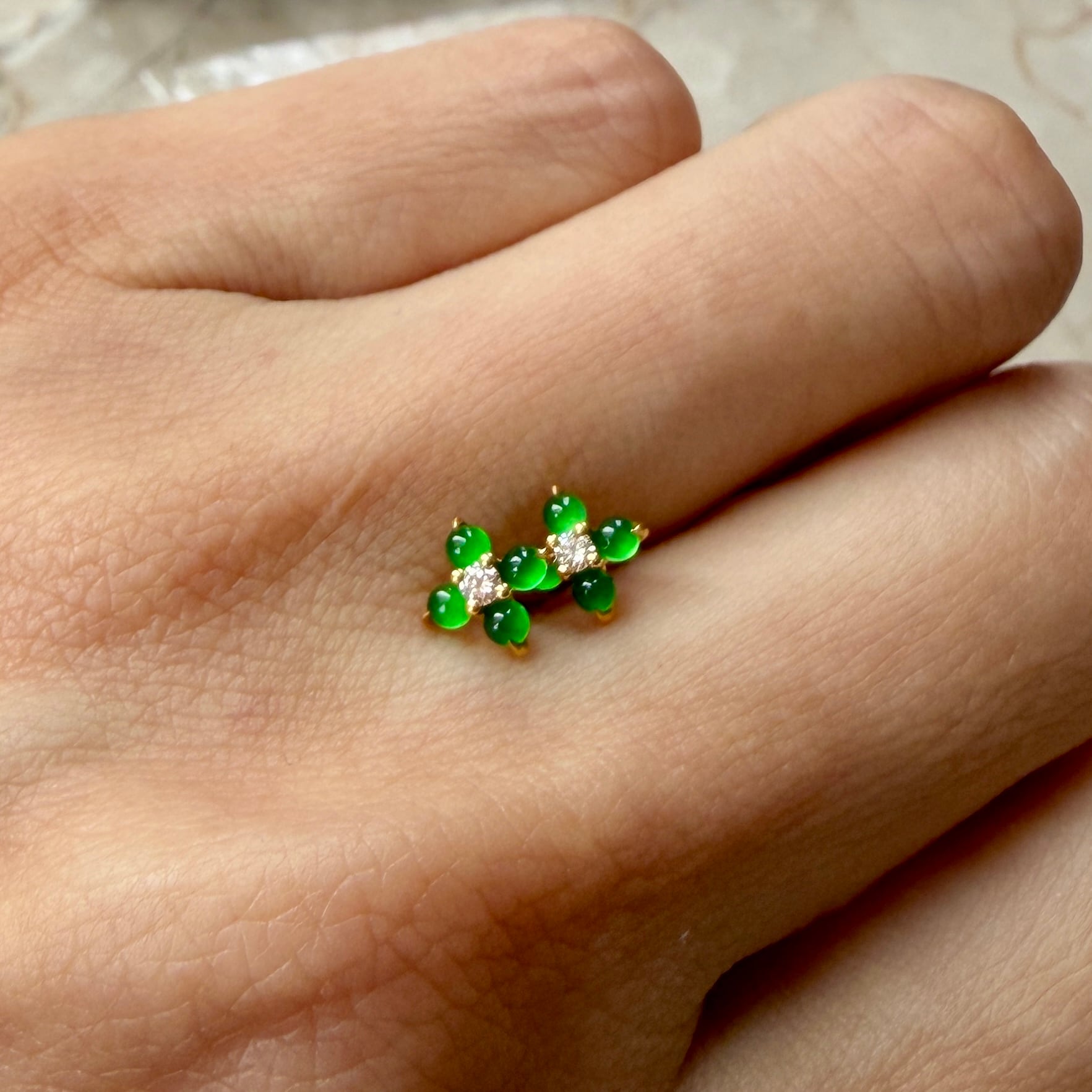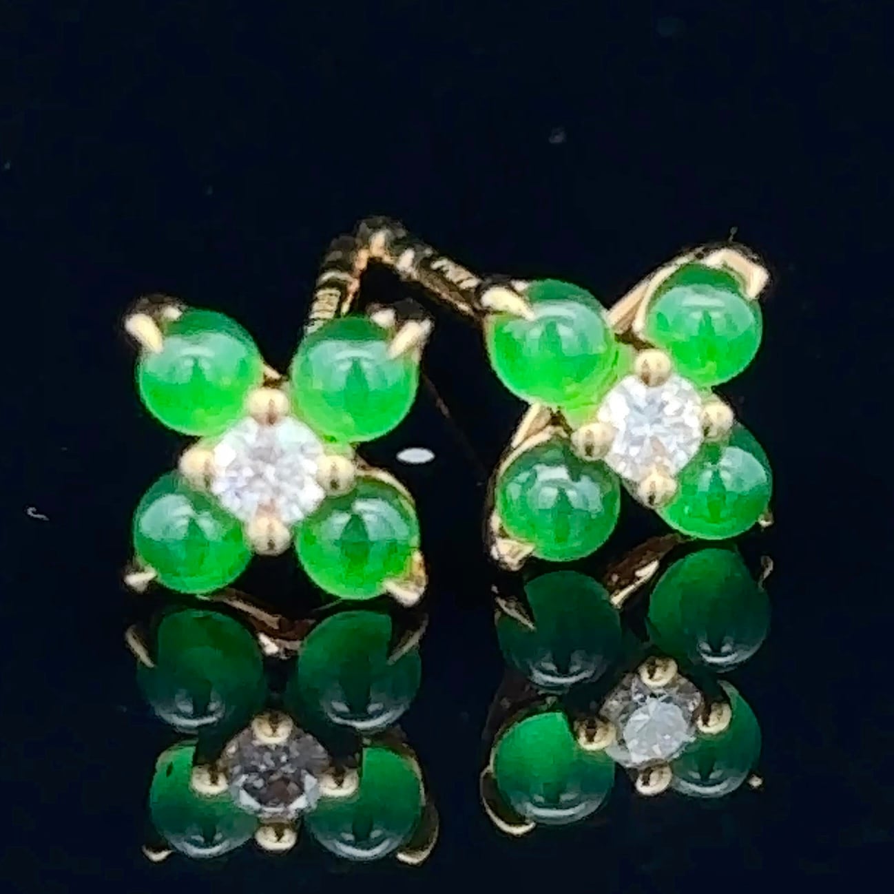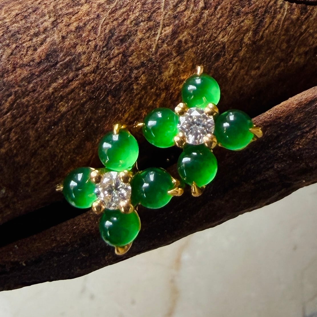 うるうるとした小粒の翡翠がダイヤモンドを囲む、可愛らしいピアスです。
