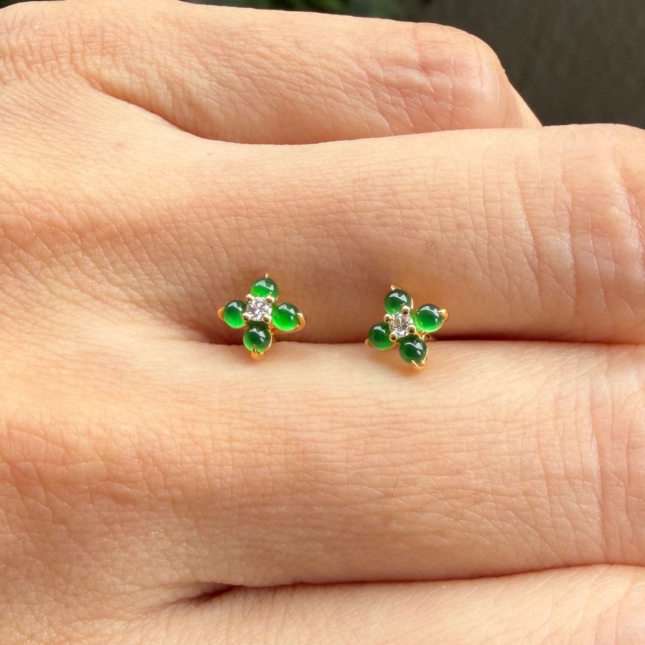 翡翠の緑はどんな服装にも合わせやすく、耳元に持ってくると顔が明るく見えておすすめです。こちらは大きさも控えめなので、和装に合わせていただくのもとても素敵です。