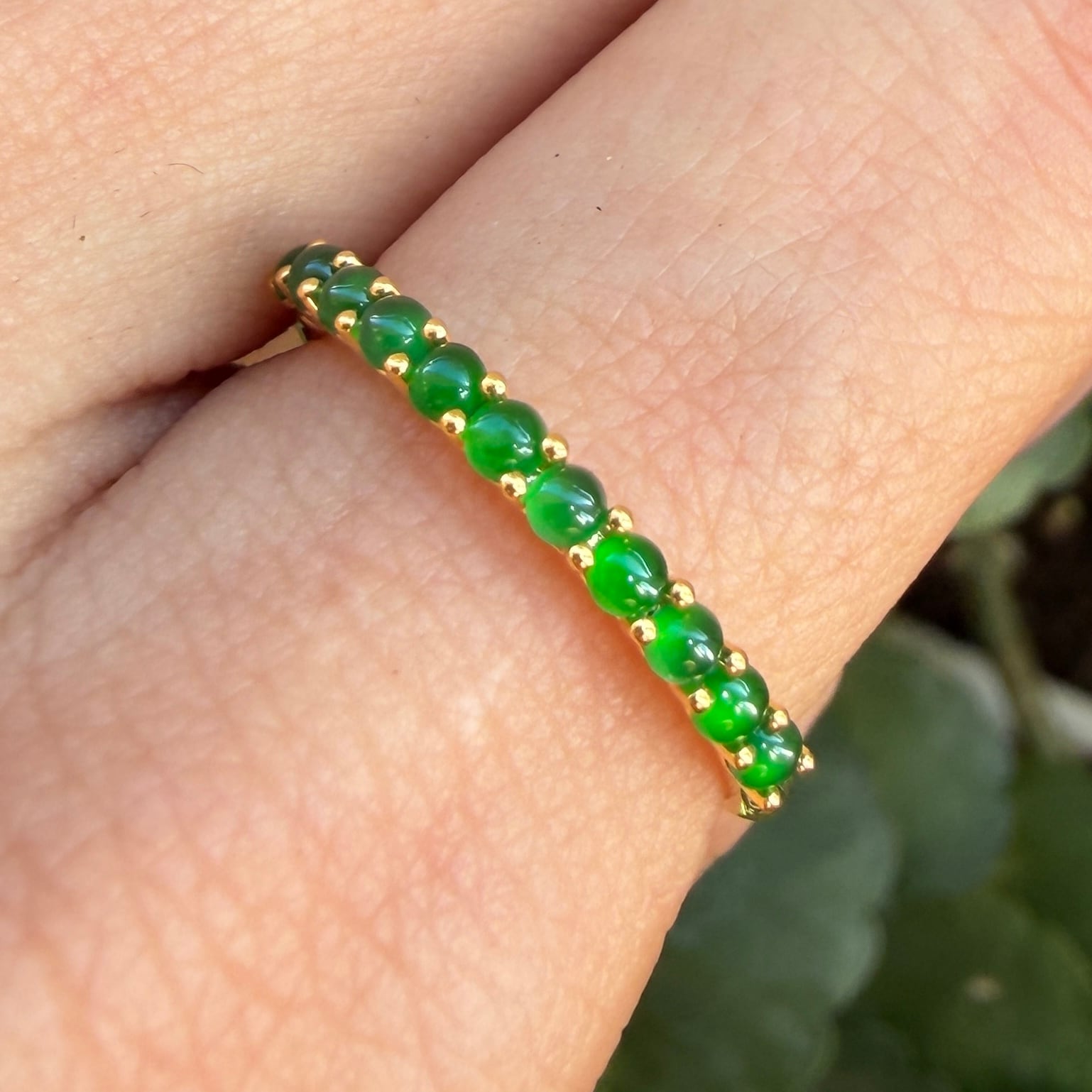 素晴らしい色が特徴の為、この様に小さく磨いても素晴らしい発色でまるで発光しているかの様な美しい緑色が特徴です。天然石でこの様なジュエリーを作る時の苦労はつぶの美しさと、形、色を揃える事。この作業だけであっという間に1日が終わってしまうくらい大変な作業です。そんな苦労を感じさせないくらいうるうるとした瑞々しい緑色のまさに粒よりの翡翠を18金イエローゴールドでリングに仕立ててあります。
