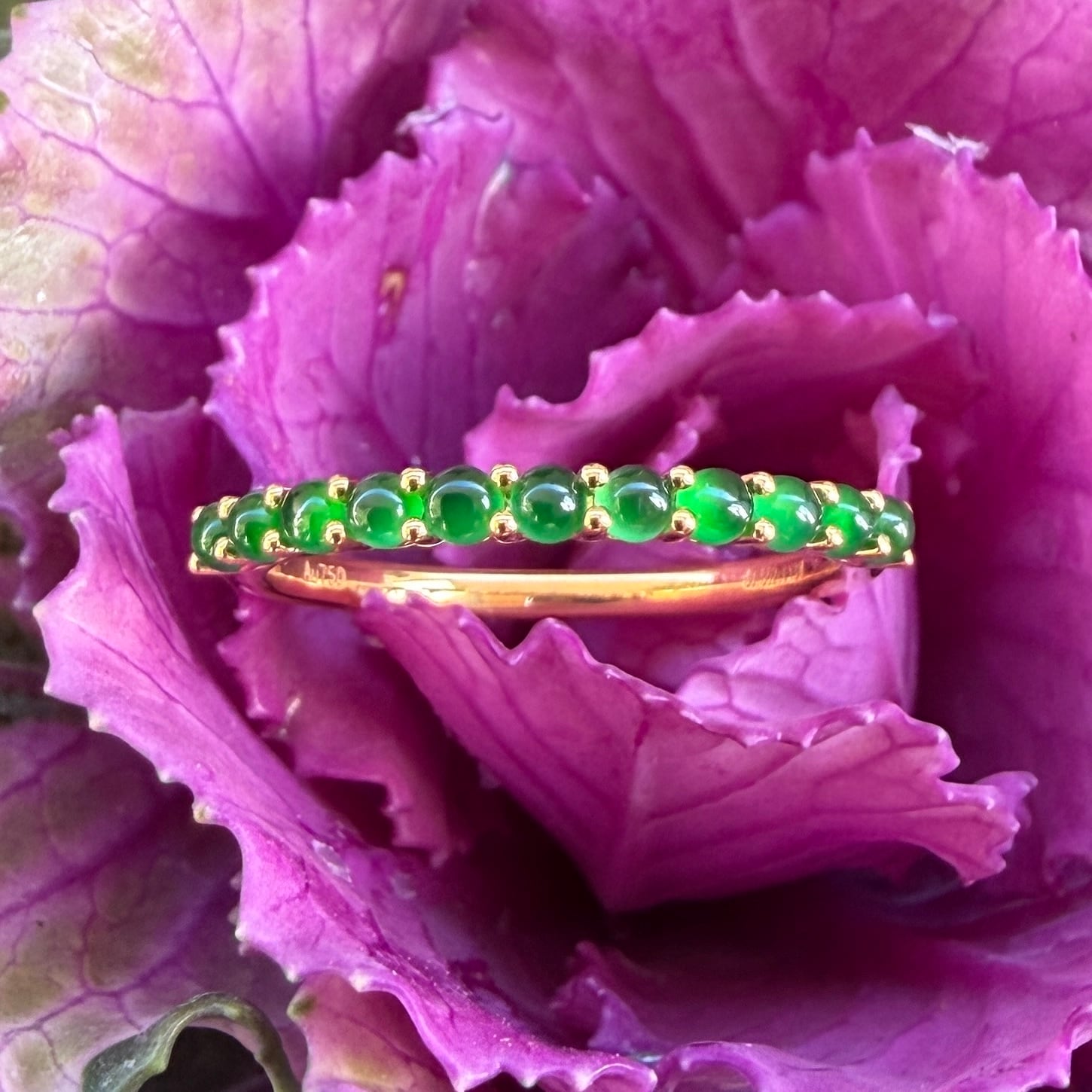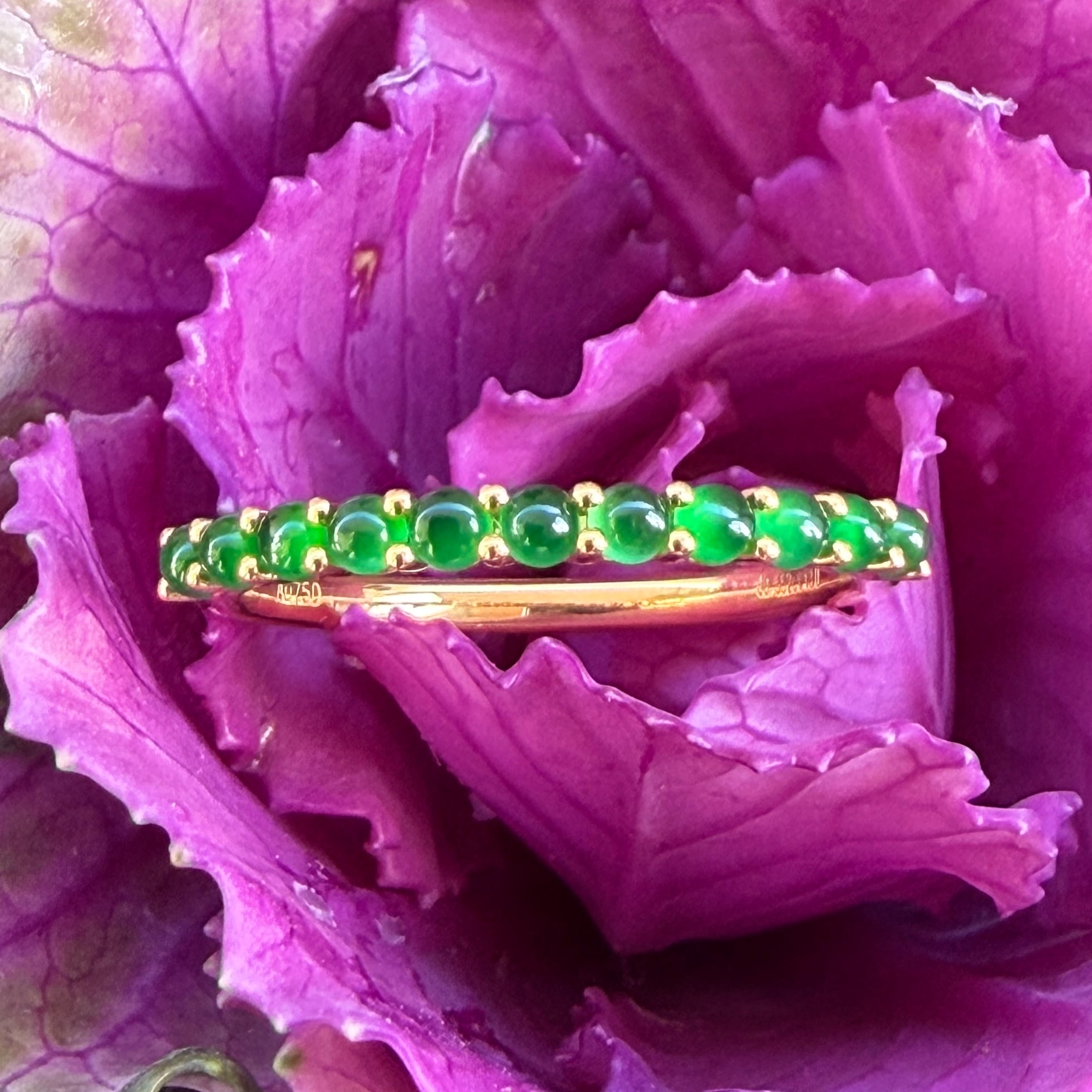 素晴らしい色が特徴の為、この様に小さく磨いても素晴らしい発色でまるで発光しているかの様な美しい緑色が特徴です。天然石でこの様なジュエリーを作る時の苦労はつぶの美しさと、形、色を揃える事。この作業だけであっという間に1日が終わってしまうくらい大変な作業です。そんな苦労を感じさせないくらいうるうるとした瑞々しい緑色のまさに粒よりの翡翠を18金イエローゴールドでリングに仕立ててあります。