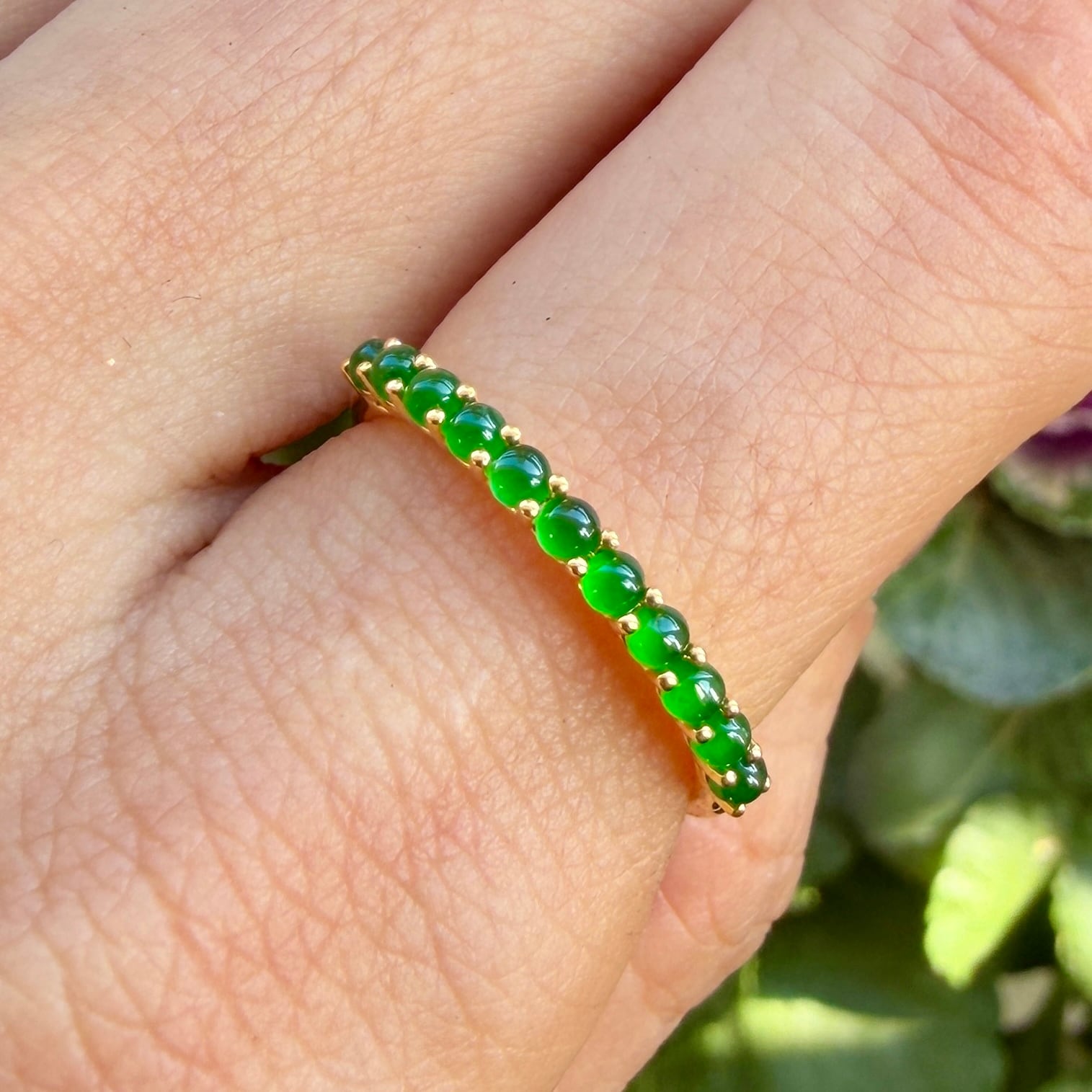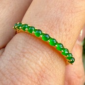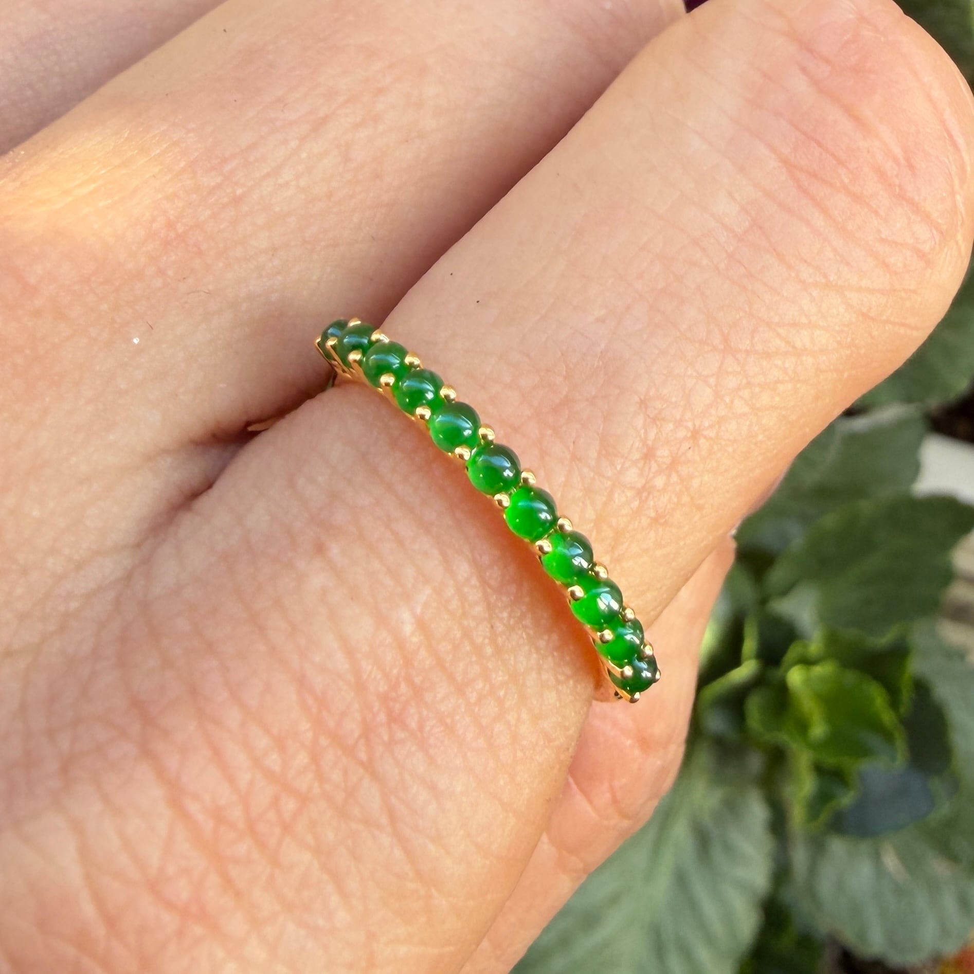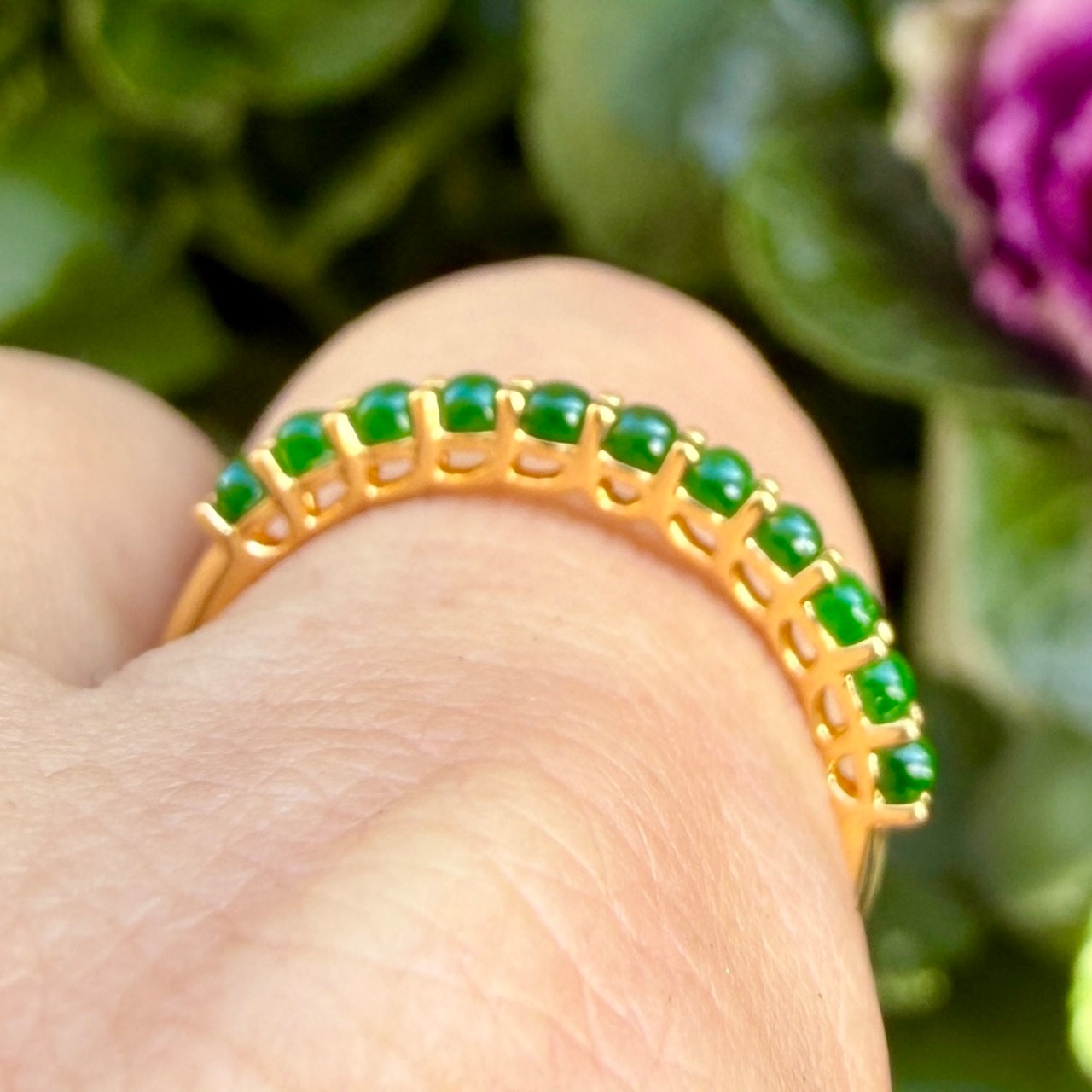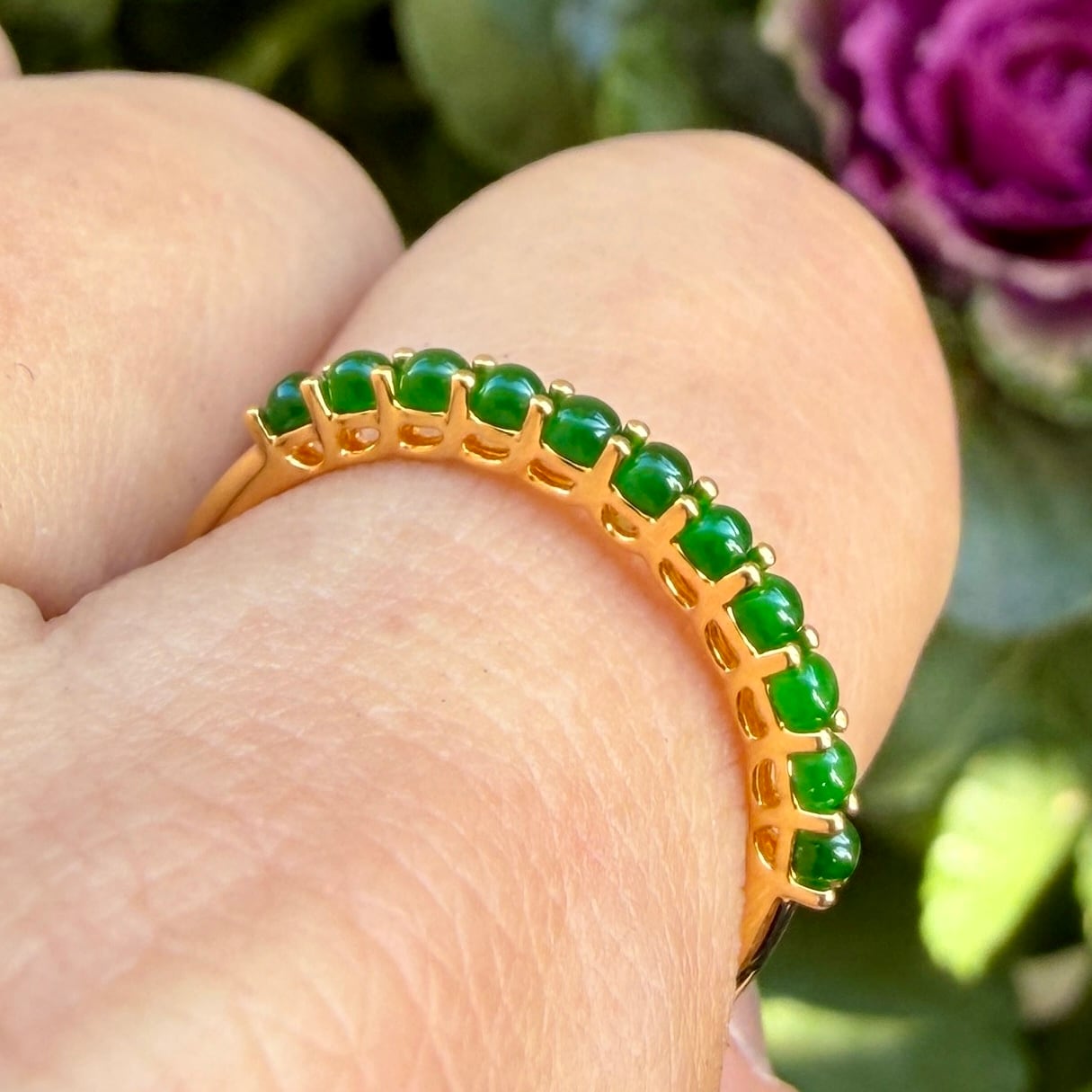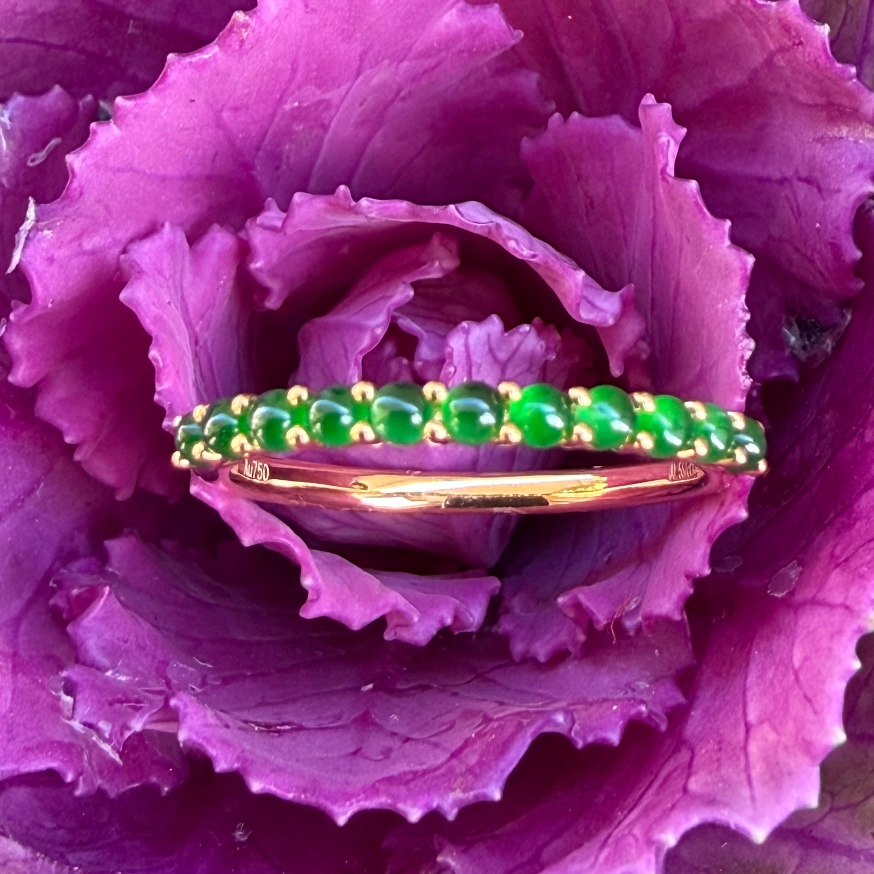 素晴らしい色が特徴の為、この様に小さく磨いても素晴らしい発色でまるで発光しているかの様な美しい緑色が特徴です。天然石でこの様なジュエリーを作る時の苦労はつぶの美しさと、形、色を揃える事。この作業だけであっという間に1日が終わってしまうくらい大変な作業です。そんな苦労を感じさせないくらいうるうるとした瑞々しい緑色のまさに粒よりの翡翠を18金イエローゴールドでリングに仕立ててあります。
