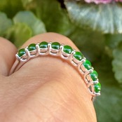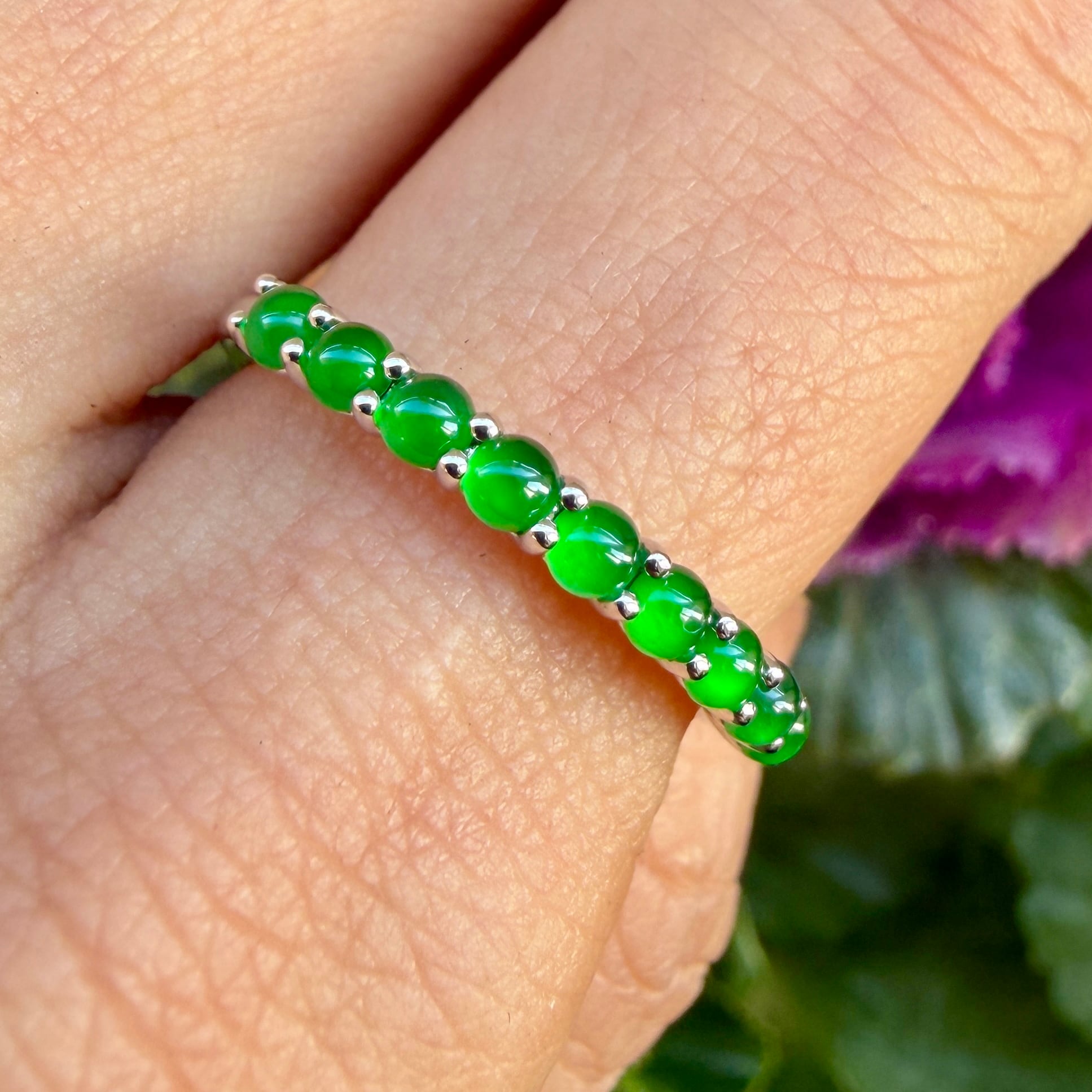 素晴らしい色が特徴の為、この様に小さく磨いても素晴らしい発色でまるで発光しているかの様な美しい緑色が特徴です。天然石でこの様なジュエリーを作る時の苦労はつぶの美しさと、形、色を揃える事。この作業だけであっという間に1日が終わってしまうくらい大変な作業です。そんな苦労を感じさせないくらいうるうるとした瑞々しい緑色のまさに粒よりの翡翠を18金ホワイトーゴールドでリングに仕立ててあります。