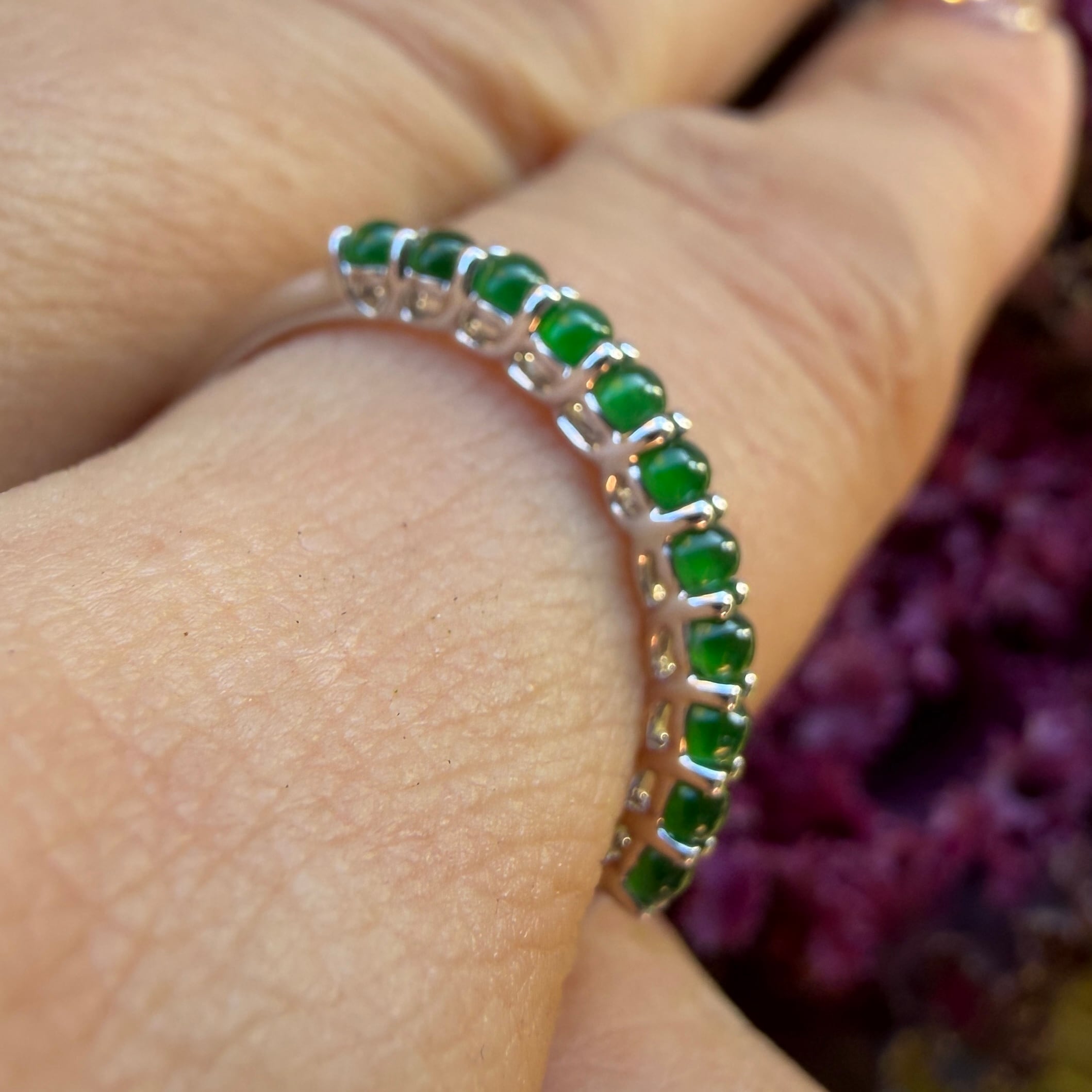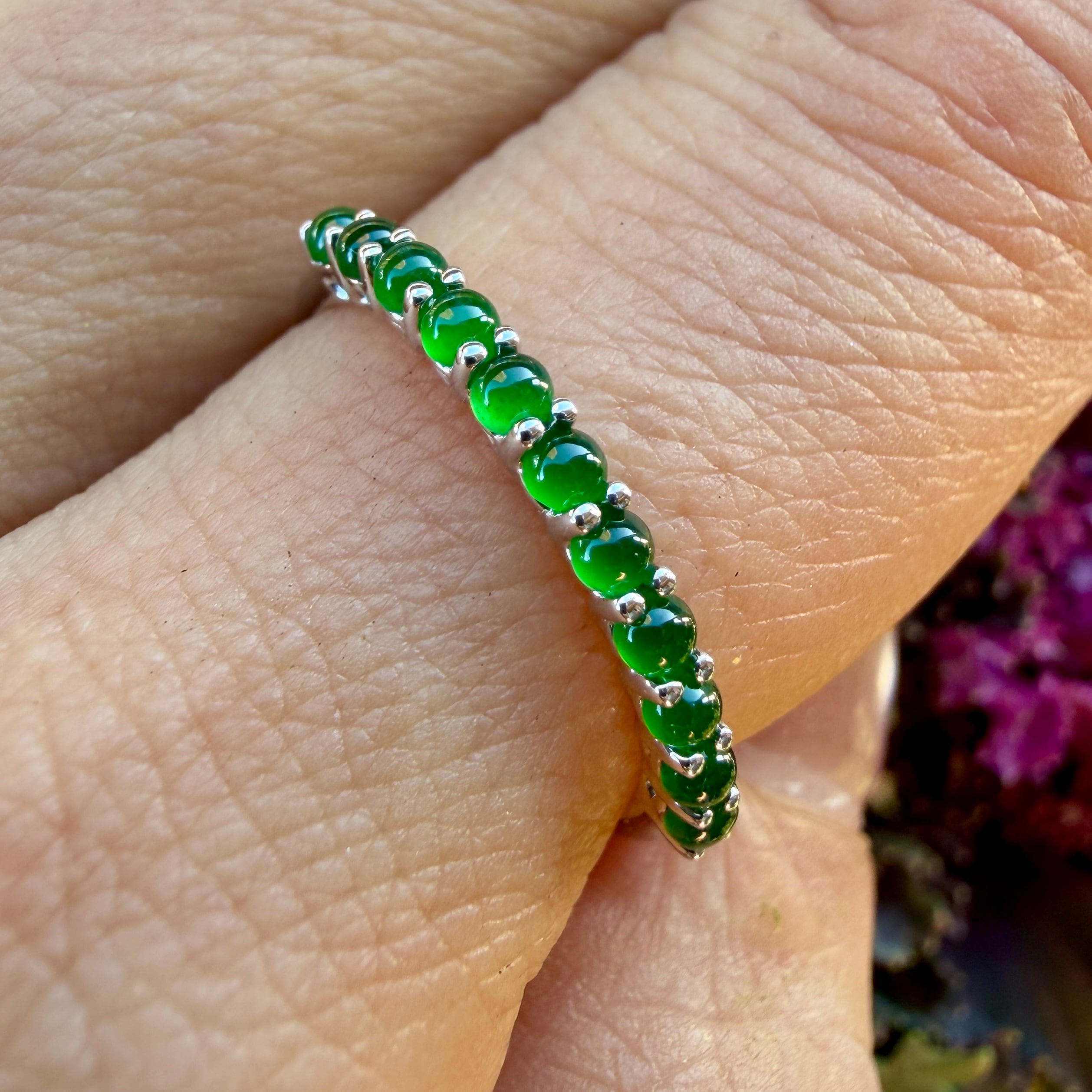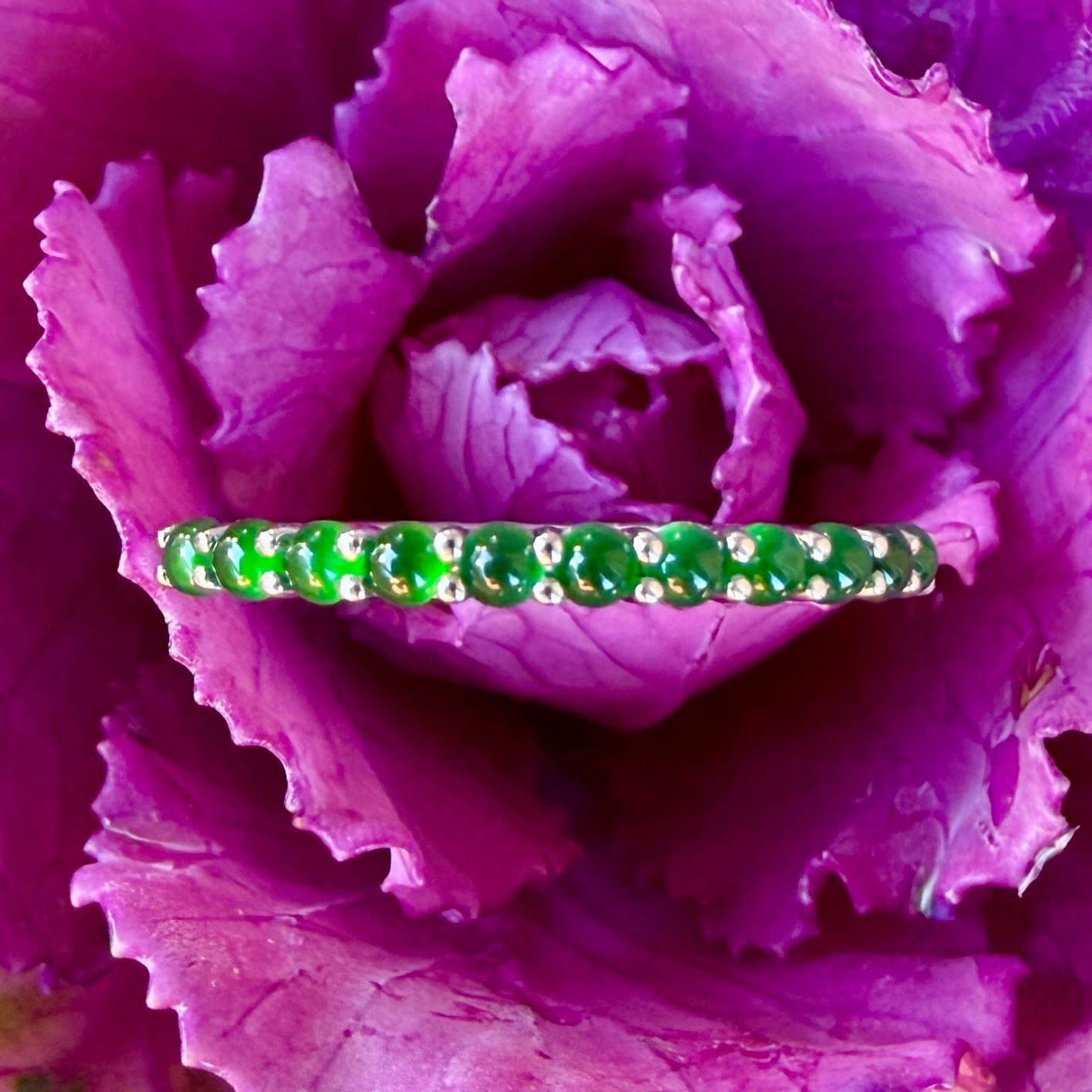 翡翠の中でも特に美しいとされる「琅玕(ろうかん)」は、しっとりとした透明感と、奥深い緑色が魅力の特別な翡翠です。その美しさは古来より「玉の中の玉」と称えられ、見る人の心をとらえて離しません。そんな琅玕翡翠の中でも粒よりの美しい翡翠を11石使い18金ホワイトゴールドにセットしたリングです。