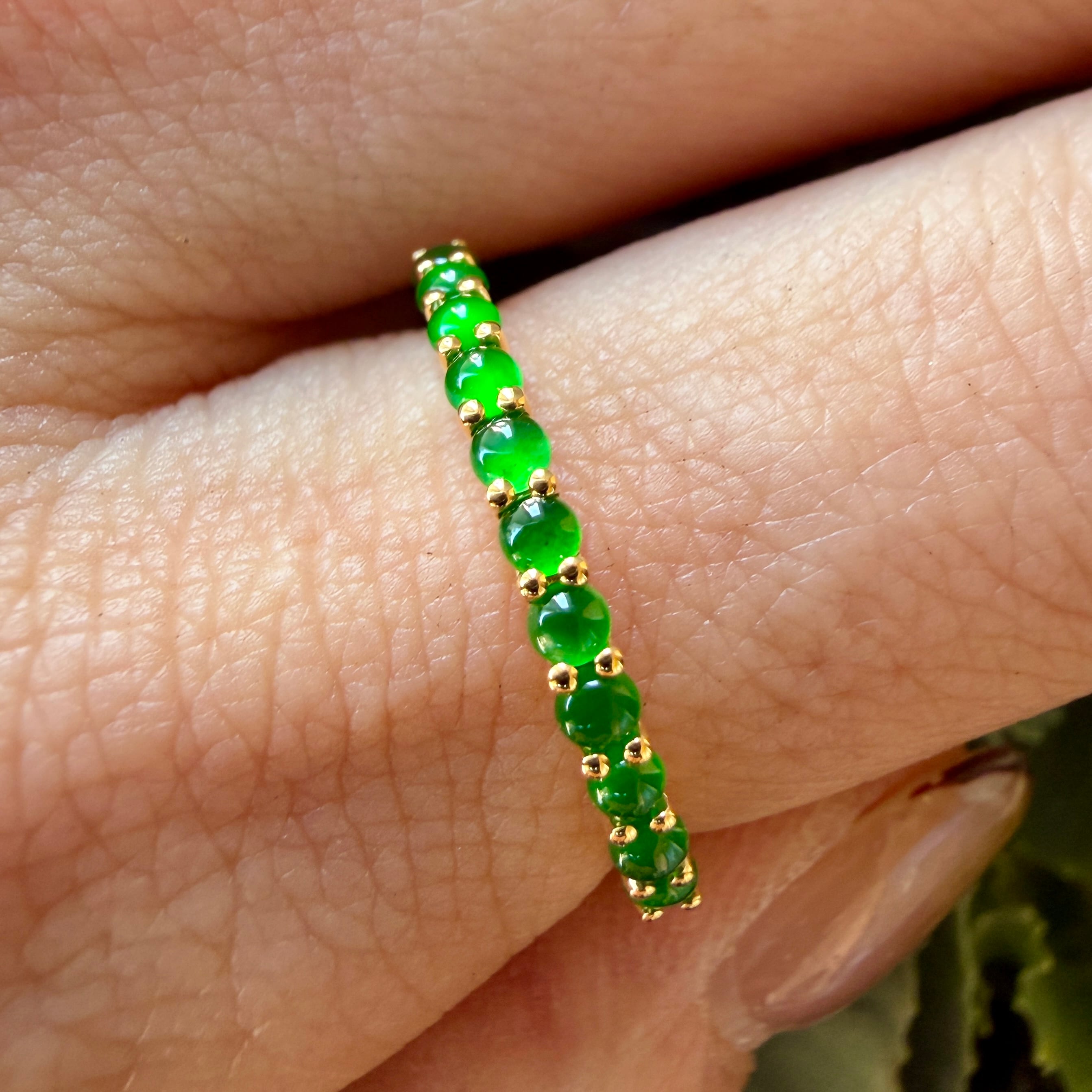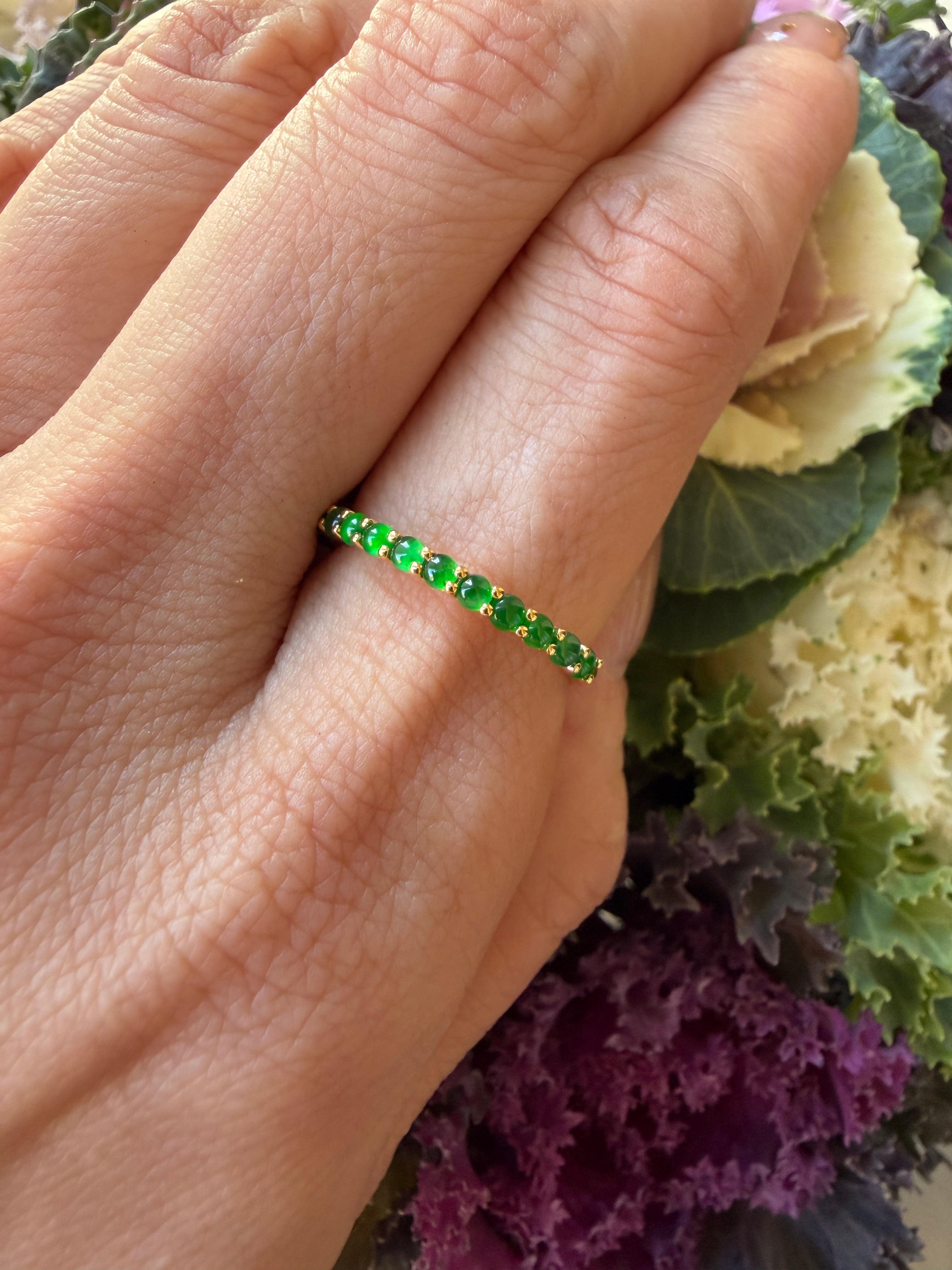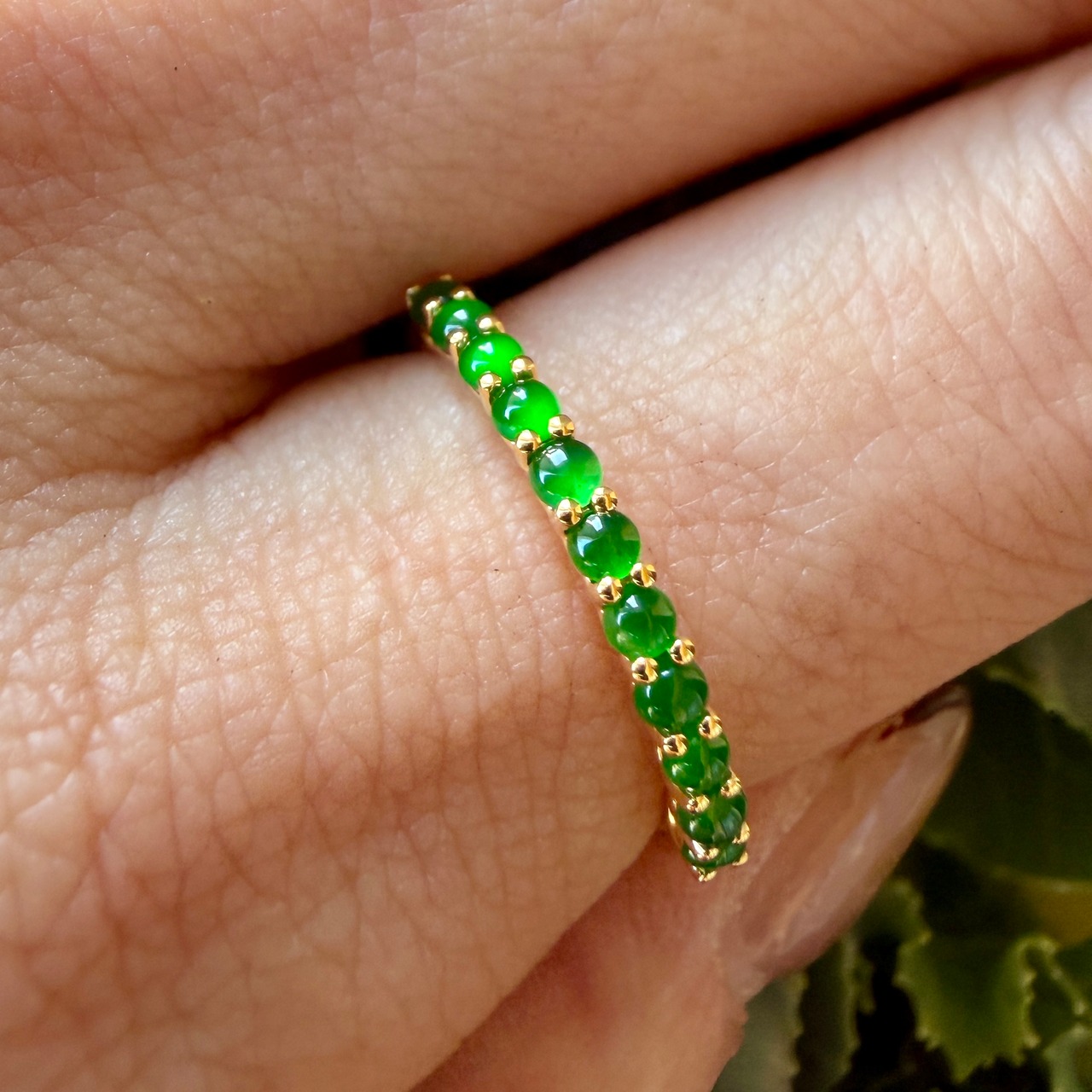 素晴らしい色が特徴の為、この様に小さく磨いても素晴らしい発色でまるで発光しているかの様な美しい緑色が特徴です。天然石でこの様なジュエリーを作る時の苦労はつぶの美しさと、形、色を揃える事。この作業だけであっという間に1日が終わってしまうくらい大変な作業です。そんな苦労を感じさせないくらいうるうるとした瑞々しい緑色のまさに粒よりの翡翠を18金イエローゴールドでリングに仕立ててあります。
