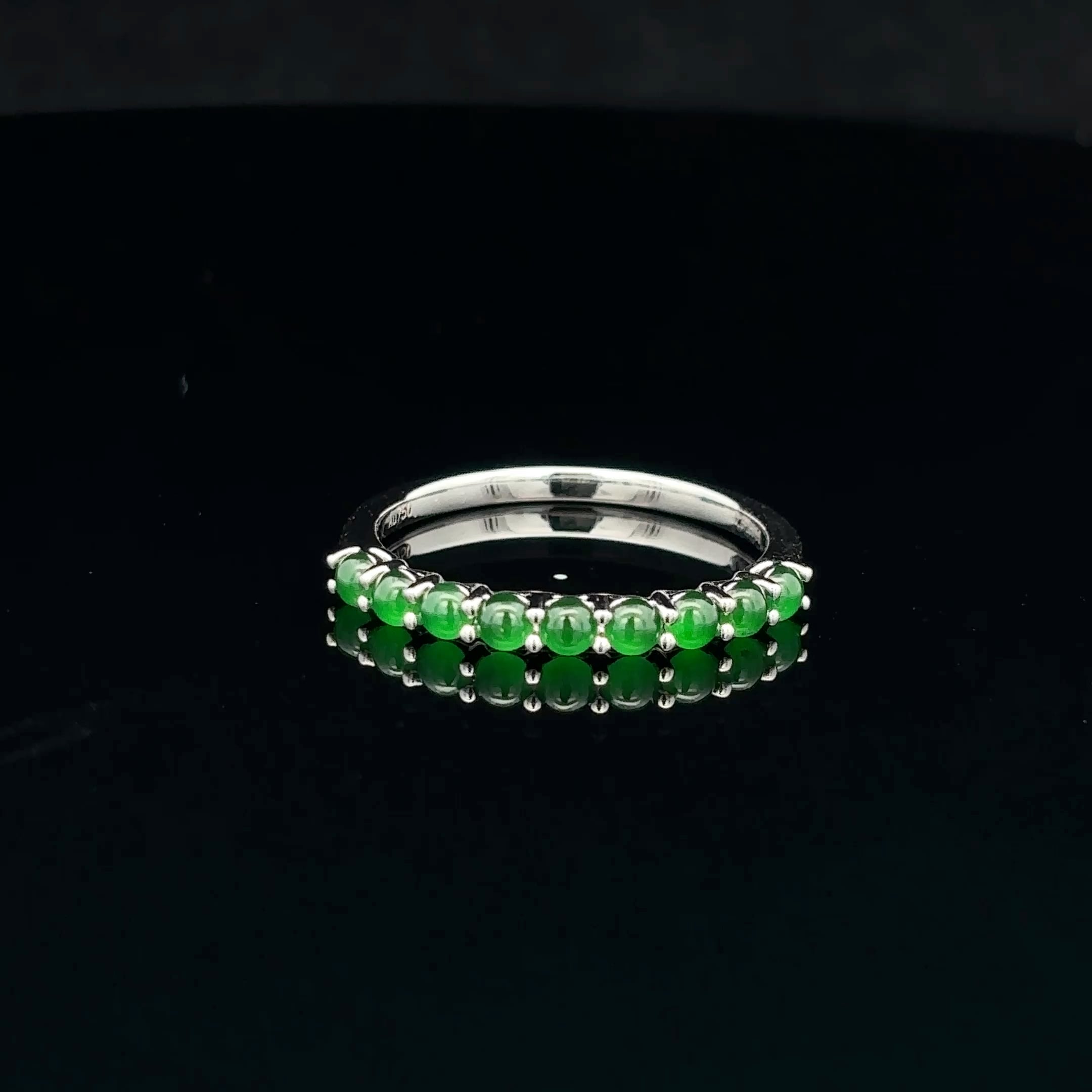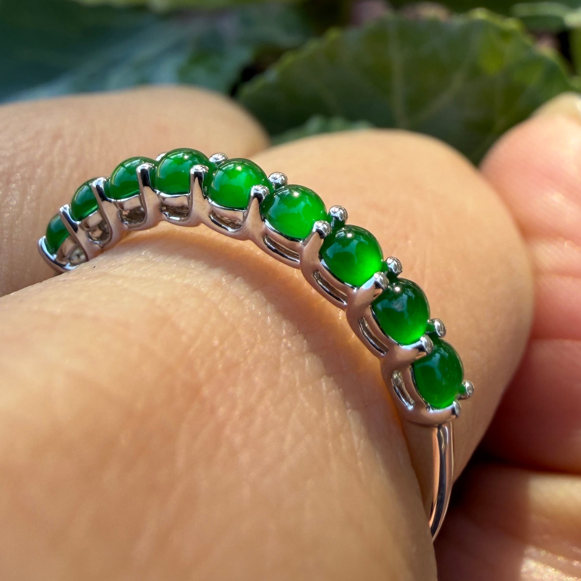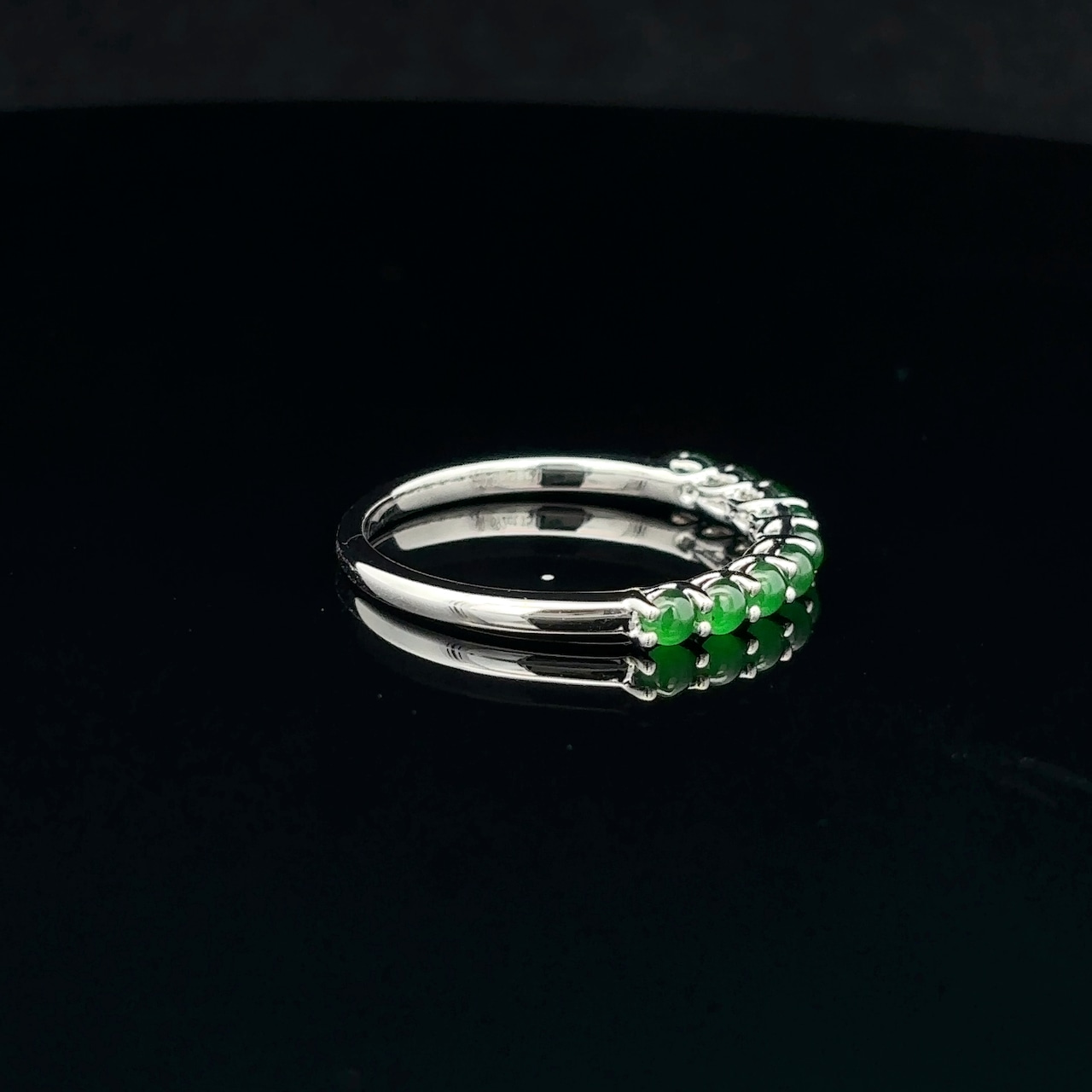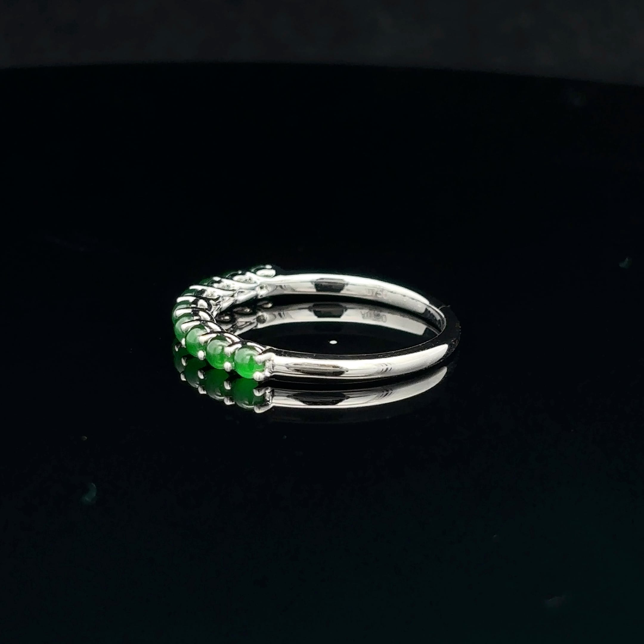 素晴らしい色が特徴の為、この様に小さく磨いても素晴らしい発色でまるで発光しているかの様な美しい緑色が特徴です。天然石でこの様なジュエリーを作る時の苦労はつぶの美しさと、形、色を揃える事。この作業だけであっという間に1日が終わってしまうくらい大変な作業です。そんな苦労を感じさせないくらいうるうるとした瑞々しい緑色のまさに粒よりの翡翠を18金ホワイトゴールドでリングに仕立ててあります。