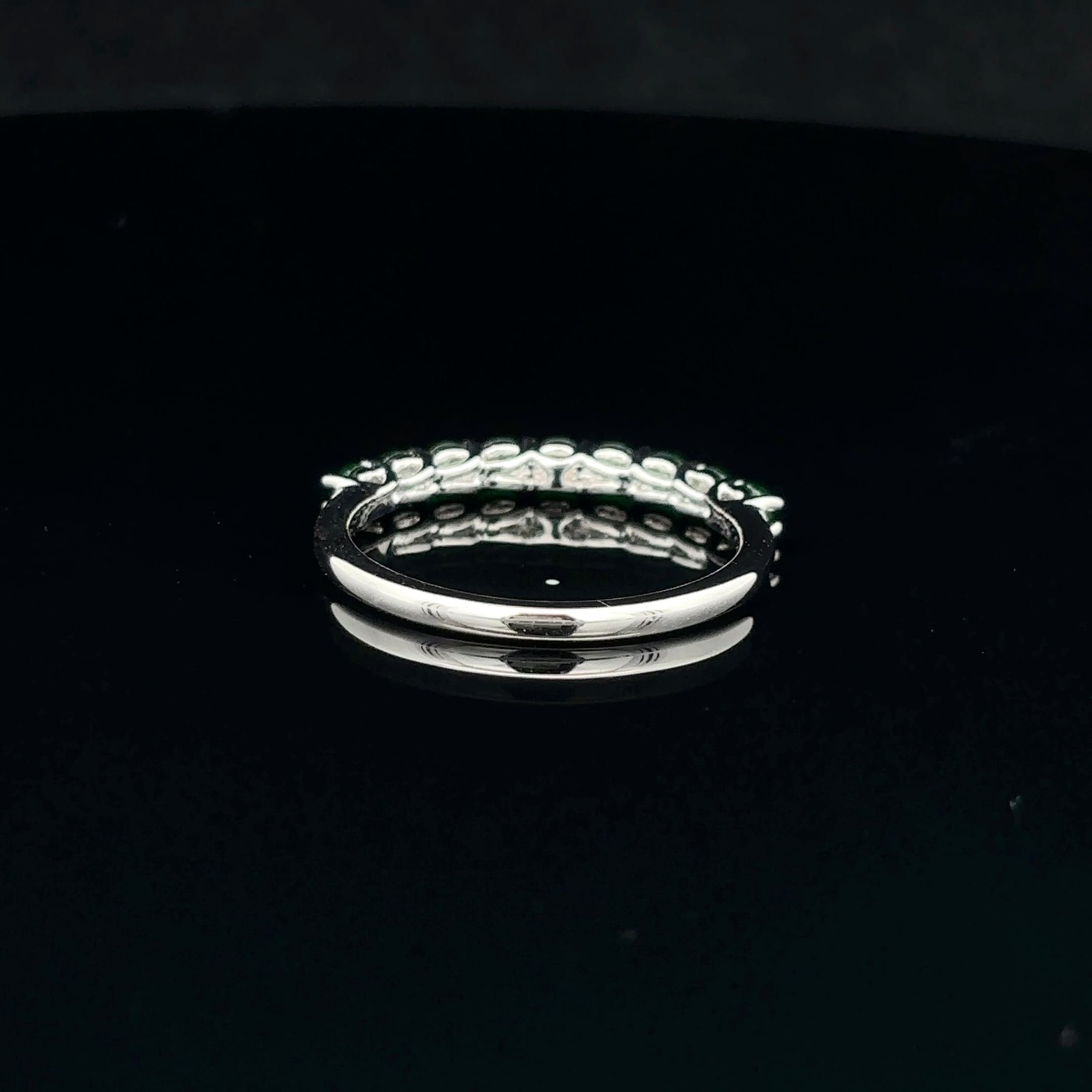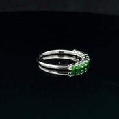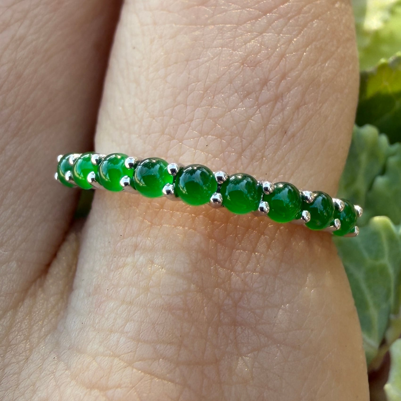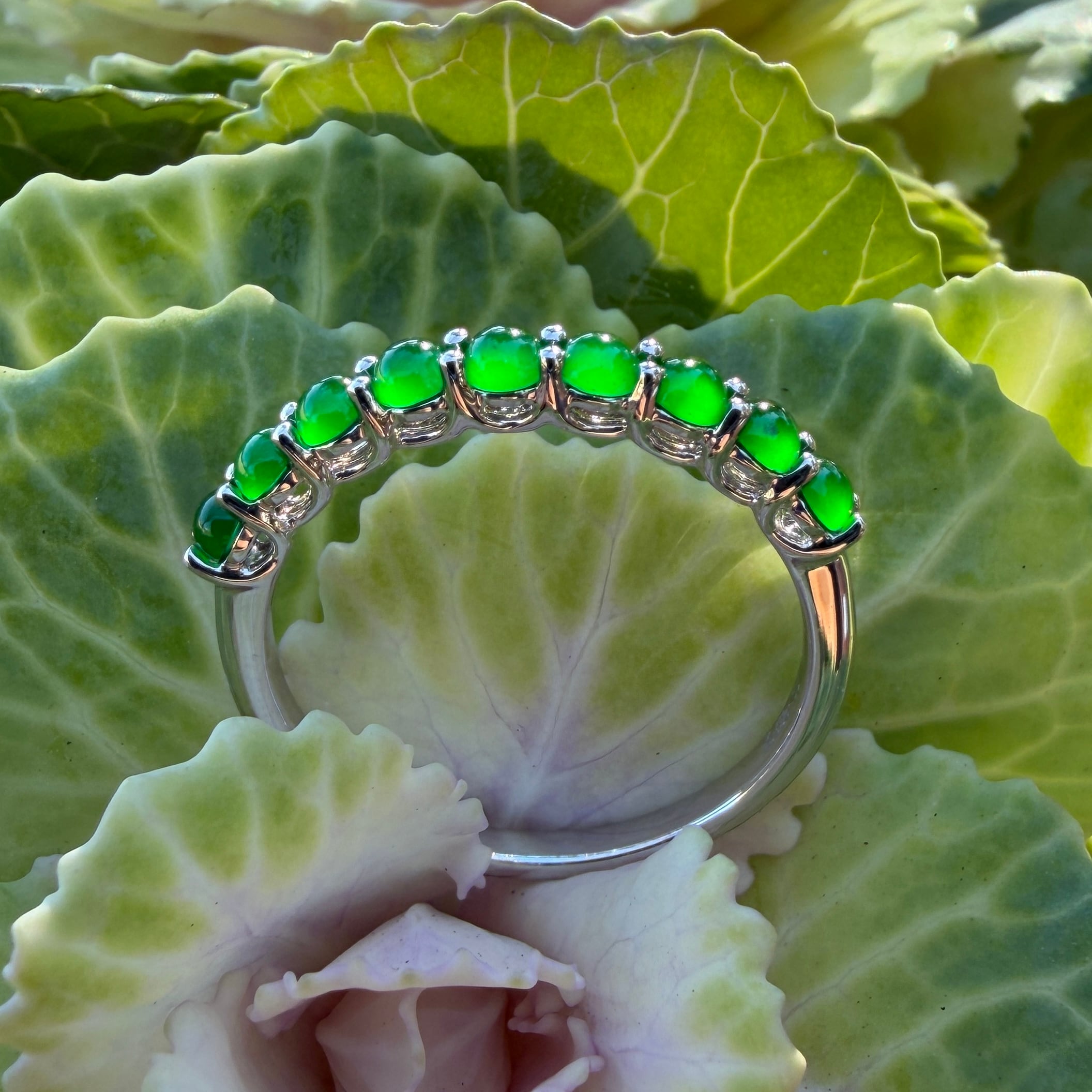 素晴らしい色が特徴の為、この様に小さく磨いても素晴らしい発色でまるで発光しているかの様な美しい緑色が特徴です。天然石でこの様なジュエリーを作る時の苦労はつぶの美しさと、形、色を揃える事。この作業だけであっという間に1日が終わってしまうくらい大変な作業です。そんな苦労を感じさせないくらいうるうるとした瑞々しい緑色のまさに粒よりの翡翠を18金ホワイトゴールドでリングに仕立ててあります。