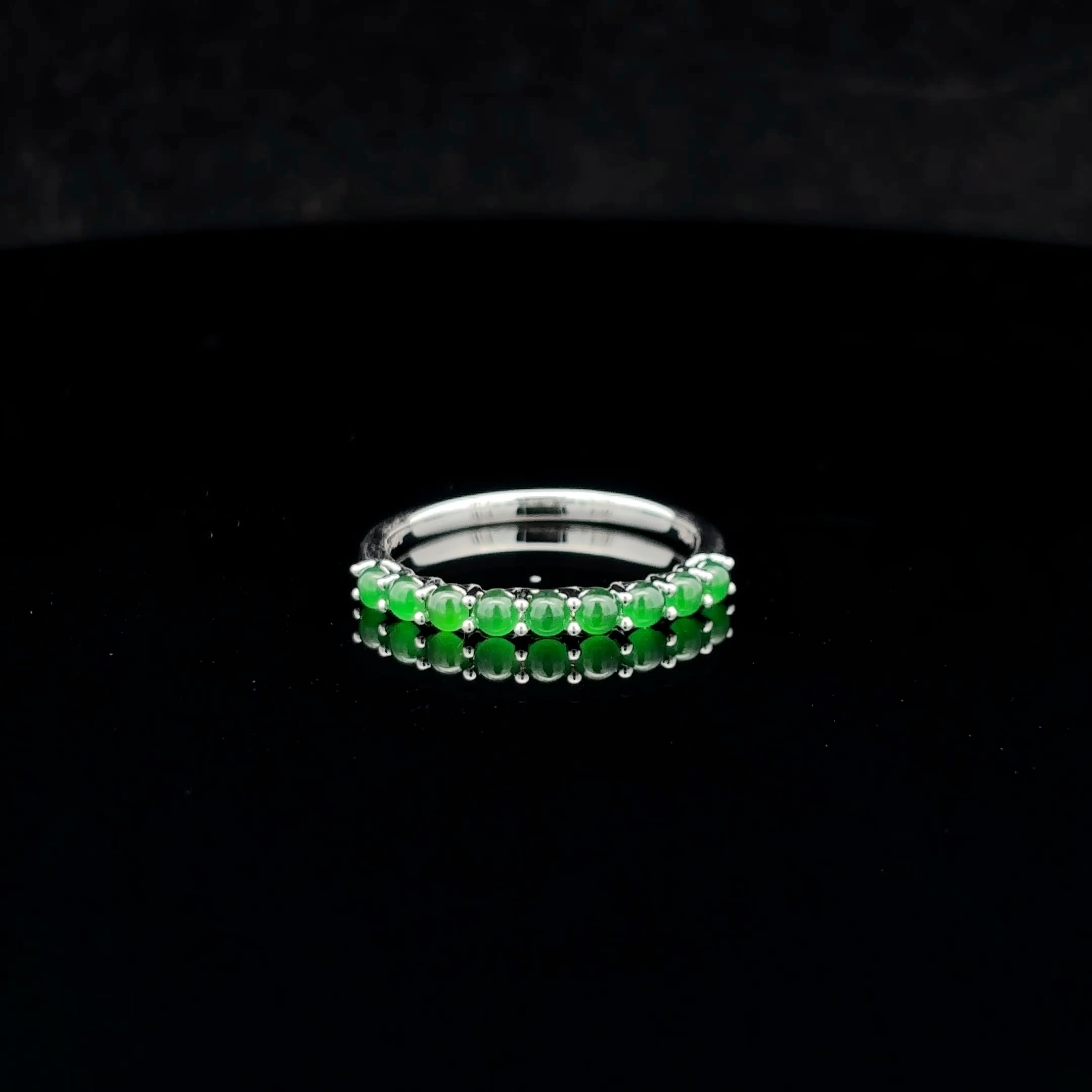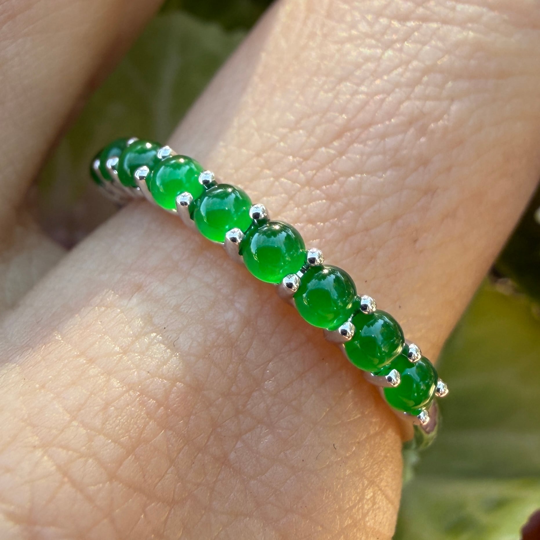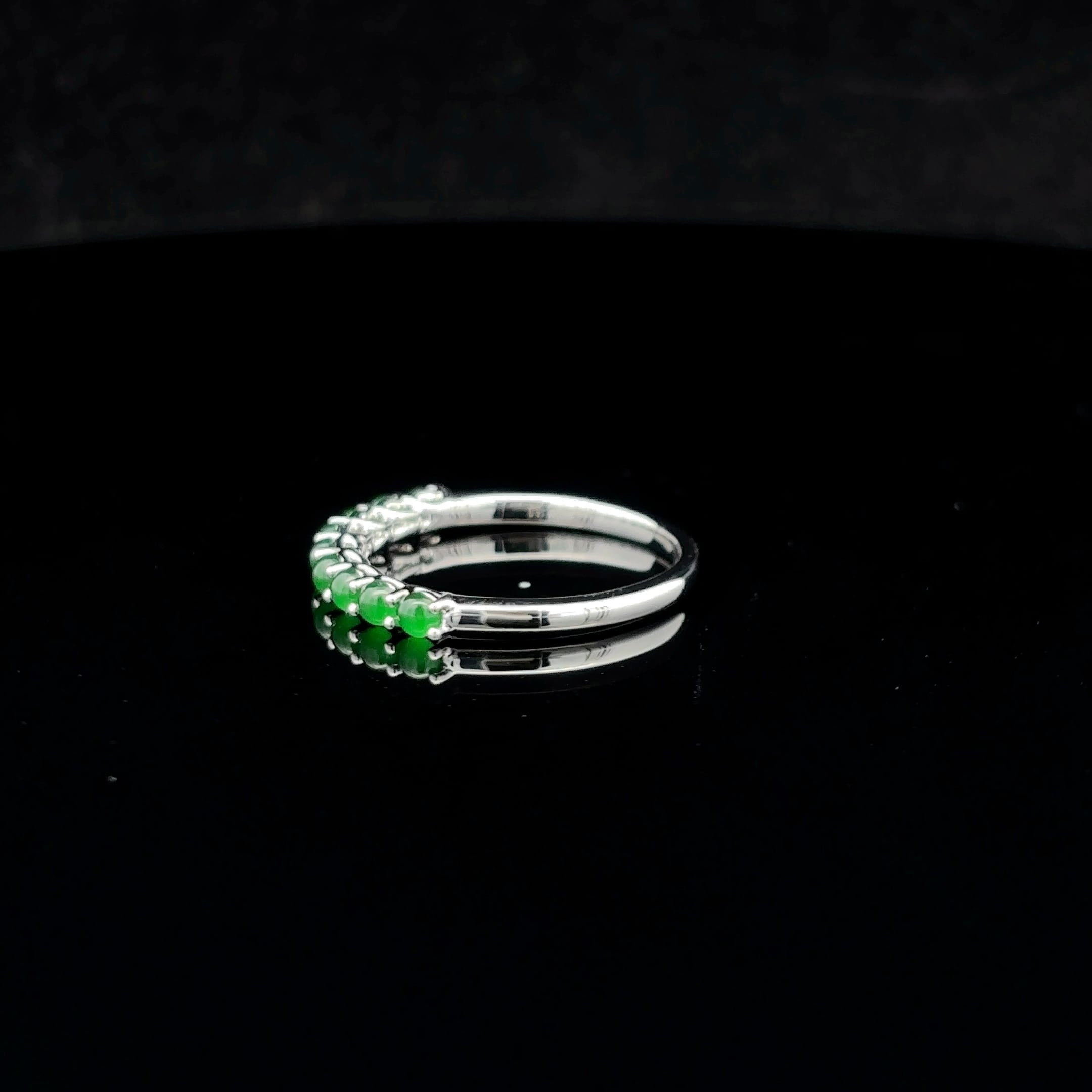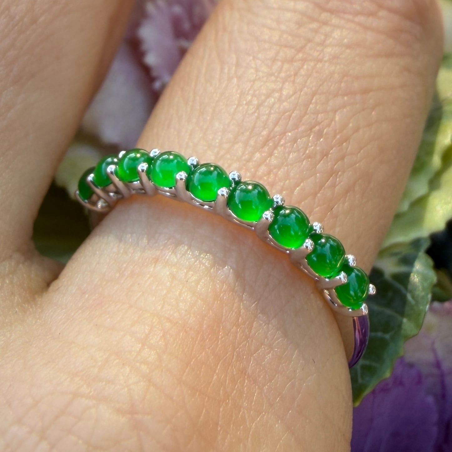 素晴らしい色が特徴の為、この様に小さく磨いても素晴らしい発色でまるで発光しているかの様な美しい緑色が特徴です。天然石でこの様なジュエリーを作る時の苦労はつぶの美しさと、形、色を揃える事。この作業だけであっという間に1日が終わってしまうくらい大変な作業です。そんな苦労を感じさせないくらいうるうるとした瑞々しい緑色のまさに粒よりの翡翠を18金ホワイトーゴールドでリングに仕立ててあります。