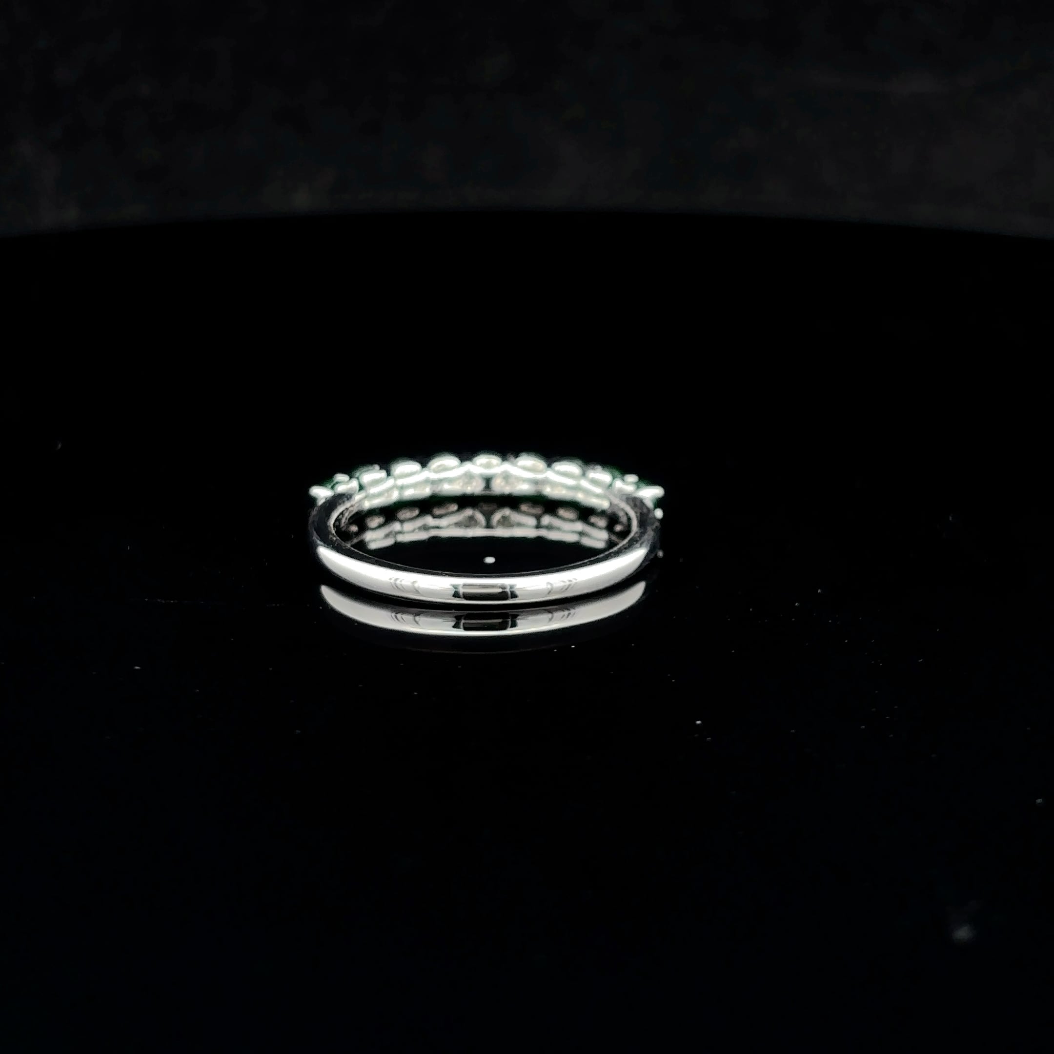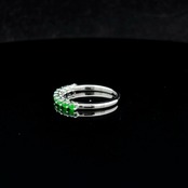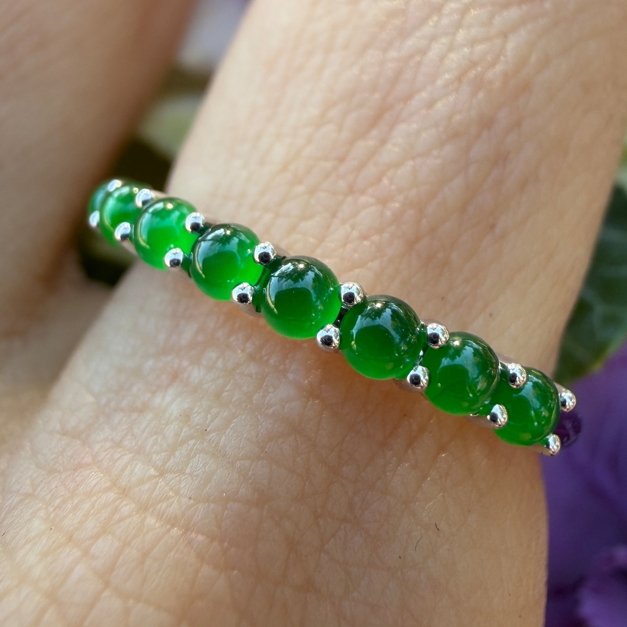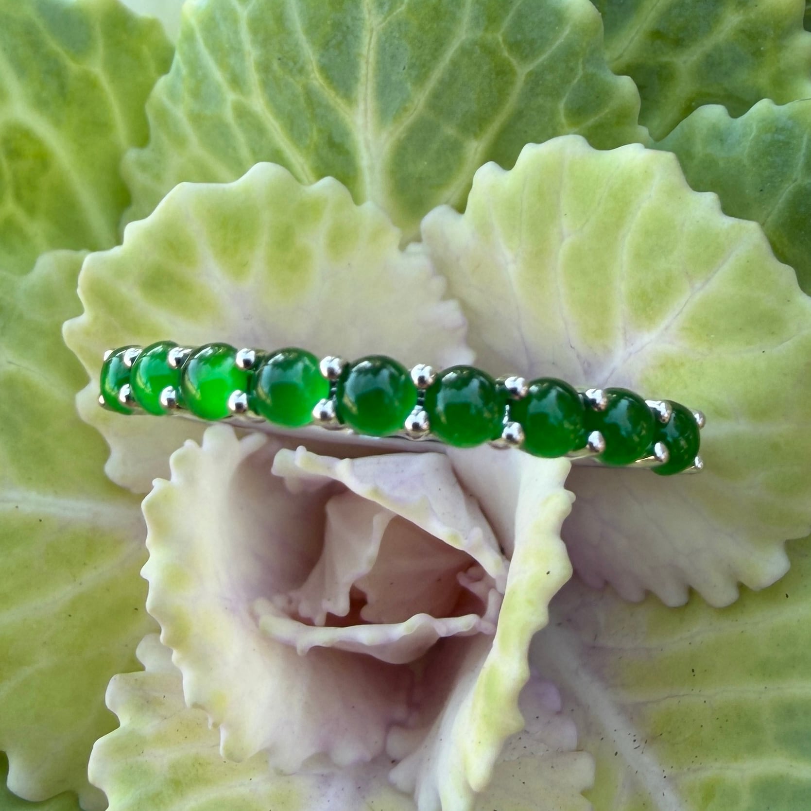 素晴らしい色が特徴の為、この様に小さく磨いても素晴らしい発色でまるで発光しているかの様な美しい緑色が特徴です。天然石でこの様なジュエリーを作る時の苦労はつぶの美しさと、形、色を揃える事。この作業だけであっという間に1日が終わってしまうくらい大変な作業です。そんな苦労を感じさせないくらいうるうるとした瑞々しい緑色のまさに粒よりの翡翠を18金ホワイトーゴールドでリングに仕立ててあります。