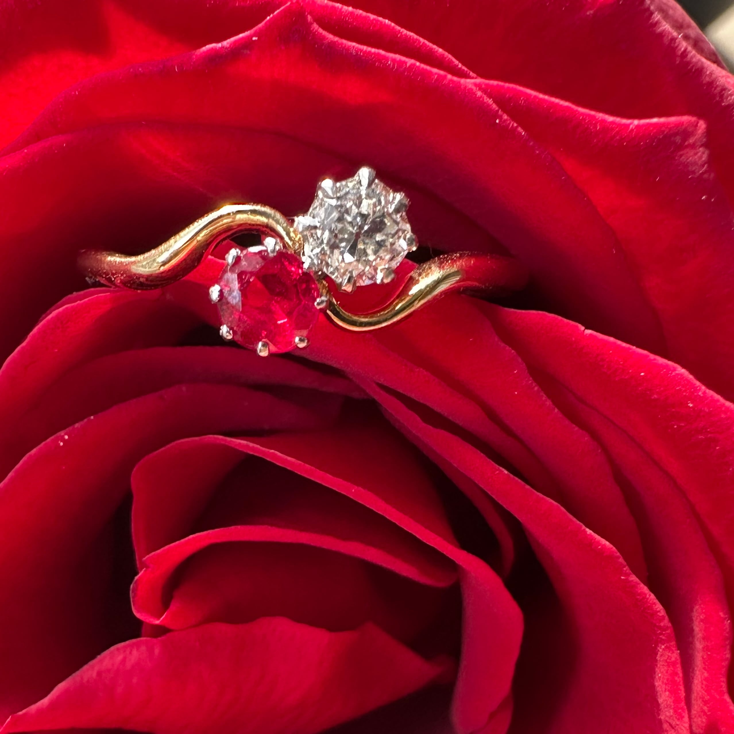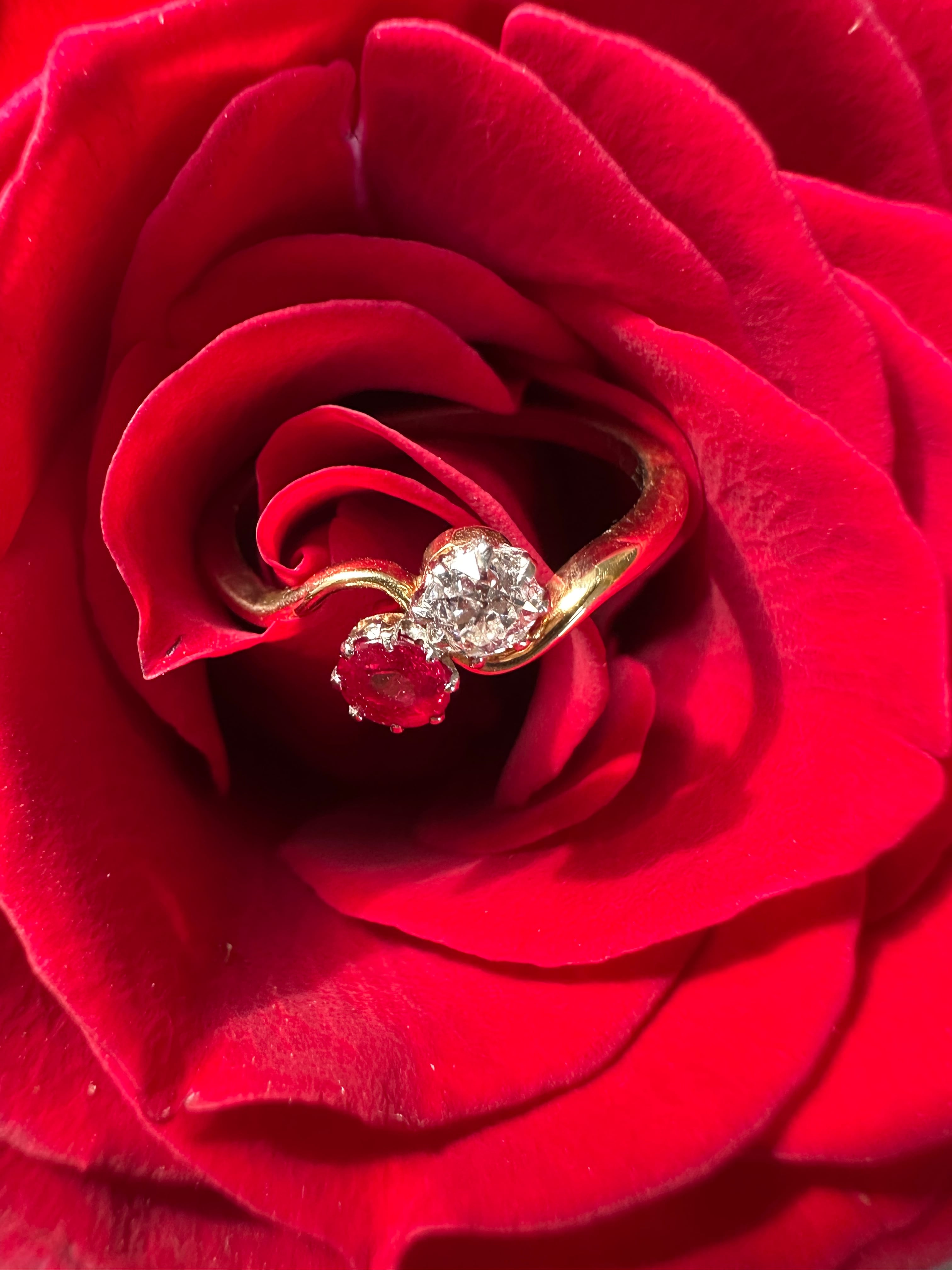 このようなロマンチックなトワ・エ・モワスタイルのリングはエレガントな時代と言われるエドワーディアン時代に大流行し、ファッションとしてだけでなく、エンゲージリングとしてもこの二つの石が向き合ったデザインが使われたそうです。ルビーは希少なビルマ産非加熱と思われるルビーで写真よりも華やかなホットレッドが美しくで白いダイヤモンドとの対比が美しいリングです。
