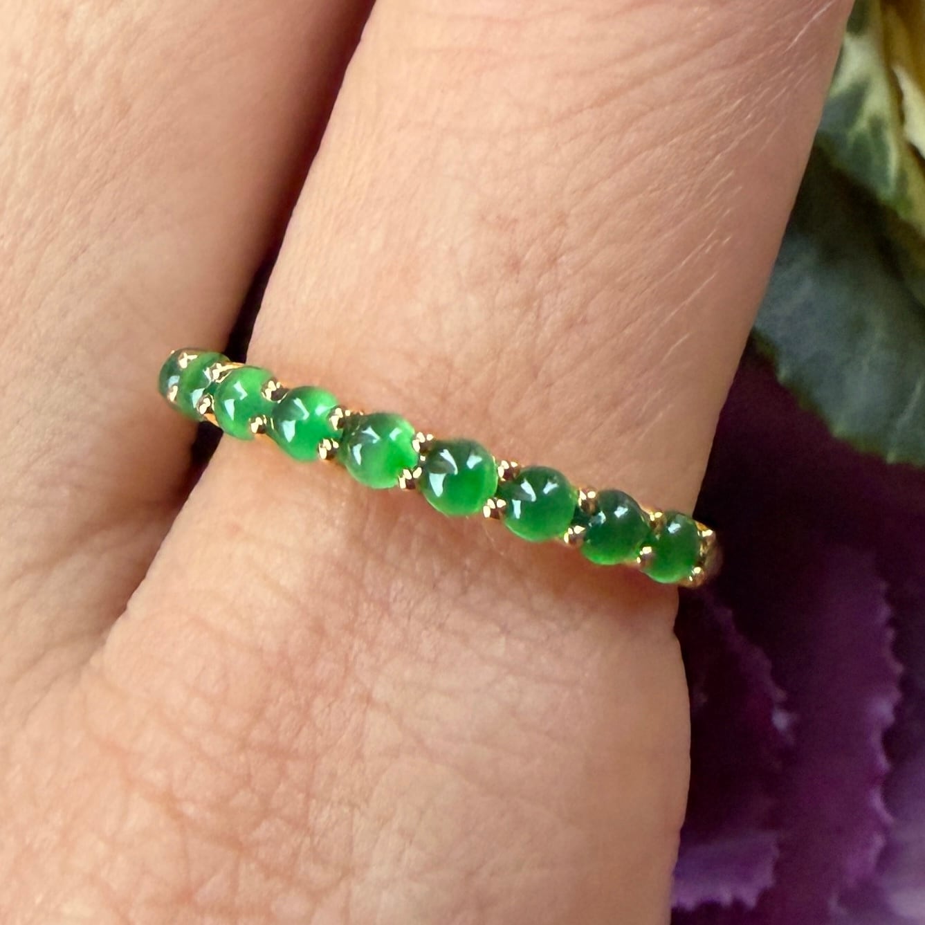 素晴らしい色が特徴の為、この様に小さく磨いても素晴らしい発色でまるで発光しているかの様な美しい緑色が特徴です。天然石でこの様なジュエリーを作る時の苦労はつぶの美しさと、形、色を揃える事。この作業だけであっという間に1日が終わってしまうくらい大変な作業です。そんな苦労を感じさせないくらいうるうるとした瑞々しい緑色のまさに粒よりの翡翠を18金イエローゴールドでリングに仕立ててあります。