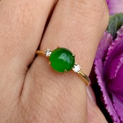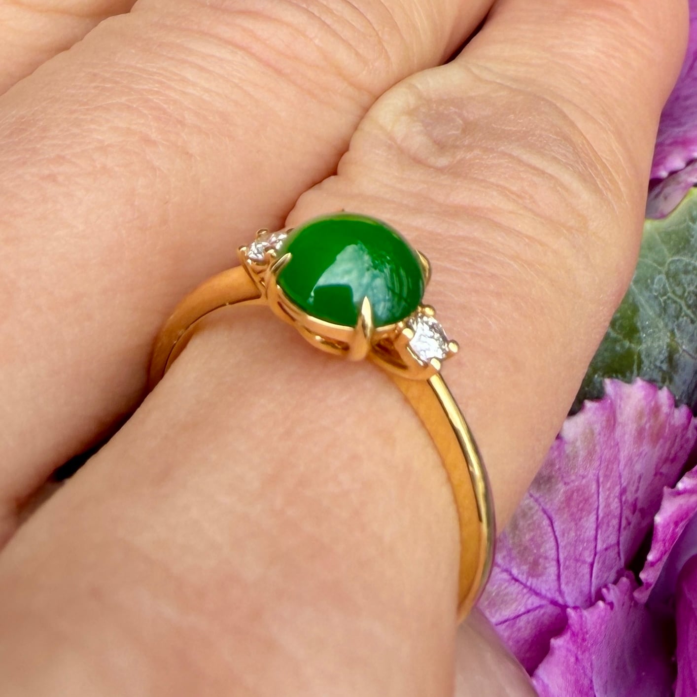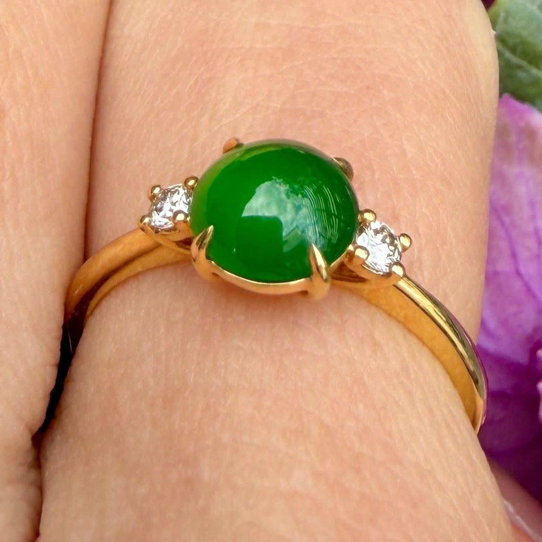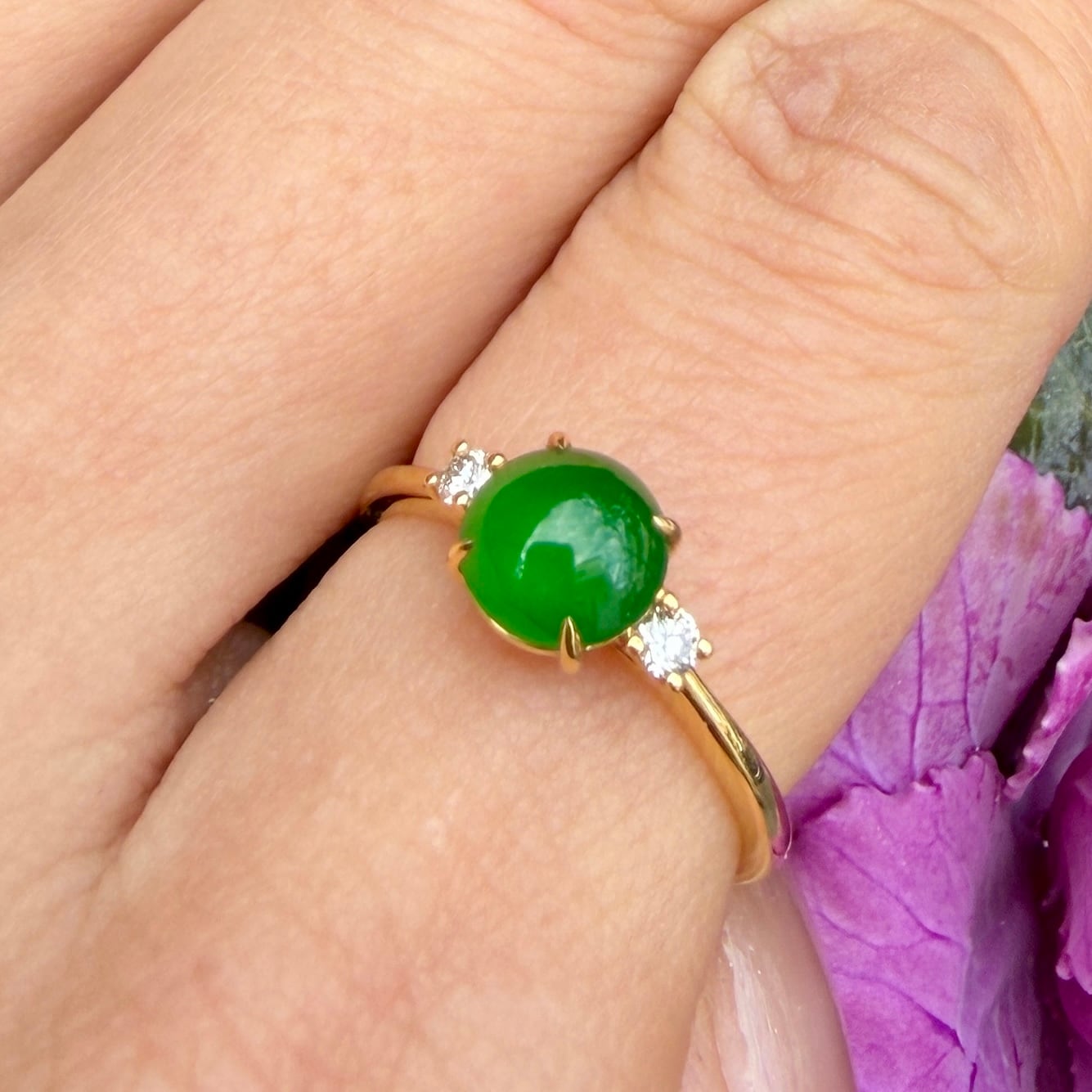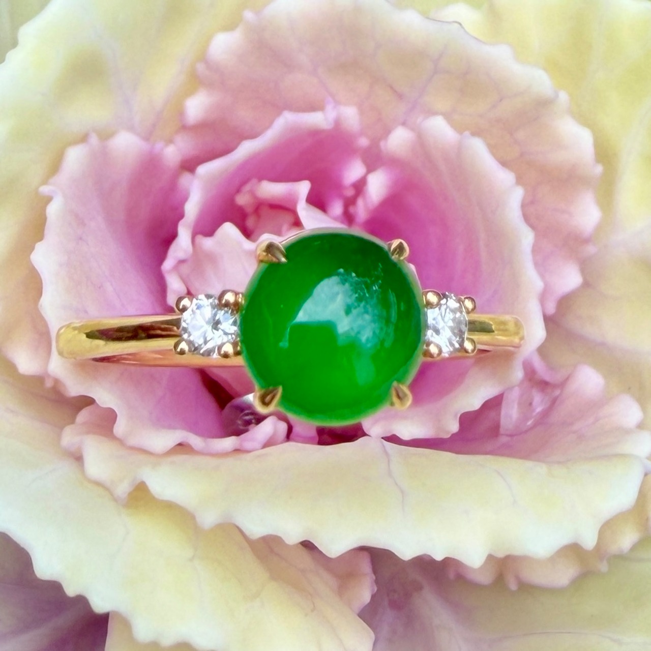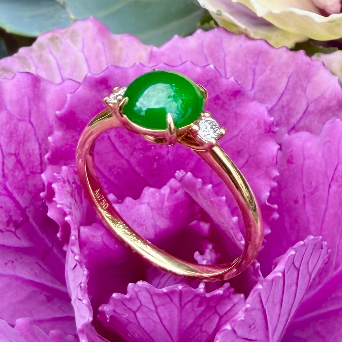 見ているだけで口元が緩み笑みが溢れてしまうリングです。山椒は小粒でもピリリと辛い!と言ってこの翡翠の例えでこの美しい緑の石を食べ物にして表現したかの様な言葉だと思っていましたが、この大粒の緑はまさに心臓をギュッと刺すような迫力の美しさの石で出張先でこの濃い緑の大粒の翡翠を使った指輪を見つけた時にはドキドキする様な感動がおきました。