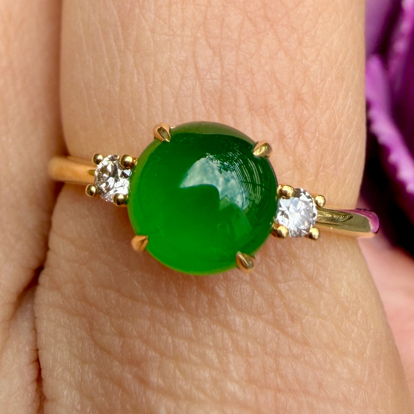 圧巻!の大粒の翡翠をシンプルなゴールドと小粒のダイヤモンドの枠にセットしたある意味とても潔いシンプルなデザイン。