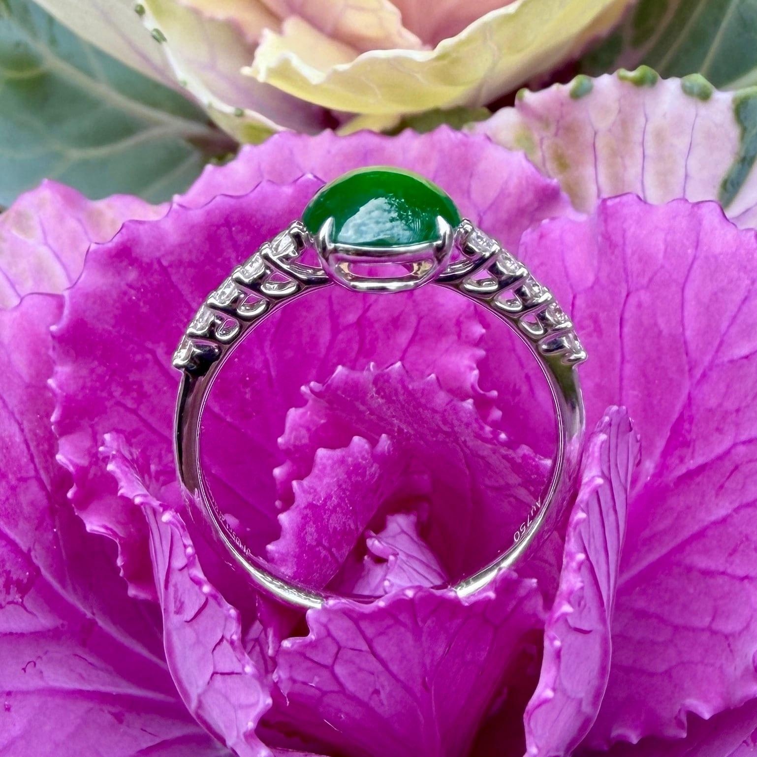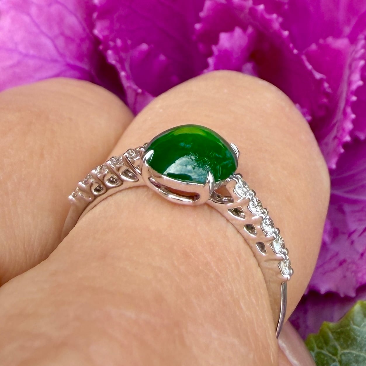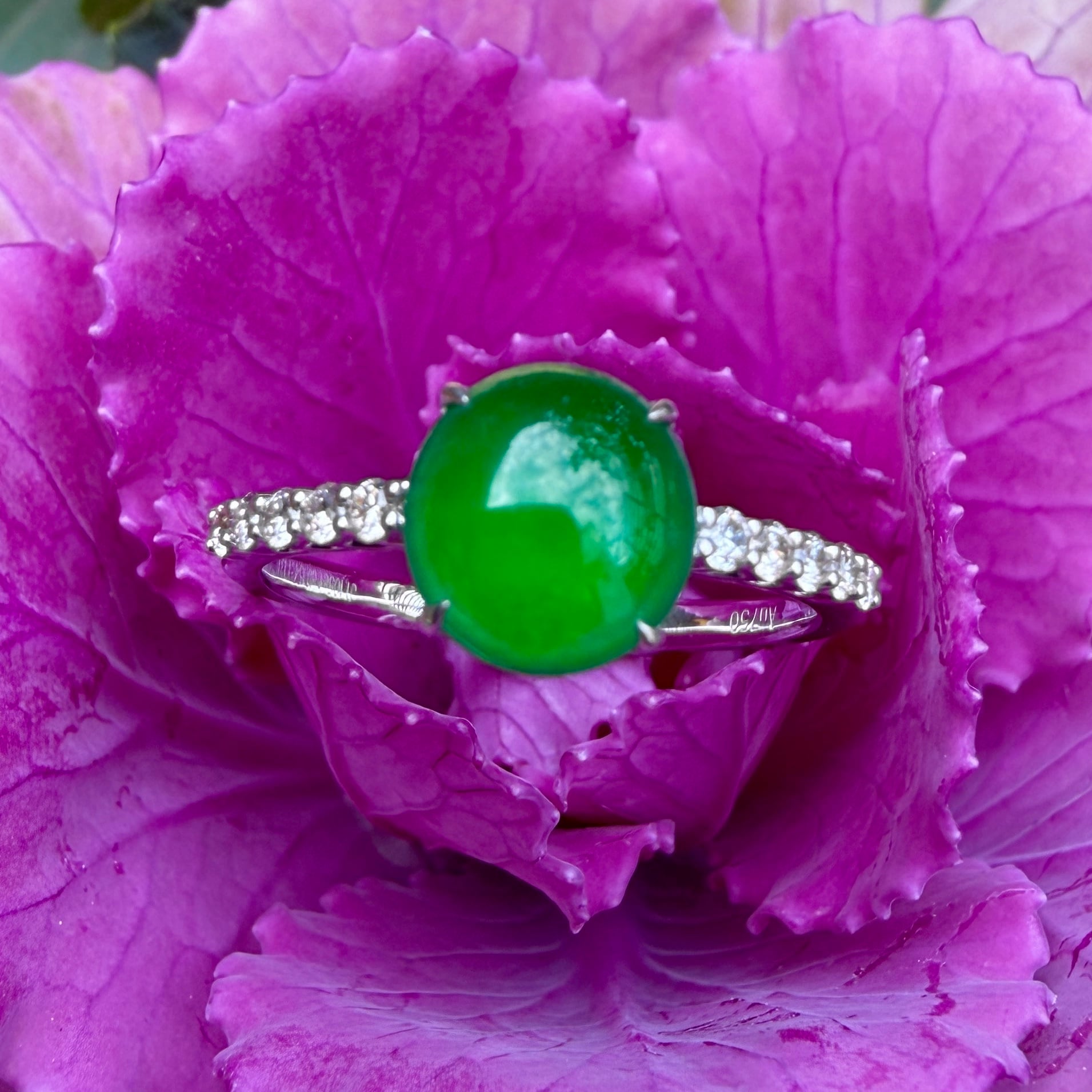 山椒は小粒でもピリリと辛い。この美しい緑の石を食べ物にして表現したかの様な美しい大粒の琅玕翡翠を使用した、特別なリングです。翡翠の中でも特に希少価値の高い「琅玕(ろうかん)」は、しっとりとした透明感と深い緑色が魅力の宝石です。その美しさは古来より「玉の中の玉」と称えられ、多くの人々の心を惹きつけてきました。 このリングには、堂々とした存在感を持つ大粒の琅玕翡翠がセットされており、手元を華やかに彩ります。翡翠は、金運や良縁の象徴ともされており、特別な日の贈り物やお守りジュエリーとしても最適です。 また、周囲には 良質なダイヤモンドがあしらわれ、さらに高級感を引き立てています。身に着けるときっと見つめてしまううちに時間が経ってしまう時間泥棒のリングです。