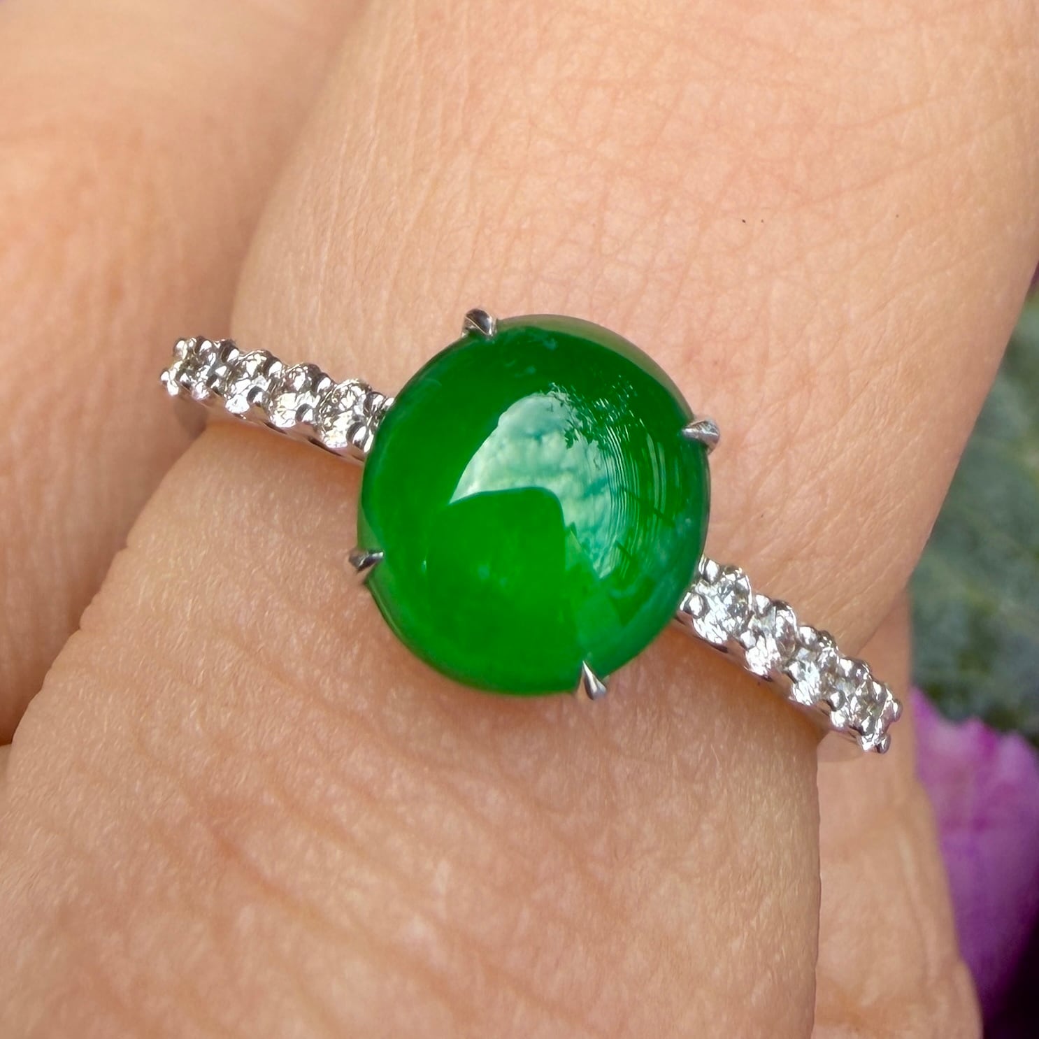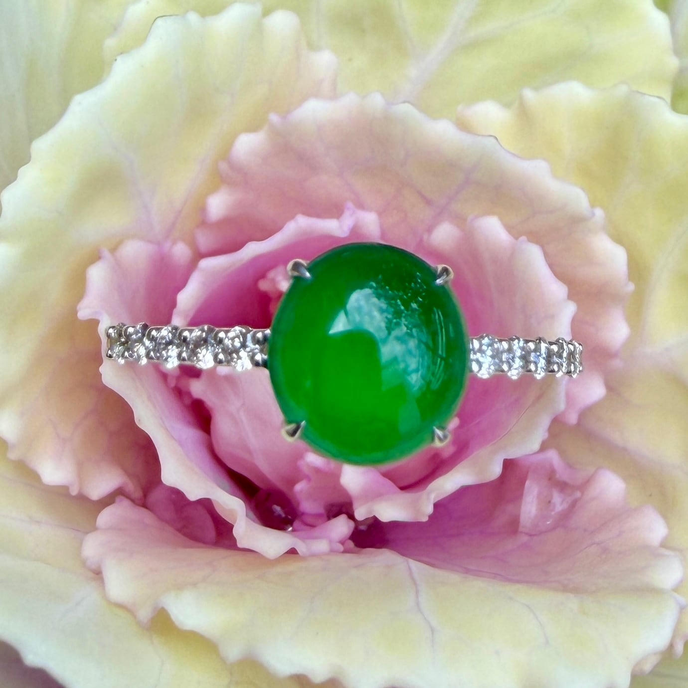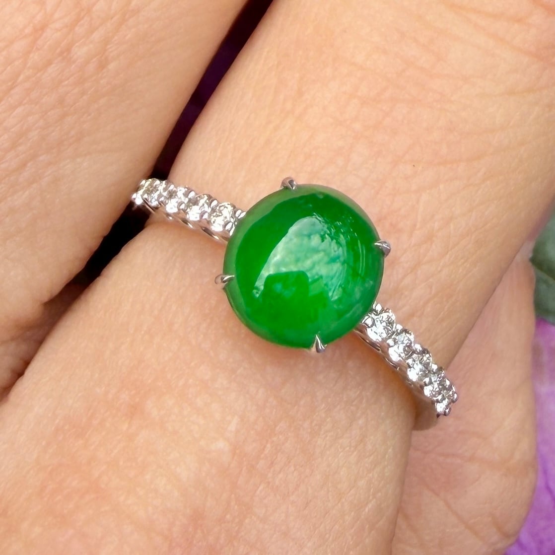 山椒は小粒でもピリリと辛い。この美しい緑の石を食べ物にして表現したかの様な美しい大粒の琅玕翡翠を使用した、特別なリングです。翡翠の中でも特に希少価値の高い「琅玕(ろうかん)」は、しっとりとした透明感と深い緑色が魅力の宝石です。その美しさは古来より「玉の中の玉」と称えられ、多くの人々の心を惹きつけてきました。 このリングには、堂々とした存在感を持つ大粒の琅玕翡翠がセットされており、手元を華やかに彩ります。翡翠は、金運や良縁の象徴ともされており、特別な日の贈り物やお守りジュエリーとしても最適です。 また、周囲には 良質なダイヤモンドがあしらわれ、さらに高級感を引き立てています。身に着けるときっと見つめてしまううちに時間が経ってしまう時間泥棒のリングです。