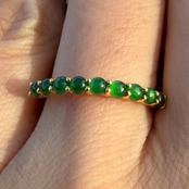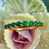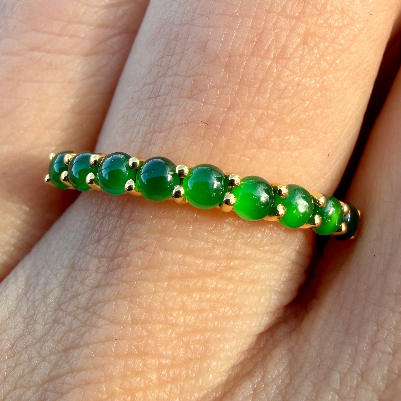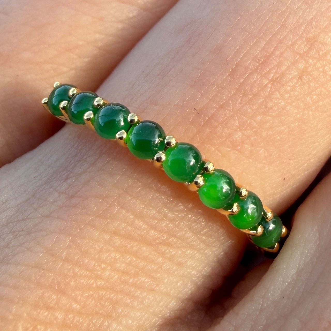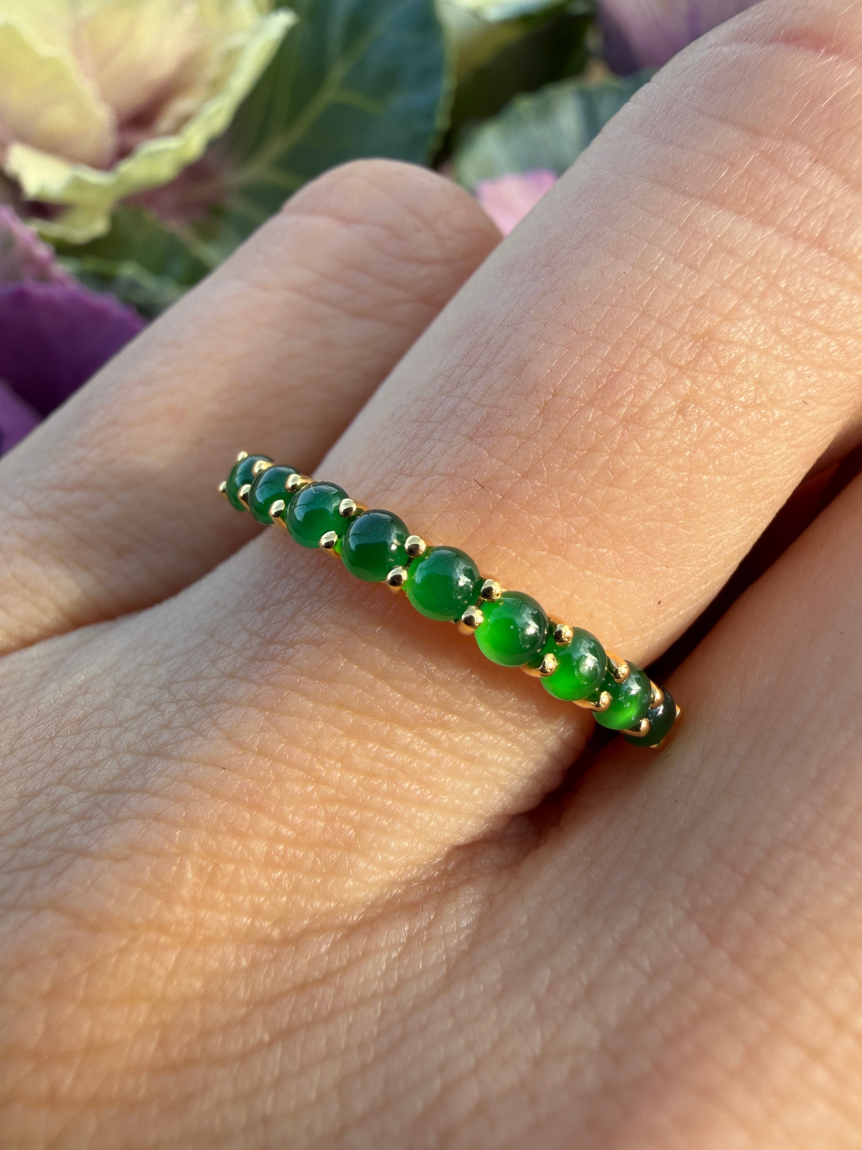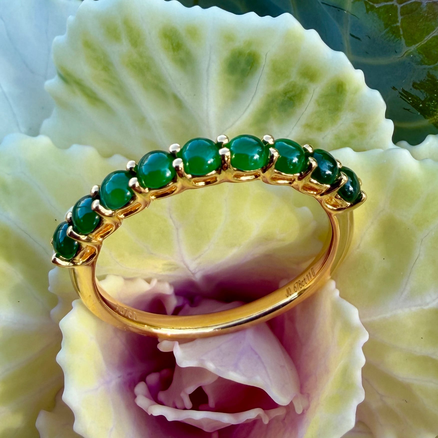 素晴らしい色が特徴の為、この様に小さく磨いても素晴らしい発色でまるで発光しているかの様な美しい緑色が特徴です。天然石でこの様なジュエリーを作る時の苦労はつぶの美しさと、形、色を揃える事。この作業だけであっという間に1日が終わってしまうくらい大変な作業です。そんな苦労を感じさせないくらいうるうるとした瑞々しい緑色のまさに粒よりの翡翠を18金イエローゴールドでリングに仕立ててあります。